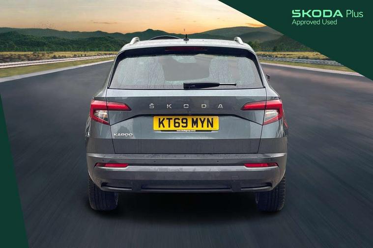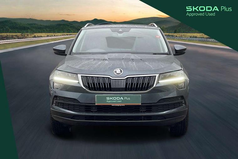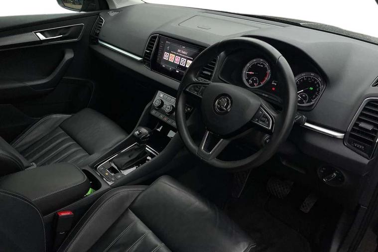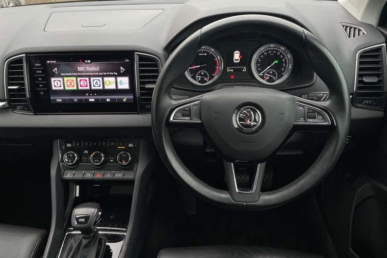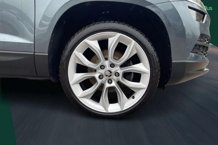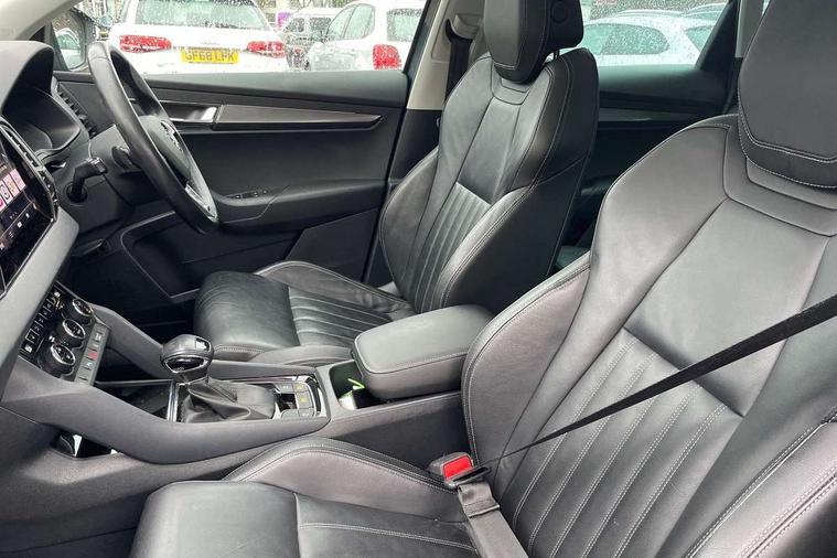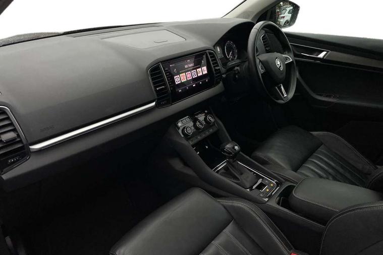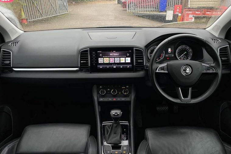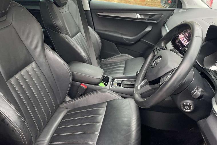 Columbus satellite navigation with 9.2" touchscreen display, integrated Wi-Fi, gesture control and WLAN, Drive mode selector, Driver alert system, Driver fatigue sensor, Driver profile selection, Multifunction colour trip computer, Outside temperature gauge, Rear cross traffic alert, Rear view camera, Service interval indicator, Start/stop system with regenerative braking, Traffic sign recognition, DAB radio with Bluetooth, SD card slot, USB connection, Acoustic glass, Aero front windscreen wipers with intermittent function, Automatic headlight control system, Black electric window control buttons, Body colour door mirrors and handles, Body coloured bumpers, Electric front and rear windows with child proof lock, Full LED headlights + adaptive front light system + LED daytime running lights and front cornering fog lights, Headlight washers, Heated rear windscreen, LED rear lights with high functionality, Light assistant (coming/leaving home/tunnel light), Panoramic sliding sunroof, Privacy glass, Safety reflectors on front doors, Third brake light, 1.5 litre bottle holders in driver and front passenger door panels, 12V socket in boot, 12v socket in front centre armrest with storage compartment and rear air vents, 2 Folding hooks and nets in boot, 2 Front readings lights for driver and passenger, 3 rear height adjustable headrests, 4 foldable roof handles with rear coat hooks, 4 lashing points on luggage floor, Backrest release, Cargo elements in boot, Chrome inner door handles, Dual zone climate control, Folding tables on the front seat backrests, Front seat and rear pockets, Height adjustable front three point seats belts with tensioners, Height adjustable passenger seat, Height/reach adjust steering wheel, Ice scraper, Illuminated and cooled glovebox, Illuminated luggage compartment, Isofix child seat preparation outer rear, Leather upholstery, Net programme in boot, Pen holder, Pollen filter, Rear boot cover, Rear reading lights, Rear seats fixed folding and divided 60:40, Removable LED torch in the boot, Retractable parcel shelf attachable to tailgate, Safety vest holder, Storage box in upper central dashboard closed, Storage compartment below the passenger seat, Sunvisors with illuminated vanity mirrors, Textile floor mats, Umbrella under passenger seat, VarioFlex seats with retractable parcel shelf, Chrome roof rails + chrome pack - Kodiaq, Electrically adjustable driver's seat with memory function pack - Karoq, LED Interior lighting pack with Skoda welcome logo - Karoq, Airbags - Front side, head, knee and curtain, Automatic door unlocking in case of crash, Automatic fuel cut off in case of crash, Driver airbag, Electronic parking brake with auto hold function, Emergency rear braking signal, ESC including ABS, MSR, ASR, EDS, HBA, DSR, RBS, MKB and traction control, Front assist radar scanning of the space in front of the car with automatic braking, Hill hold control, Passenger airbag with switch-off function, Pedestrian monitor, Seatbelt reminder signalisation and pretensioner for all seats, Three point seatbelts rear, Two tone horn, Tyre pressure display, Tyre pressure monitor, Alarm with interior monitoring, back up horn and tilt sensor with safe function, Electronic engine immobiliser, Keyless entry and keyless start with safe system, Remote central locking with 2 remote folding keys, Chrome framed air vents, 19" Crater silver alloy wheels with anti theft wheel bolts, Storage on wheel cover,