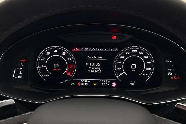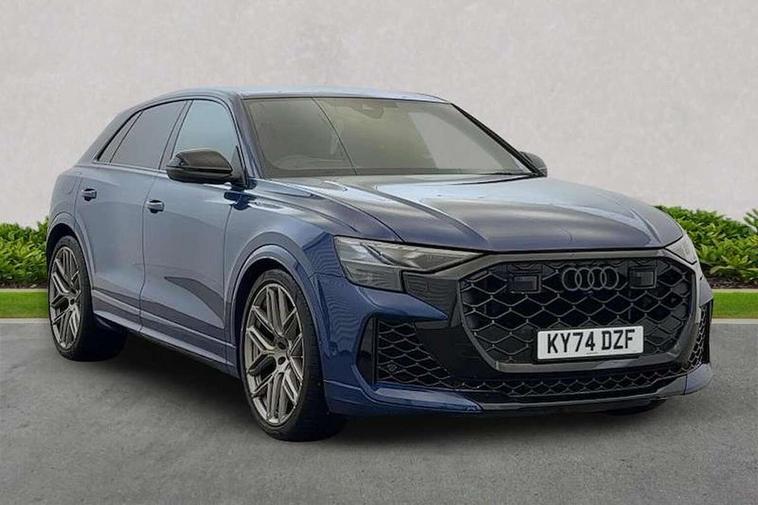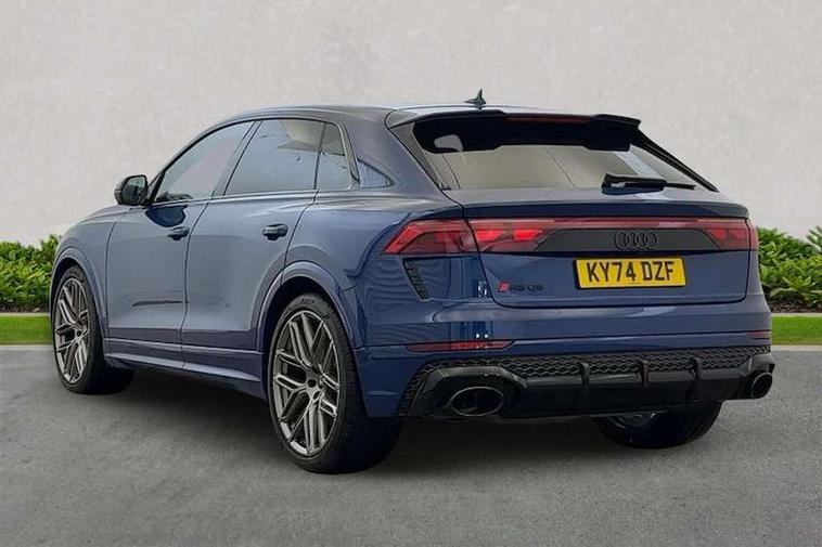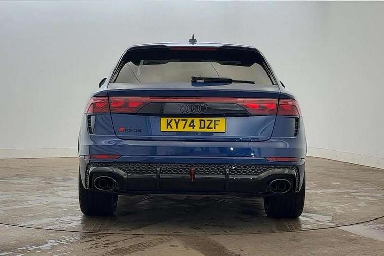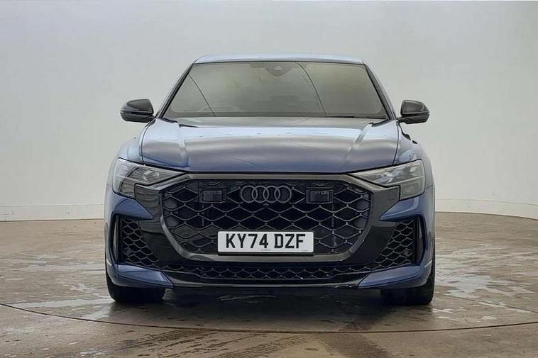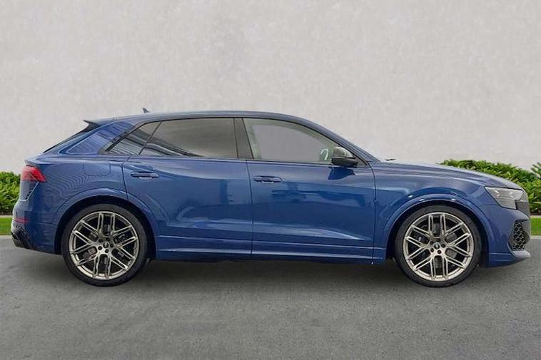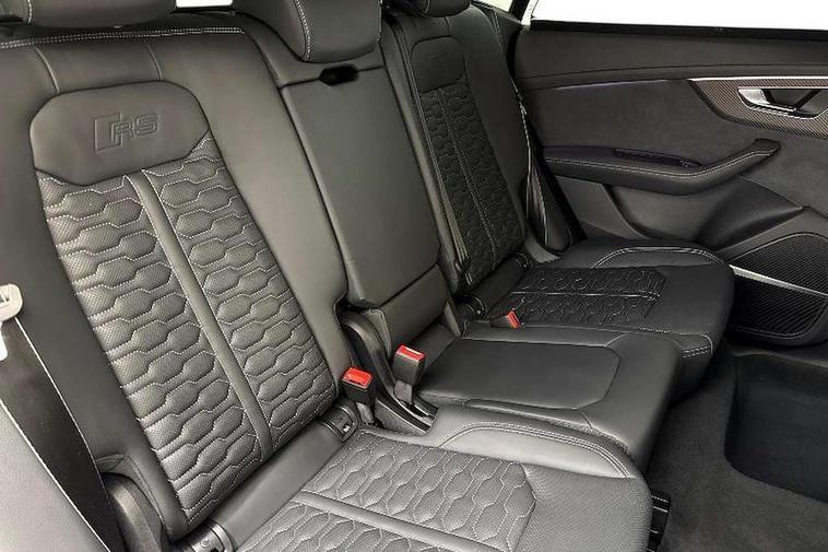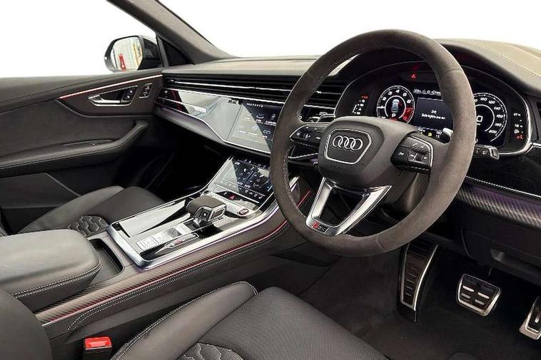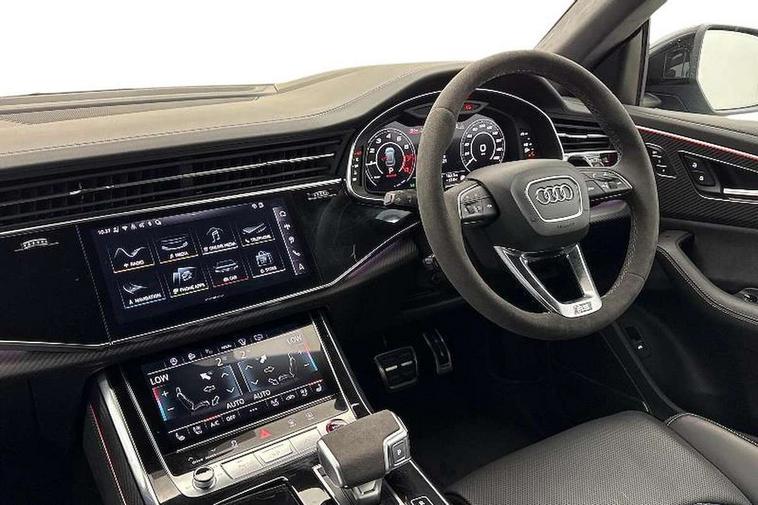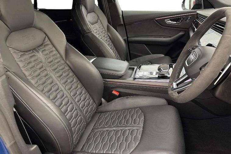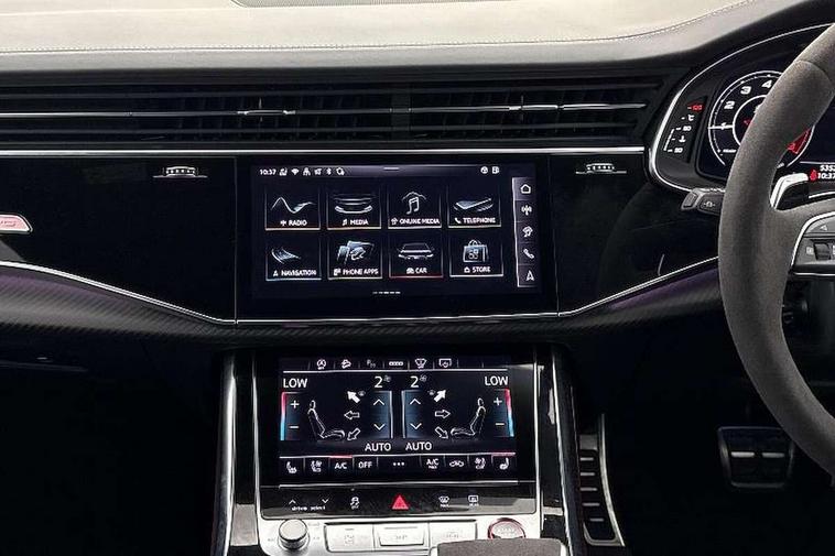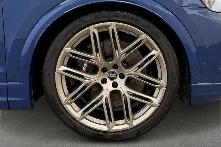 360 degree camera, All wheel steering, Audi active lane assist, Audi connect safety and service (e-call), Audi connect with Amazon Alexa Integration, Audi virtual cockpit - 12.3" high resolution LCD display with fully customisable instrument cluster and RS specific menus and options, Automatic start/stop system, Bluetooth interface, Convenience key, Electro-mechanical PAS, Emergency assist, Head up Display, Intersection assist, MMI navigation plus with MMI touch, Natural voice recognition, On board computer, Operating buttons in black, glass look with haptic feedback, Park assist with parking system plus including 360 degree display with front, rear and side parking sensor, Power latching doors, Power operated tailgate, Remote park assist plus, RS Audi drive select, Service interval indicator, Smartphone interface includes wireless Apple carplay/Android Auto, Speed limiter, 48V Mild hybrid technology, Electromechanical active roll stabilisation, Quattro all wheel drive with sport differential, RS specific Adaptive air suspension, Audi app store, Audi music interface - front 2 USB-C ports with charger and data functions, Aux-in socket, Bang & Olufsen 3D Premium Sound System with 17 speakers including centre speaker and subwoofer/ 16 channel amplifier with 730 watts sound output, DAB Digital radio, Audi HD Matrix LED headlights in RS specific design with Audi laser light, Auto dimming frameless rear view mirror, Black door mirrors, Digital OLED rear combination lamps, Electric front+rear windows, Electrically folding auto dimming/adjustable/heated door mirrors with memory function, LED side indicators and kerb view function for passenger side, Headlight washers, Heat insulating glass in windshield, Illuminated door sill trims with RS logo, LED 3rd brake light, LED entry lighting with RS projection in front and rear, LED signature daytime running lights, Preparation for trailer hitch, Privacy glass - dark tinted rear and rear side windows from B-pillar backwards, Rain and light sensors, Rear side wing doors, Rear wiper, RS badges on front wings, RS coming/leaving home animations in front and rear, RS manhattan grey front spoiler lip and rear diffuser insert, RS specific bumpers in full body colour paint finish, RS specific singleframe grille with honeycomb structure and large inserts, RS sport exhaust system with black exhaust tips, 3 bench rear seats in 2nd row, 3 spoke heated alcantara multi-function sport steering including paddle shift, 4 zone automatic climate control, 4-way lumbar support for front seats, 40:20:40 split folding rear bench seat, Audi phone box light, Black dinamica headlining, Comfort front centre armrest, Double sun visor with illuminated vanity mirror on driver and passenger side extendable, Driver and front passenger seat memory function for electrically adjustable front seats, Electric adjustable steering column with memory functionality, Electric sunblind for the rear side windows and manual sunblind for the rear window, Front head restraints, Heated front seats, Heated rear seats, ISOFIX child seat mounting for front passenger seat and 2 outer rear seats with top tether child seat mounting for all 3 rear seats, Massage and ventilation function for front seats, Net partition, Perforated Valcona leather upholstery + RS front super sports seats + honeycomb pattern with RS embossed logo, Premium air quality system with air ionizer and aromatization, Rear headrests, Seat cushion, Single front passenger seat, Stainless steel pedals, USB port with charge function in the front and rear seats, Black styling pack plus - RS Q8, City assist pack - Q8, Multi-coloured extended LED interior lighting pack - RS Q8, RS grey design pack - RS Q8, RS specific styling pack - RS Q8, Tour pack when bought with City assist pack- RS Q8, 3 point seatbelts on all seats, Audi pre sense front, Child locks on rear doors, Driver and front passenger, front side and curtain airbags, Electromechanical parking brake, Electronic Stability Control (ESC) including ABS, ASR and EDL, Front passenger airbag deactivation, Hill descent control, Hill hold assist, Predictive pedestrian protection, RS steel brakes and black brake callipers with RS logo, Seatbelt monitoring, Tyre pressure loss indicator, Warning triangle and first aid kit, Anti theft alarm with tow away protection, Anti-theft wheel bolts and wheel loosening detection, Immobiliser, Matte carbon twill inlays, 23" x 10.5J 6 Y twin spoke design Audi Sport alloy wheels in matt neodymium gold, Performance SUV tires by Pirelli, Tool kit, Tyre repair kit,