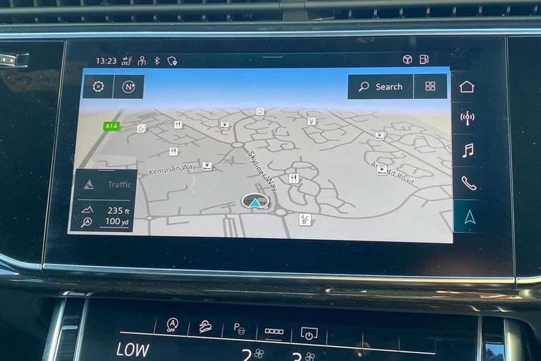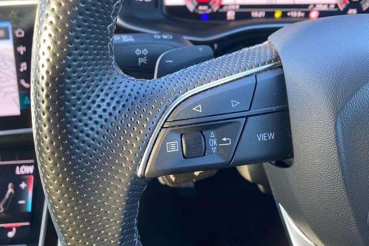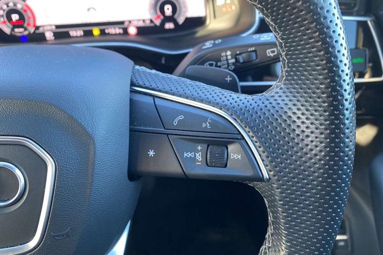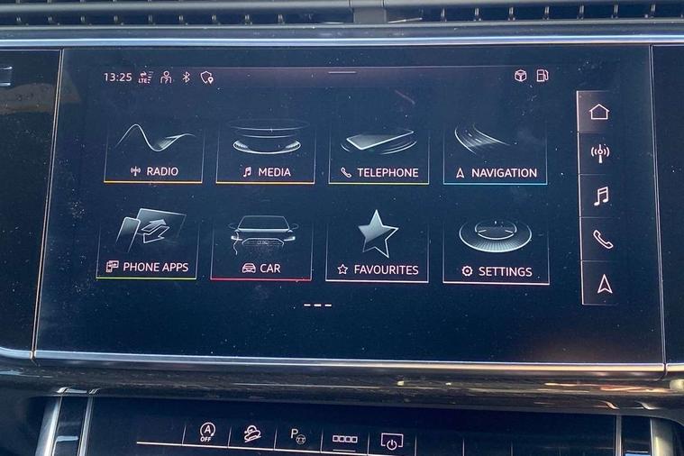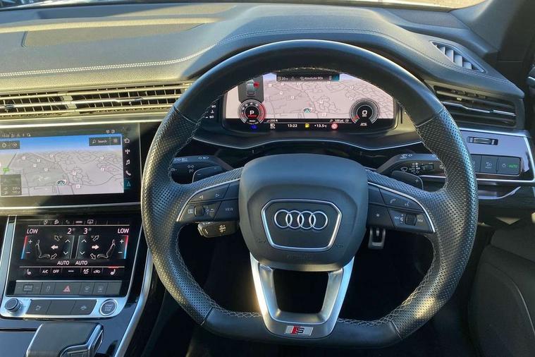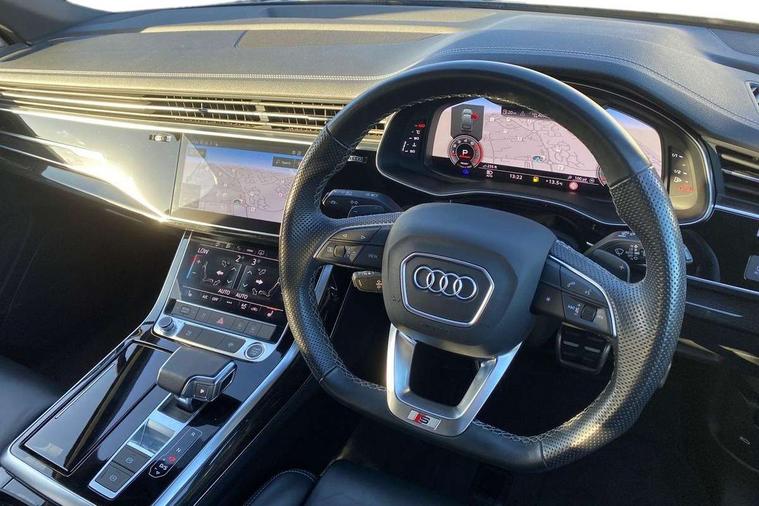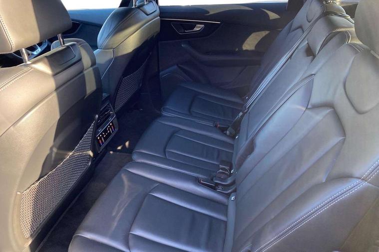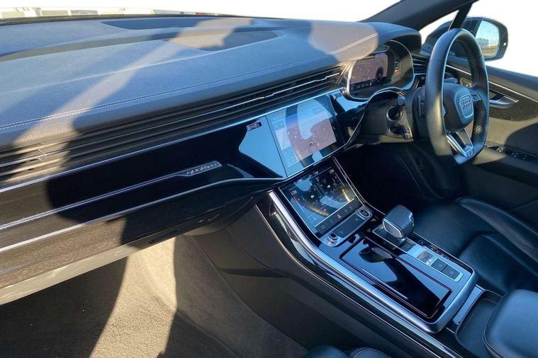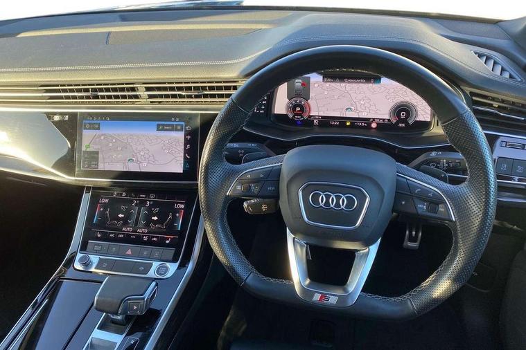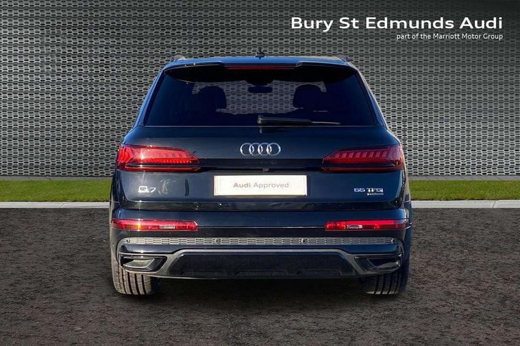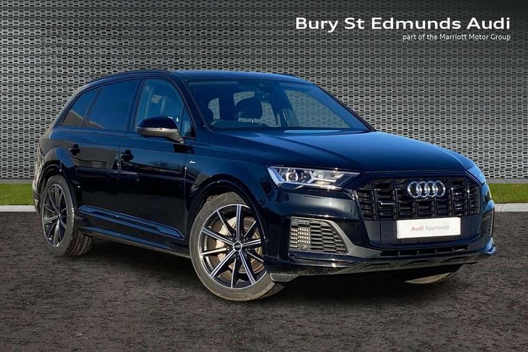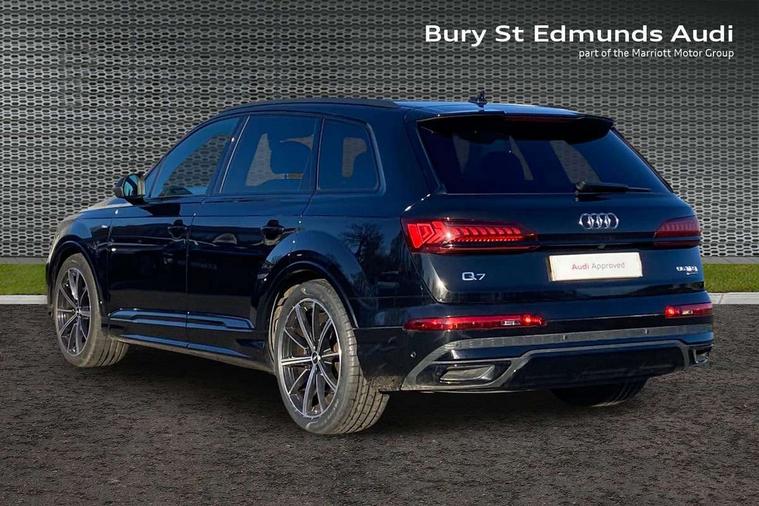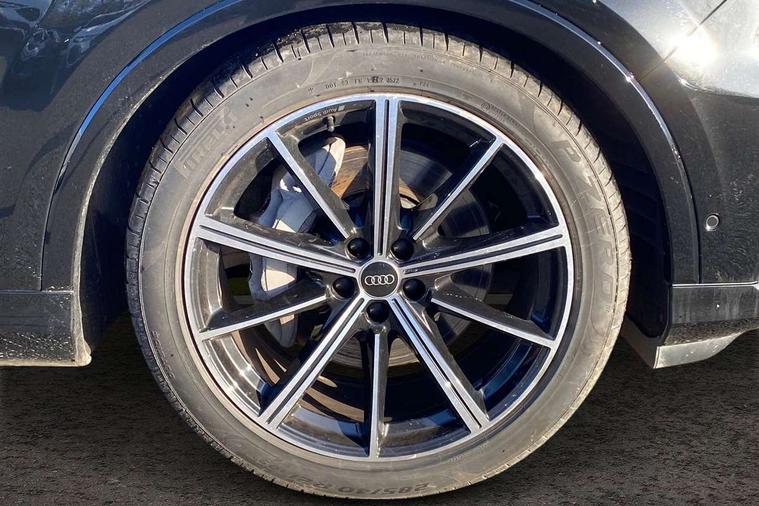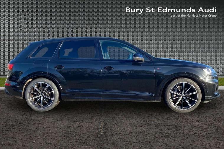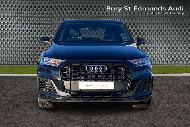 Audi connect safety and service (e-call), Audi connect with Amazon Alexa Integration, Audi drive select (Auto, Comfort, Dynamic, Efficiency, Individual, Off-road and All road), Audi phone box light with wireless charging, Audi virtual cockpit - 12.3" high-resolution LCD display with fully customisable instrument cluster, Bluetooth interface, Camera based traffic sign recognition, Electromechanical steering, MMI navigation plus with MMI touch screens includes 10.1" and 8.6" screens with haptic feedback, Natural voice recognition, Power operated tailgate, Smartphone interface includes wireless Apple carplay/Android Auto, Start/stop system, 48V Mild hybrid technology, 85 litre fuel tank, Adaptive air sports suspension, Quattro all wheel drive with self locking centre differential, Audi music interface - front 2 USB-C ports with charger and data functions, DAB digital radio module, 3rd brake light, Aluminium window trim, Audi Beam uses LEDs to project S emblem with red rhombus onto the ground when opening the side doors (front/rear), Auto dimming frameless rear view mirror, Black roof rails, Bumpers in contrast paint scandium grey finish includes door trim and wheel arch trim strips, inlays in door strip contain quattro embossing, Dark tinted Matrix LED headlights with dynamic front and rear indicators, Electrically adj heated/folding + automatically dimming exterior mirrors with memory + automatic kerb side function for passenger side exterior mirror, Heat insulating glass in windshield, Integrated LED indications in door mirrors, LED daytime running lights, LED rear tail lights, Privacy glass - dark tinted rear and rear side windows from B-pillar backwards, Rear side wing doors, Rear wiper, 2 seat bench in 3rd row, 3 seat bench in 2nd row, 7 seat layout with ISOFIX points for the front passenger seat and rear passenger seat, Black cloth headlining, Comfort front centre armrest, Electric adjustable front seat with 4 way lumbar support, driver memory functionality, Folding rear seats, Front head restraints, Front/rear floor mats, Heated front seats, Illuminated door sill trims with S logo, Luggage compartment sill protection in stainless steel, Rear head restraints, Single front passenger seat, Stainless steel pedals, Sunvisors with illuminated vanity mirrors, Black styling pack plus - Q7, Technology Pack Pro - Q7, 3 point seatbelts on all rear seats, Audi pre sense front, Child locks on rear doors, Driver and front passenger, front side and curtain airbags, Electromechanical parking brake, Electronic Stabilisation Control (ESC) including ABS, ASR and EDL, Extended pedestrian protection measures, Hill hold assist, Seatbelt monitoring, Tyre pressure loss indicator, Warning triangle and first aid kit, Anti theft alarm, Anti-theft wheel bolts and wheel loosening detection, Remote central locking, Polished oak trim with grey finish inlay, Tool kit, Tyre repair kit,