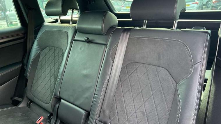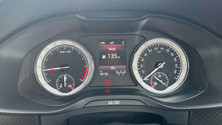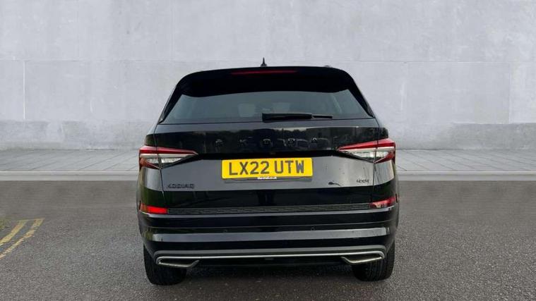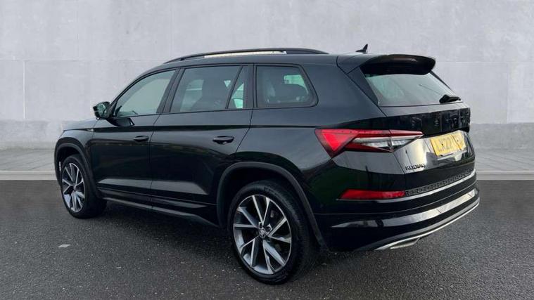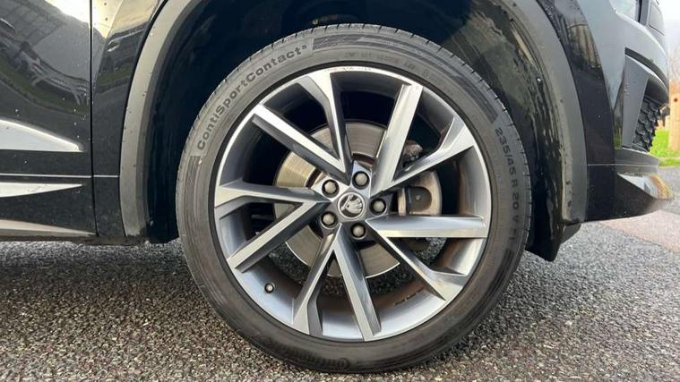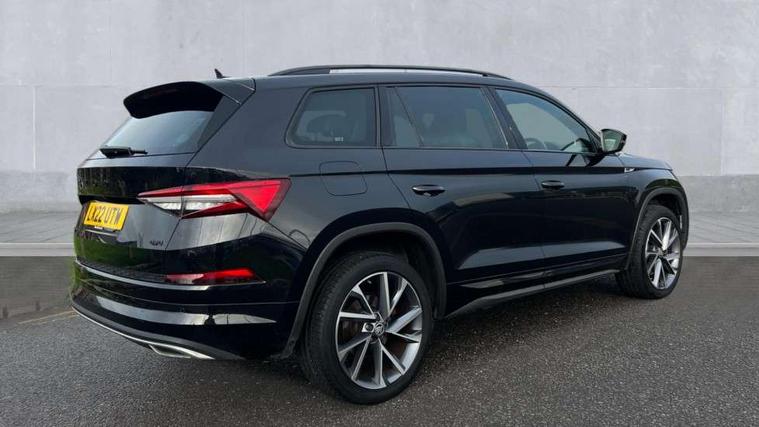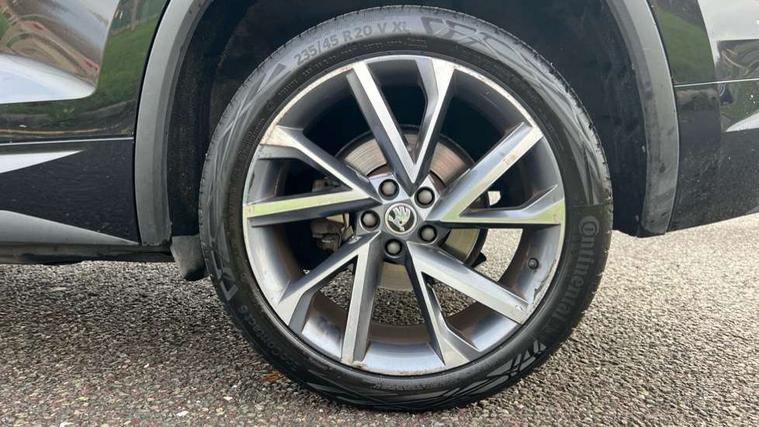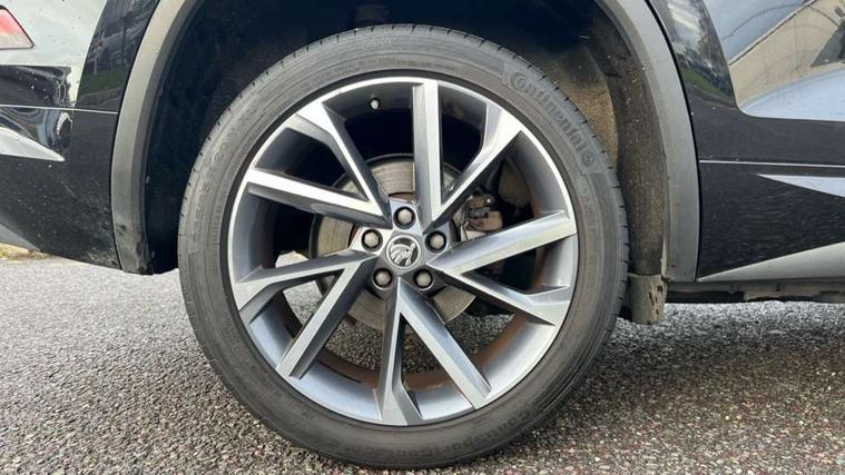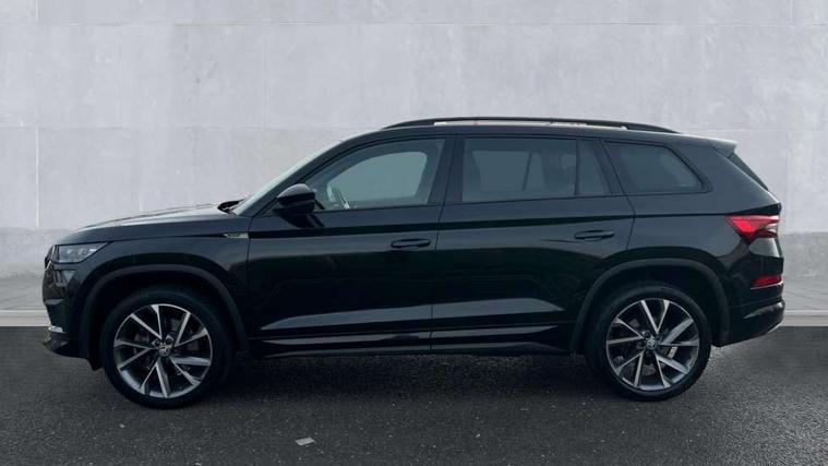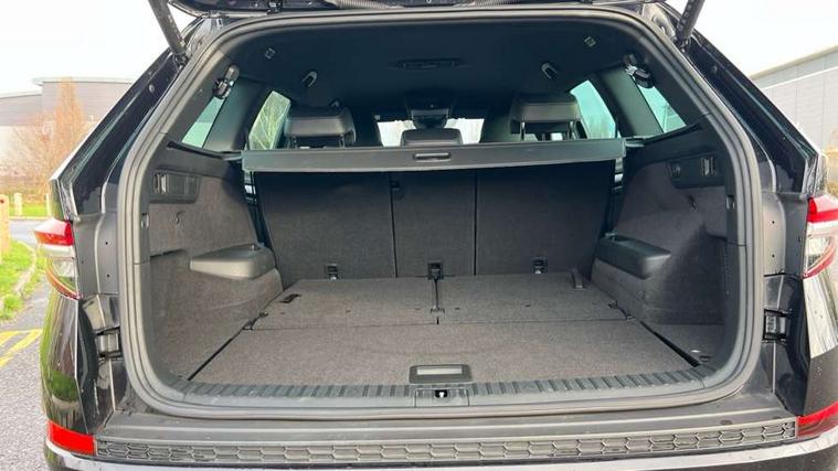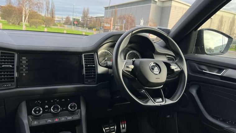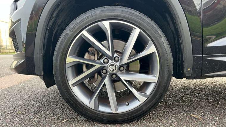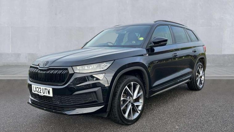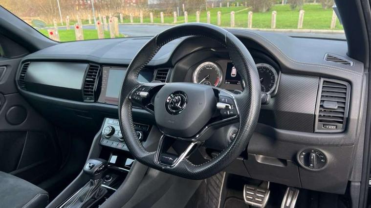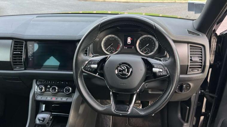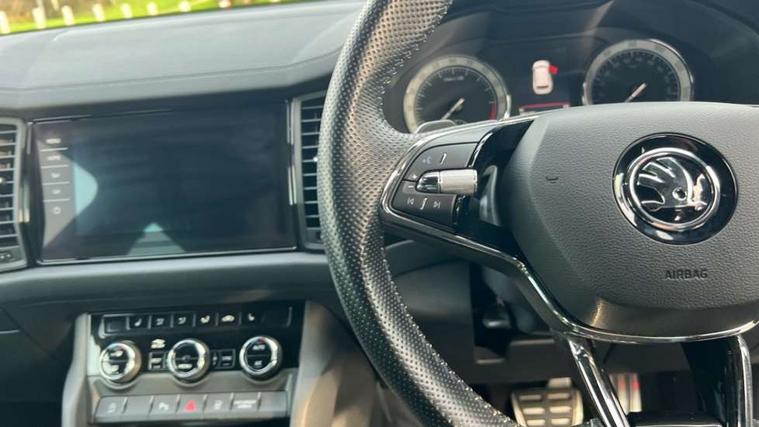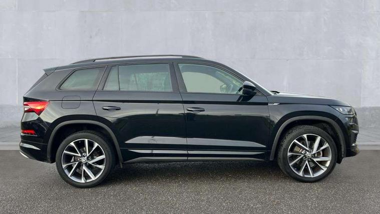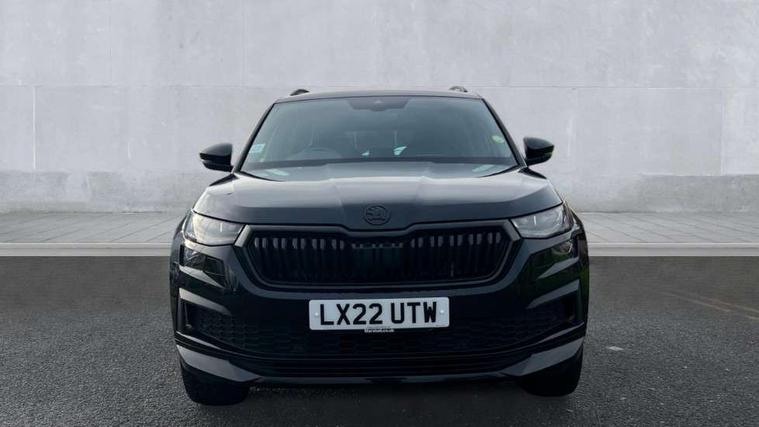 Bluetooth system, Columbus satellite navigation with 9.2" touchscreen, integrated Wi-Fi, web radio, E-call, ECO Stop/start function, Exterior temperature indicator, Progressive steering, Rear view camera, Smartlink wireless for apple carplay and wired for android auto, Speed limiter, Tailgate unlocking from outside, USB C Port x 2 in front centre console, Wireless charging, 8 Speakers, DAB Digital radio, Aero front windscreen wipers with intermittent function, Aero rear window wiper, Auto dimming rear view mirror, Black roof rails, Black sports styling including front grille and window surrounds, Black wheel arch surrounds, Body colour bumpers, Body colour door handles, Electric adjustable/heated/folding door mirrors, driver side auto dimming with boarding sports and memory function, Electric front and rear windows, Extended rear spoiler with finlets in gloss black, Front fog lights, Full LED matrix headlights with AFS (adaptive front light system), cornering function and AWL (all weather lighting system), Gloss black door mirrors, Headlight washers, Heated rear window, Invisible tailpipe, LED daytime running lights, LED rear fog light, LED third brake light in rear spoiler, Light assistant (coming/leaving home/tunnel light), Off-road style lower front bumper element, Privacy glass, Rain and light sensors, Rear diffuser, Rear LED lights (high functionality) with welcome effect and dynamic indicators, Rear side wing doors, Safety reflectors on front and rear doors, Sportline badge on front fender, Sports front and rear bumpers including lower rear chrome strip, Tailgate lettering in Black, Window control switches with black trim, Without engine designation, 12V socket in boot, 2 rails with 2 hooks, 2 seat bench in 3rd row, 3 seat bench in 2nd row, 4 foldable roof handles with rear coat hooks, 60:40 foldable rear seat with sliding adjustment and backrest angle adjustment, Aluminium pedals, Black roof headlining, Bottle holders in door panel in the 1.5 litre front and 1 litre rear, Cargo storage compartments, Chrome headlight control button, Chrome interior door handles, Coat hooks on B pillar, Covered storage compartment on driver side, Decorative door sills in the front and rear, Front centre armrest with storage compartment, cup holder and 12V socket, Front courtesy lights, Gear shift lever with chrome frame and black gloss insert, Grey stitching in front and rear armrests and door armrests + door inserts, Height adjustable front headrests, Illuminated and cooled glovebox, Illuminated luggage compartment, Isofix child seat fittings in outer rear seats with top tether, Manually adjustable steering column, Microsuede door panels, Net programme in boot (1x horizontal Net, 2x vertical Nets), Overhead glasses storage compartment, Pollen filter, Rear centre armrest with cupholders, Single front passenger seat, Sliding trunk cover, Small Bags on the inner sides of the front backrests, Sports seats, Sunvisors with illuminated vanity mirrors, Three rear height adjustable headrests, Ticket holder on A Pillar, Umbrella in door panel, Variable boot floor, LED Interior light pack - Kodiaq, Auto door release and activation of warning lights in the event of an accident, Child locks on rear doors, Driver and front passenger airbag with knee airbag and front passenger airbag deactivation, Electronic parking brake with hill start assist, Emergency rear braking signal, ESC (incl. ABS+MSR+ASR+EDS+HBA+DSR+RBS+MKB), Front assist with autonomous emergency braking, Front side airbags with curtain airbags, Fuel cut off safety device, Height adjustable front 3 point seatbelts + pretensioners, Hill hold control, Rear disc brakes, Safety vest holder in door, Seat belt reminder for all seats, Three point rear seat belts, Two tone horn, Tyre pressure monitor, Alarm with interior monitoring and tilt sensor with safe function, Anti-theft wheel bolts, Immobiliser, Keyless entry and start system (KESSY), Remote central locking with 2 keys, Black air vent surround, Carbon finish dashboard and door inserts, Grey stitching in dashboard, 20" Vega Anthracite alloy wheels, Temporary spare wheel (space saver),