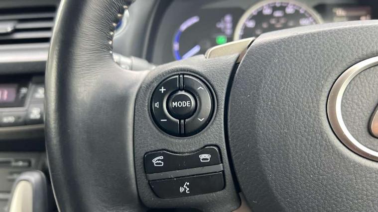 7" colour screen, Adaptive cruise control, Bluetooth telephone connectivity, Drive mode selector, Front and rear parking sensors, Lexus Navigaton System, Push button starter, Reversing camera, Speed sensitive power steering, Traffic sign recognition, Trip computer, Vehicle Dynamics Integrated Management, Vehicle Stability Control (VSC), 6 speakers, Auxiliary input socket, DAB Digital radio, Radio/CD + MP3, Steering wheel audio controls, USB connection, Adaptive rear spoiler, Auto high beam, Black scuff plates, Body colour bumpers, Door mirror puddle lights, Electric adjustable door mirrors, Electric folding door mirrors, Front and rear electric windows, Front fog lights, Green tinted UV reducing windscreen glass, Heated door mirrors, LED brake lights, LED daytime running lights, LED tail lights, Privacy glass (rear side windows and rear screen), Rain sensor windscreen wipers, Rear diffuser, Rear wiper, Shark fin roof aerial, 2 cupholders in front centre console, 4 load securing hooks in luggage area, 5 headrests, 60/40 split folding rear seat, Carpet mats, Centre arm rests, Driver/passenger sunvisors with illuminated vanity mirrors, Dual zone climate control, Fabric/Tahara leather upholstery, Front door pockets, Heated front seats, Illuminated entry system, Isofix child seat attachment, Leather steering wheel, Manually adjustable front seats - 6 way driver/4 way passenger, Map pocket on front seat backs, Rear armrest, Rear coat hook, Storage compartment in centre console, Storage compartment under load area floor, Tilt/telescopic adjustable steering wheel, ABS, Brake assist function, Curtain shield airbag, Driver and passenger side airbags, Drivers knee airbag, Dual stage driver/passenger airbags, Electronic brake force distribution, Front seatbelt pretensioner, Hill start assist control (HAC), Passenger airbag cut-off device, Passenger knee airbag, Pre crash system, Seatbelt warning, Sway warning system, Three 3 point rear seatbelts, Traction control, Tyre pressure warning, WHIPS whiplash protection system - front, Anti theft system, Double locking, Immobiliser, Intrusion sensor and alarm, Locking wheel nuts, Remote central locking, Smart entry + Smart start, Speed sensitive power door locks, VIN Window etching, Space saver spare wheel,
