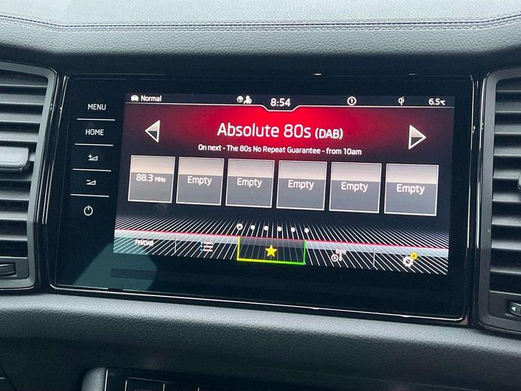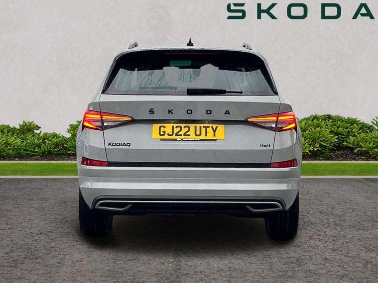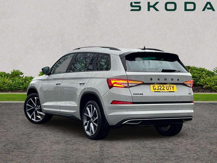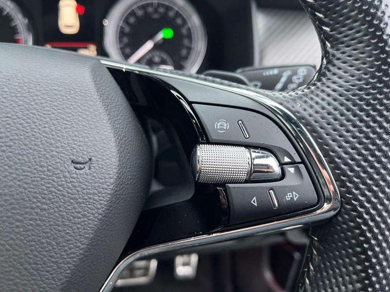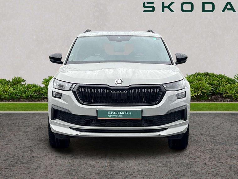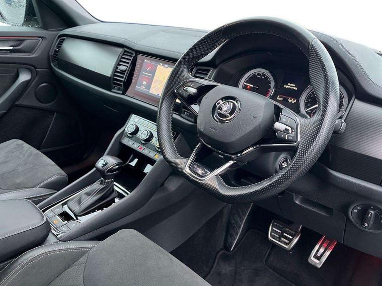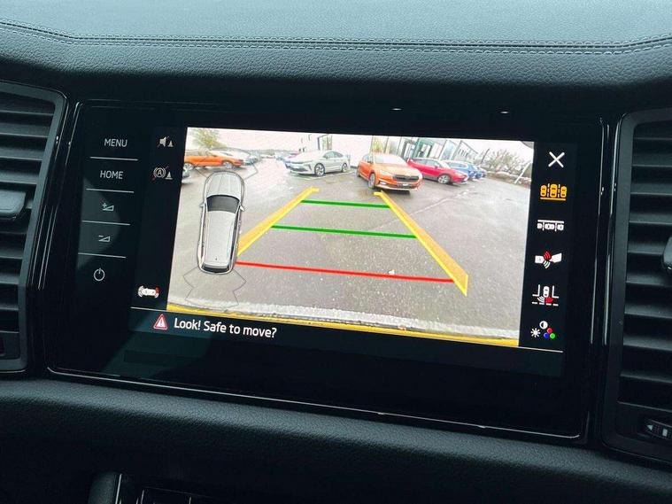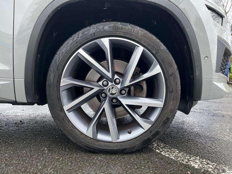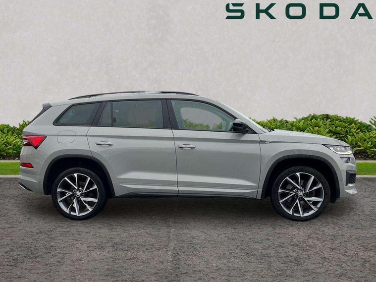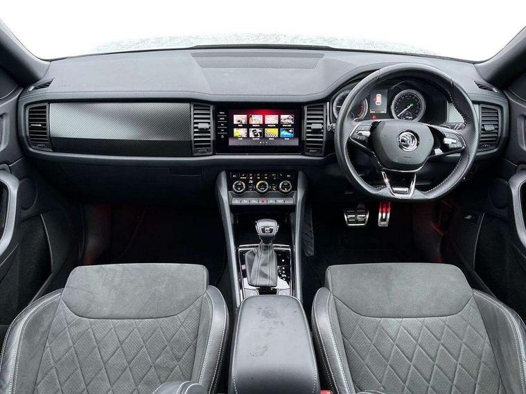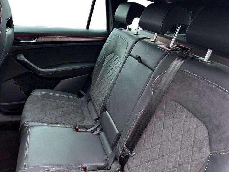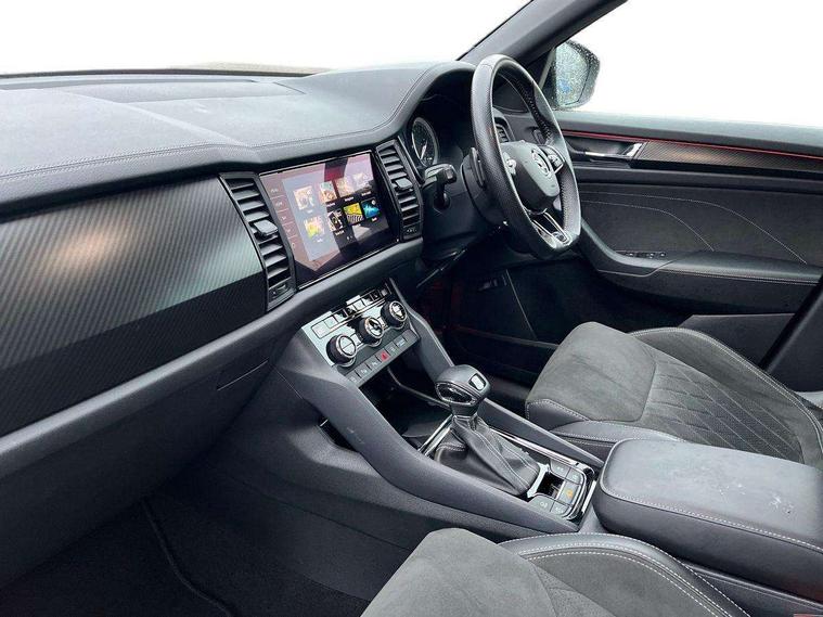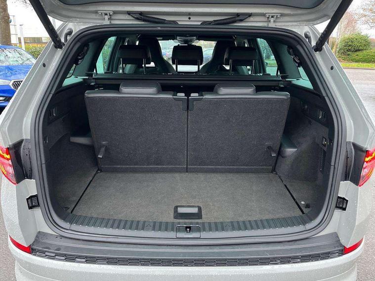 Bluetooth system, Columbus satellite navigation with 9.2" touchscreen, integrated Wi-Fi, web radio, Digital voice enhancement, E-call, ECO Stop/start function, Exterior temperature indicator, Progressive steering, Rear view camera, Smartlink wireless for apple carplay and wired for android auto, Speed limiter, Tailgate unlocking from outside, USB C Port x 2 in front centre console, Wireless charging, 8 Speakers, DAB Digital radio, Aero front windscreen wipers with intermittent function, Aero rear window wiper, Auto dimming rear view mirror, Black roof rails, Black sports styling including front grille and window surrounds, Black wheel arch surrounds, Body colour bumpers, Body colour door handles, Electric adjustable/heated/folding door mirrors, driver side auto dimming with boarding sports and memory function, Electric front and rear windows, Extended rear spoiler with finlets in gloss black, Front fog lights, Full LED matrix headlights with AFS (adaptive front light system), cornering function and AWL (all weather lighting system), Gloss black door mirrors, Headlight washers, Heated rear window, Invisible tailpipe, LED daytime running lights, LED rear fog light, LED third brake light in rear spoiler, Light assistant (coming/leaving home/tunnel light), Off-road style lower front bumper element, Privacy glass, Rain and light sensors, Rear diffuser, Rear LED lights (high functionality) with welcome effect and dynamic indicators, Rear side wing doors, Safety reflectors on front and rear doors, Sportline badge on front fender, Sports front and rear bumpers including lower rear chrome strip, Tailgate lettering in Black, Window control switches with black trim, Without engine designation, 12V socket in boot, 2 rails with 2 hooks, 2 seat bench in 3rd row, 3 seat bench in 2nd row, 4 foldable roof handles with rear coat hooks, 60:40 foldable rear seat with sliding adjustment and backrest angle adjustment, Aluminium pedals, Black roof headlining, Bottle holders in door panel in the 1.5 litre front and 1 litre rear, Cargo storage compartments, Chrome headlight control button, Chrome interior door handles, Coat hooks on B pillar, Covered storage compartment on driver side, Front centre armrest with storage compartment, cup holder and 12V socket, Front courtesy lights, Gear shift lever with chrome frame and black gloss insert, Grey stitching in front and rear armrests and door armrests + door inserts, Height adjustable front headrests, Illuminated and cooled glovebox, Illuminated luggage compartment, Isofix child seat fittings in outer rear seats with top tether, Manually adjustable steering column, Microsuede door panels, Net programme in boot (1x horizontal Net, 2x vertical Nets), Overhead glasses storage compartment, Pollen filter, Rear centre armrest with cupholders, Single front passenger seat, Sliding trunk cover, Small Bags on the inner sides of the front backrests, Sports seats, Sunvisors with illuminated vanity mirrors, Three rear height adjustable headrests, Ticket holder on A Pillar, Umbrella in door panel, Variable boot floor, LED Interior light pack - Kodiaq, Auto door release and activation of warning lights in the event of an accident, Child locks on rear doors, Driver and front passenger airbag with knee airbag and front passenger airbag deactivation, Electronic parking brake with hill start assist, Emergency rear braking signal, ESC (incl. ABS+MSR+ASR+EDS+HBA+DSR+RBS+MKB), Front assist with autonomous emergency braking, Front side airbags with curtain airbags, Fuel cut off safety device, Height adjustable front 3 point seatbelts + pretensioners, Hill hold control, Rear disc brakes, Safety vest holder in door, Seat belt reminder for all seats, Three point rear seat belts, Two tone horn, Tyre pressure monitor, Alarm with interior monitoring and tilt sensor with safe function, Anti-theft wheel bolts, Immobiliser, Keyless entry and start system (KESSY), Remote central locking with 2 keys, Black air vent surround, Carbon finish dashboard and door inserts, Grey stitching in dashboard, 20" Vega Anthracite alloy wheels, Temporary spare wheel (space saver),