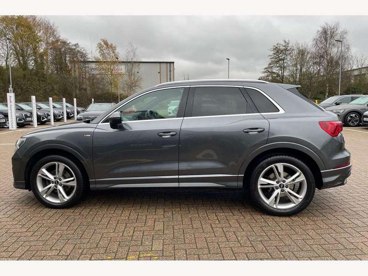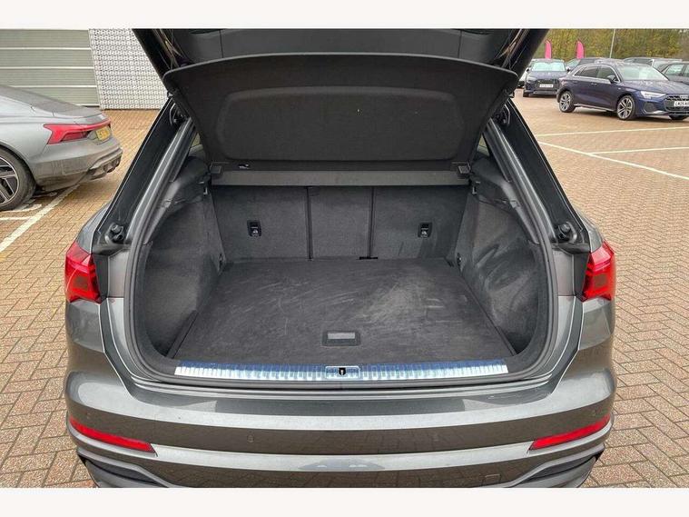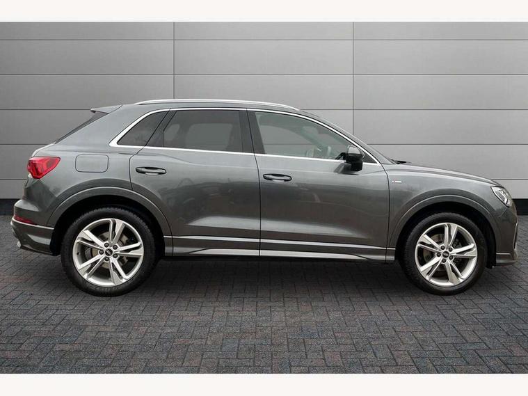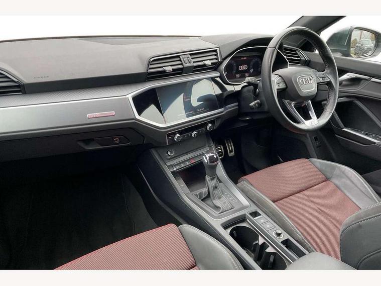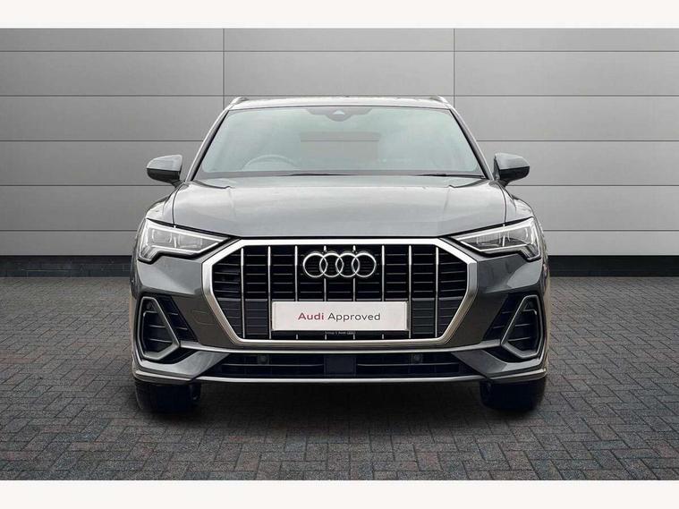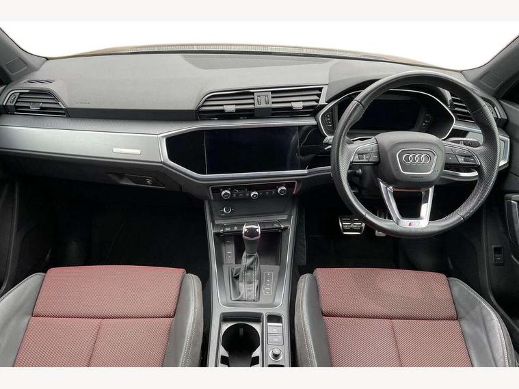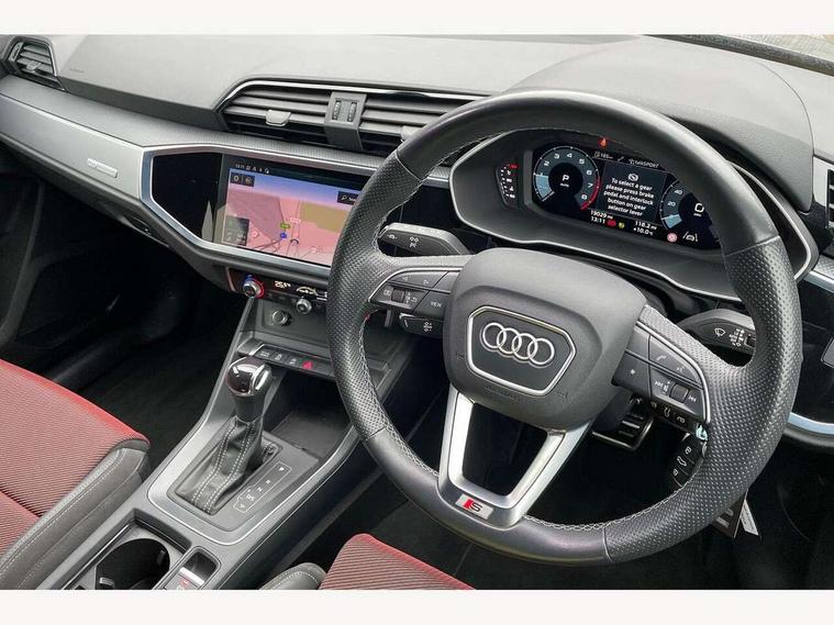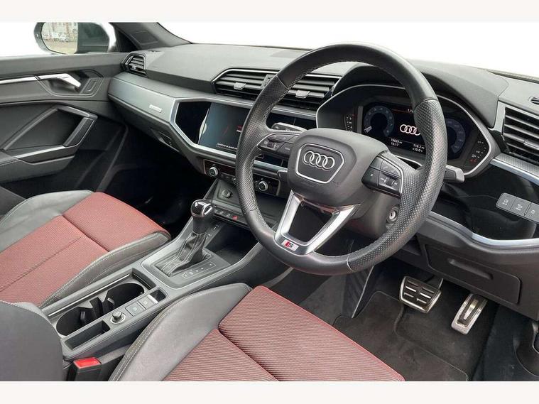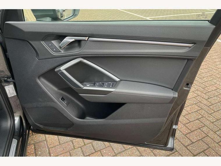 Amazon alexa Integration, Audi connect safety and service (e-call), Audi drive select, Audi lane departure warning, Audi Virtual Cockpit - 10.25" display, Bluetooth interface, Camera based traffic sign recognition, MMI Navigation Plus with high resolution 10.1 inch touchscreen colour display, Power operated tailgate, Progressive steering, Service interval indicator, Smartphone interface includes wireless Apple carplay/Android Auto, Start stop system with recuperation, Voice control system with natural language interaction, 48V Mild hybrid technology, Sports suspension, 2 USB-C ports with charge and data functions, 6 passive loudspeakers, DAB digital radio module, Acoustic windscreen, Aluminium roof rails, Aluminium window trim, Auto dimming frameless rear view mirror, Body coloured bumpers, Electrically folding, adjustable and heated door mirrors with integrated LED side indicators and kerb view function for passenger side, Front and rear electric windows, Front fog lights, Front side air inlets in matt platinum grey, Front spoiler blade in matt platinum grey, Grille vertical bars in aluminium silver/Matt, High gloss black finish B and C pillars, LED headlights with LED daytime running lights and dynamic rear indicator, LED rear lights, Privacy glass dark tinted rear and rear-side windows (from B-pillar backwards), Rain and light sensors, Rear diffuser strip in matt titanium black, S line badges on front wings, S Line front and rear bumpers, Side skirt insert in matt Platinium grey, Silver chrome grille surround, Titanium black radiator grille, 12V socket in rear centre console, 40:20:40 folding with manual adjustment for 60:40 forwards/backwards position and backrest angle, Adjustable rear seat bench/backrest with centre armrest and cupholder, Black cloth headlining, Dual zone electronic climate control, Front and rear black floor mats with contrast stitching in rock grey, Front and rear headrests, Front and rear roof module including reading lights, Front centre armrest, Glove compartment lighting, Height and reach adjustable steering wheel, Illuminated door sill trims with S logo, ISOFIX child seat mounting for front passenger with airbag deactivation and outer rear seat including top tether attachment point for outer rear seats, Luggage compartment light, Manual front seats with height adjustment, Perforated leather gearknob, Stainless steel luggage compartment sill finisher, Stainless steel pedals, Non smoking pack - Q3, 3x3 point rear seatbelts, 6 airbags - Driver, front passenger, curtain and side windows, Audi pre-sense front with pedestrain and cyclist recognition, Electrically operated child locks on rear doors, Electromechanical parking brake, Electronic stabilisation control including ABS, ASR and EDL, Hill descent control, Hill hold assist, Pre sense basic, Seatbelt monitoring, Tyre pressure warning, Warning triangle and first aid kit, Anti theft alarm, Anti theft wheel bolts, Remote central locking, Dark matt brushed aluminium inlay, Detail dashboard around MMI touch colour display in glass look, black with surround in aluminium look, Leatherette door armrest, Tool kit, Tyre repair kit,
