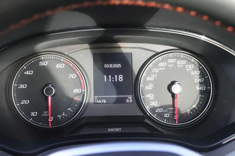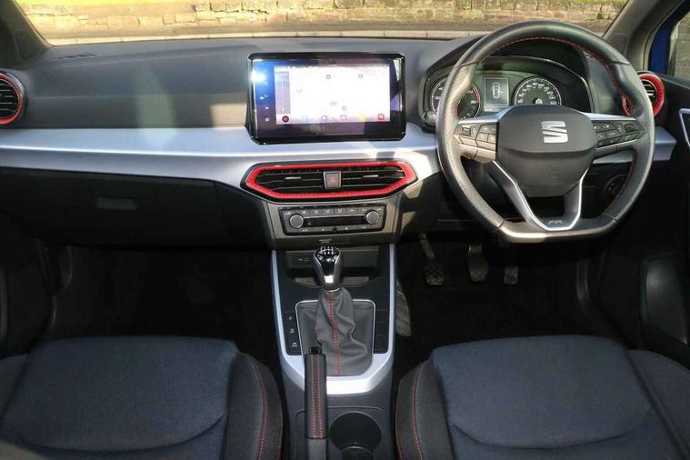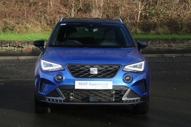 'Lights On' Reminder warning buzzer, 8" Digital cockpit, Digital clock, E-call, Electric speed sensitive power steering, Full Link Smartphone Integration with Mirror Link, Apple Car Play, Google Android Auto with USB Type C cable for Apple and Android compatibility, Lane keeping system, Low fuel warning light, Outside temperature display, Rear parking sensor, RPM counter, Seat connect with safety, service, remote and online, SEAT Drive profile - Four different models normal-sport-eco-individual, steering response, throttle response, Trip computer, Bluetooth interface for hands free and audio streaming, DAB digital radio and AM/FM radio, Steering wheel mounted audio controls, Anti theft roof antenna, Auto dimming interior rear view mirror, Automatic activation of hazard warning lights, Body coloured bumpers, Body coloured door handle inserts, Chrome roof rails and window surrounds, Dark tinted rear windows, Electric front/rear windows, Electrically adjustable, heated and folding door mirrors, Front fog lights with cornering function and rear fog light, FULL LED automatic headlights with dynamic headlight range control, coming and leaving home, LED daytime running lights, LED rear tail lights and licence plate lights, Protective side mouldings, Rain sensing wipers, Rear side wing doors, Rear spoiler, Rear window wash/wipe, Roof colour door mirrors, Third brake light, Twin exhaust pipe styling hidden exhaust pipe, Visible VIN plate, Windshield wiper with intermittent control and potentiometer, 2 cupholders, 3 seat bench in 2nd row, 60/40 split folding rear seat, Aircare filter, Black interior roof, Cloth upholstery, Double boot floor, Driver sunvisor with covered mirror + card holder, Dual zone climate control, Front courtesy light with 2x front and 2x rear reading lights, Front sport seats, Gear shift indicator, Height adjustable front seats, Height/reach adjustable steering column, Illuminated boot, Instrument lighting with brightness control, Interior ambient lighting, Interior light in footwell, central console and door panel, ISOFIX points in outer rear seats with top tether anchorage points, Passenger sunvisor with vanity mirror, Perforated flat bottomed leather steering wheel/gear knob/handbrake with red stitching and FR logo, Single front passenger seat, Two front and three rear height adjustable headrests, Connectivity pack plus - Arona, Interior chrome pack - Arona, 3 point seatbelts on all rear seats, ABS, Active front headrests, Child locks on rear doors, Driver and front passenger airbags with front passenger airbag de activation, front side and curtain airbags, Electronic stability control, Emergency Brake Assist (EBA) and front assist, Front and rear seatbelt reminder, Hill hold control, Multi-Collision braking, Tiredness recognition system, Traction control, Tyre pressure monitoring system, Alarm with back-up horn, Electronic engine immobiliser, Locking wheel bolts, Remote central locking + deadlocks, Tow away protection, Titan black dashboard, 17" Dynamic alloy wheels,