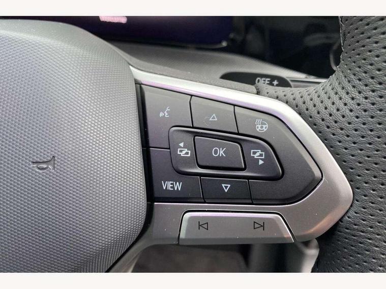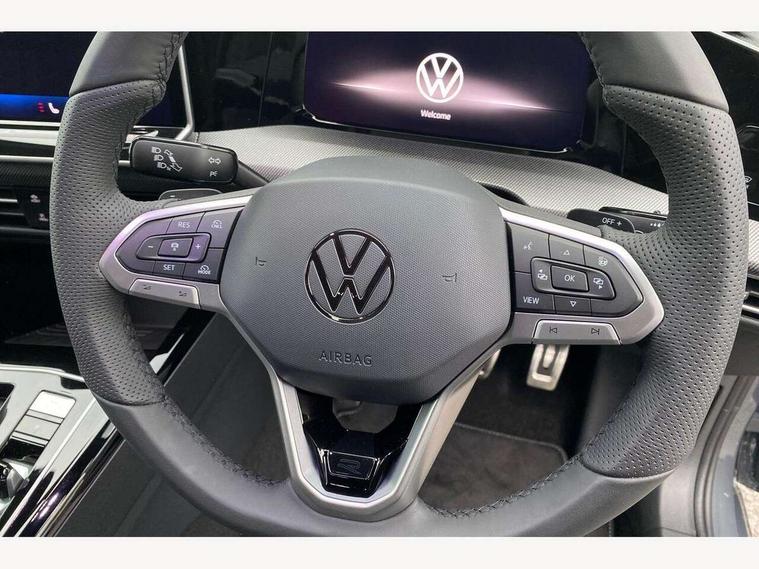 Activated carbon canister, Adaptive cruise control (ACC), Advanced driver attention and drowsiness monitor, Dynamic road sign display, Dynamic steering, E-Sim card for online connectivity, eCall emergency call system, Multi-color Digital cockpit pro, selection of different info profile possible, Multifunction front facing camera for distance control, Navigation system, Oncoming vehicle braking when turning including swerve support, Speed limiter, Speedo, rev counter, electronic odometer, trip, service interval display, exterior temperature and fuel gauge, Traffic jam assist, Voice enhancer and voice control, Warning signal and warning light for front and rear seatbelts not fastened, We connect plus preparation, We connect preparation, Wireless app connect, Hybrid propulsion system, Petrol Particulate Filter, Start-stop system with battery regeneration (recuperation - energy recovery during braking), XDS electronic differential lock for improved traction and handling, 2 USB C ports in front, 2 USB charging sockets on the centre console in the rear charging capacity upto 45W, Digital radio reception (DAB), Diversity antenna for FM reception, Gaming platform via car app, Infotainment system with 12.9" display, Mobile phone interface with inductive charging feature, 3rd brake light, Automatic headlamp activation with Coming home and Leaving home feature, Body colored bumpers in R-Line style, Body colour door handles, Exterior mirrors convex on the left and aspherical on the right, Front and rear electric windows, Heat insulating windshield made of laminated glass, LED separate daytime running light, Rear exhaust tailpipe, Rear fog light on one side and reversing lights on both sides, Rear side wing doors, Rear windscreen washer and wiper with interval delay, Remote electrically foldable door mirrors, puddle lights and reverse activated passenger's door mirror, Welcome light with surround lighting, 12V socket in front centre console, 12V socket in luggage compartment, 3 rear head restraints, 3 seat bench in 2nd row, Ambient lighting with 30 colour including LED light unit in front footwell with selectable light colour, Black roof lining, Brushed stainless steel pedals, Chrome plated radiator grille inserts, air vent surrounds and light switch surrounds, Door insert, side trim panel and arm support in leatherette, Front + rear black carpet mats, Front centre armrest, Front seat lumbar support adjuster, Integrated front head restraints, ISOFIX anchors for child seats on outer rear bench seats and on front passanger seat compatible for i-Size, Luggage compartment lighting, Manual height adjustable front passenger seat, Manually height adjustable driver seat, Plastic gear knob, Premium sports seats in front, Rear cupholder and loadthough, Sardegna cloth upholstery with front and outer rear seats Art Velour inner sides of bolsters, Single front passenger seat, Split folding backrest with centre armrest and unsplit rear seat bench, Sun visors with illuminated vanity mirrors, Titanium black instrument panel, 3 point height adj front seatbelts + pretensioners, 3 rear three point seatbelts, ABS, Autonomous emergency braking front assist with pedestrian and cyclist monitoring, Child locks on rear doors, Driver and front passenger airbag with front passenger airbag deactivation, Electronic parking brake with auto hold, ESC (Electronic Stability Control), Extended pedestrian protection measures, Hill start assist, Rear disc brakes, Two tone horn, Tyre pressure loss indicator, Volkswagen roadside assistance, Anti theft wheel bolts, Preparation for alcohol interlock, Decorative inserts carbon grey for dashboard and front door trim panels, Tool kit for tyre mobility set, Tyre mobility kit Includes 12V compressor and tyre sealant,