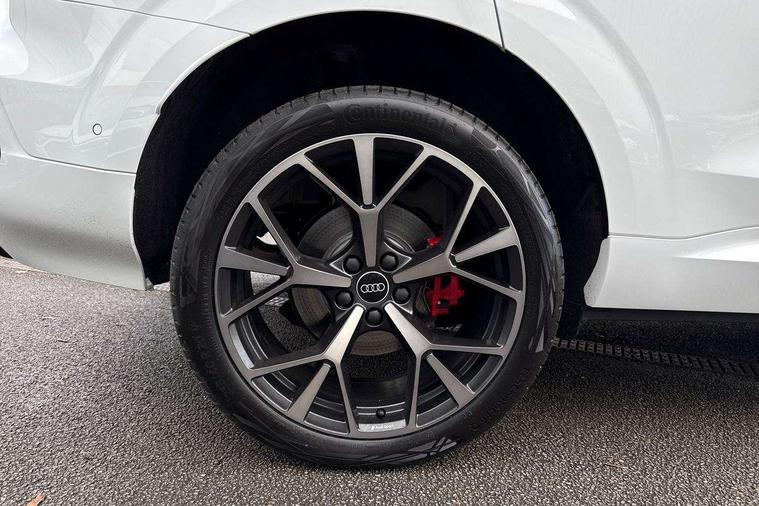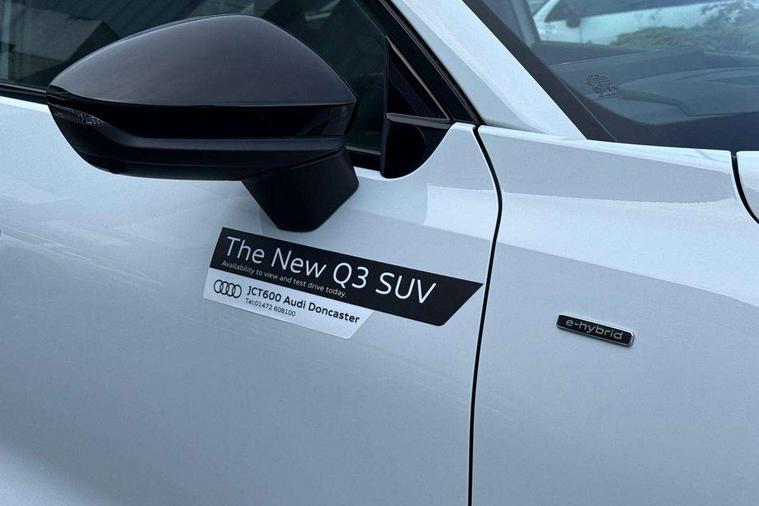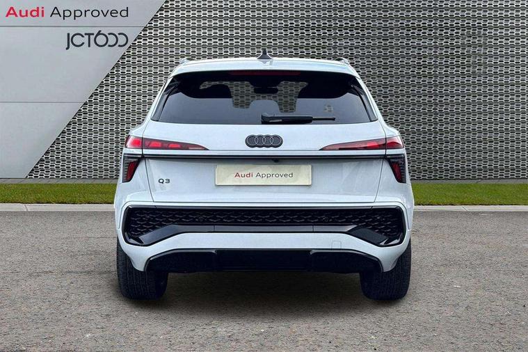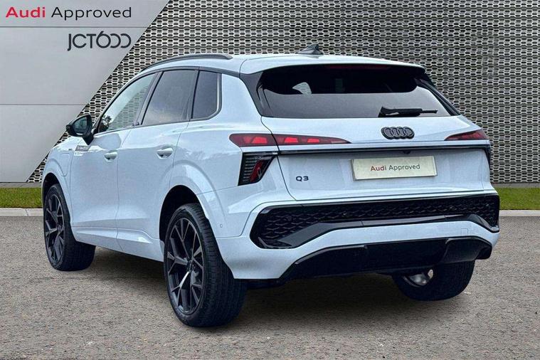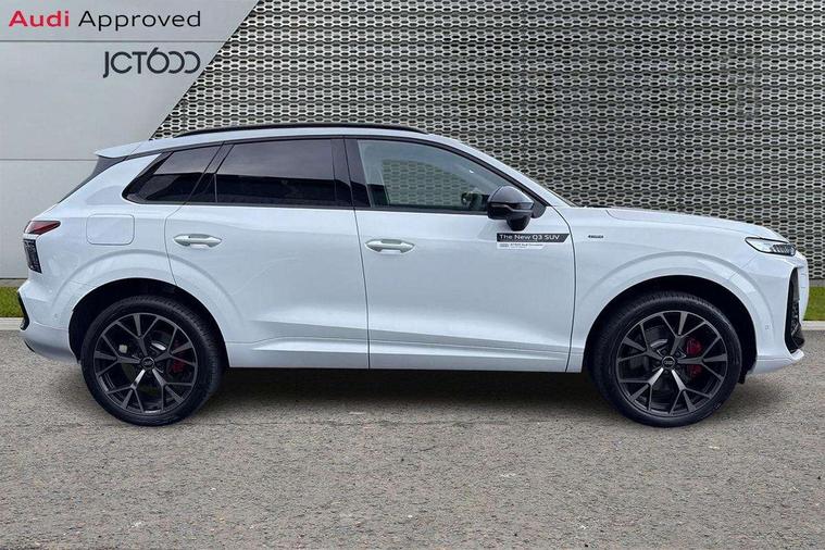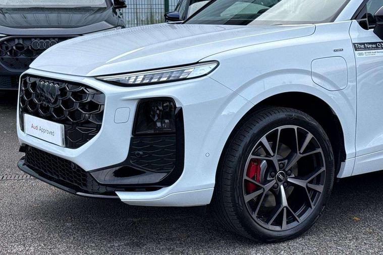 Adaptive cruise assist plus, Audi connect emergency call and service, Audi connect remote and controls, Audi drive select for suspension with damper control, Audi side assist with exit warning and rear cross traffic assist, Audi virtual cockpit plus - 11.9" display, Bluetooth interface, Camera based traffic sign recognition, Driver attention and fatigue detection with driver monitoring camera, Emergency assist, Front cross traffic assist, Garage door opener, Head up Display, In-car-office assist, Panoramic curved display with 12.8" MMI navigation plus and MMI touch, Phonebox light with wireless charging, Progressive steering, Projection of a black ice warning, Smartphone interface includes wireless Apple carplay/Android Auto, Start/stop system, Surround view cameras, Swerve assist and turn assist, Traffic sign based speed limiter, Trained parking, Voice control system with natural language interaction, 3 pin 10 amp domestic charging cable, Charging socket CCS type 2, Compact charging system, Industrial connector CEE 32A, 230V, Mode 3 charging cable for public charging, 22 KW (AC), Petrol Particulate Filter, Sound actuator for interior drive sound, Suspension with damping control, 2 USB-C ports with charge and data functions, DAB digital radio module, SONOS premium sound system, USB interfaces with higher charging capacity, Acoustic glass for front door windows, Acoustic windscreen, Advanced dynamic light scenario of the coming home/leaving home function, Aluminium window trim, Audi Q3 lettering on the B-pillars, Auto dimming rear view mirror, Automatic dynamic headlight range control, Automatically dimming exterior mirrors with memory function, Contrasting finish in volcano grey, Cornering light, Digital matrix LED headlights, Digital OLED rear lights, Dipped beam, Dynamic indicators, Electrically folding, adjustable and heated door mirrors with integrated LED side indicators and kerb view function for passenger side, Full paint finish, Headlight cleaning system, High resolution main beam, Illuminated door sills with aluminium inserts at the front with S logo, Intersection light, Lane light with side assist and direction indicator, LED daytime running lights, LED third brake light, Loading sill protector in stainless steel, Manoeuvring light, Motorway light, Opening panoramic sunroof, Orientation light with lane departure warning, Position light, Preparation for trailer hitch, Privacy glass - dark tinted rear window, rear door and side windows, Projection light in the exterior mirrors - Projects a graphic element onto the ground, Q3 badging on the rear, Rain and light sensors, Rear side wing doors, Rear window, rear door windows and rear side windows in clear glass, Rear wiper, Solid paint, Sports bumpers, Turning light, 3 seat bench in 2nd row, 3 spoke flat top and bottomed leather free multi function Sport steering wheel with gear shift paddles and "S" badging, 3-zone deluxe automatic air conditioning, 4 way lumbar support for the front seats - electric with horizontal and vertical adjustment in four directions, Black cloth headlining, Convenience auxiliary air conditioning, Electrically adjustable front seats with memory function for driver's side, Front and rear floor mats, Front and rear headrests, Front centre armrest, Heated front seats, Height and reach adjustable steering wheel, Interior storage compartment, Luggage compartment lid, electrically opening and closing, Microfibre upholstery with rhombus pattern and S emblem + front sports seats, Single front passenger seat, Stainless steel pedals, Steering wheel operating unit, gloss black, Storage compartment in front centre console, Ambient lighting package pro - Q3, Black styling pack with black door mirrors - Q3, Function pack - Q3, 3 point seat belts in front, with pretensioner and electric height adjustment, 3x3 point rear seatbelts, Acoustic vehicle alerting system, Convenience key with safelock, Driver and front passenger airbag with passenger airbag deactivation, Electromechanical parking brake, Electronic stabilisation control including ABS, ASR and EDL, First aid kit with warning triangle and high visibility vests, Front and rear side airbags with head airbags and front interaction airbag, Front emergency brake assist, i - Size child seat mounting on the front passenger side and i - Size and top tether on the outer rear seats, Power operated child locks, Proactive occupant protection, front, side and rear, Rear side airbags, Red brake callipers, front and rear, Seatbelt monitoring, Tyre pressure loss indicator, Anti theft wheel bolts, Remote central locking, Thatcham approved category 1 anti theft alarm, Dark aluminium divergence inlay, Interior elements in dinamica microfibre, Interior trims in aluminium look, 20" 5 spoke tripod design alloy wheels with gloss turned finish in darkened metallic black, Tool kit and Jack, Tyre repair kit,