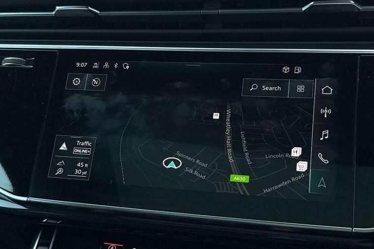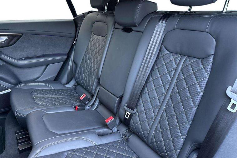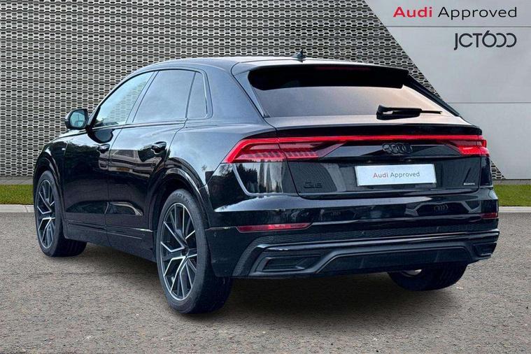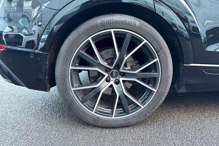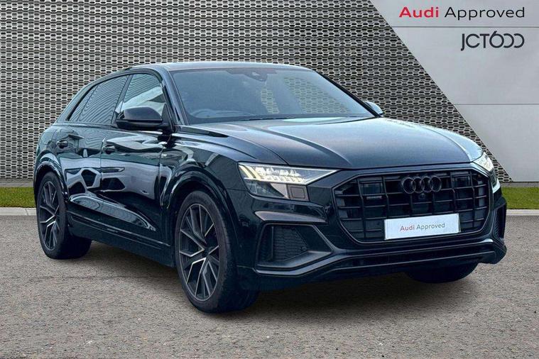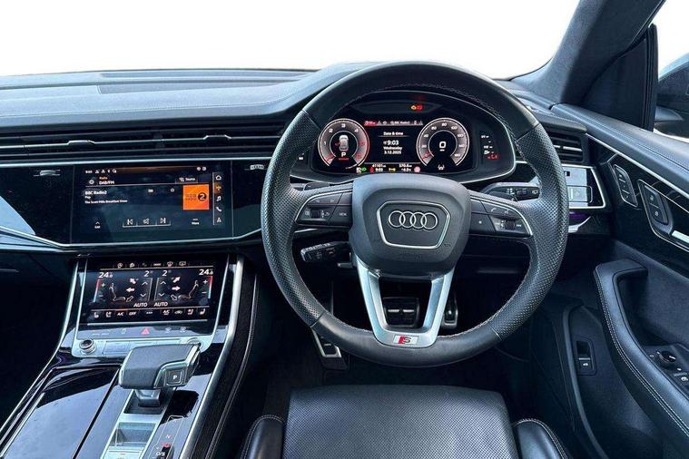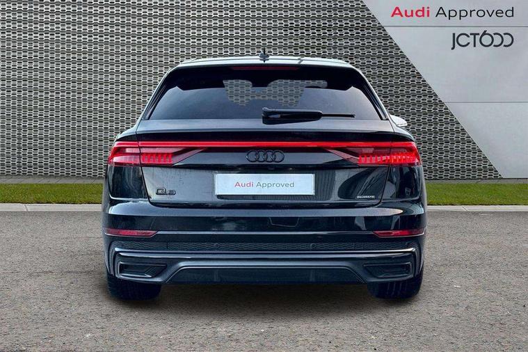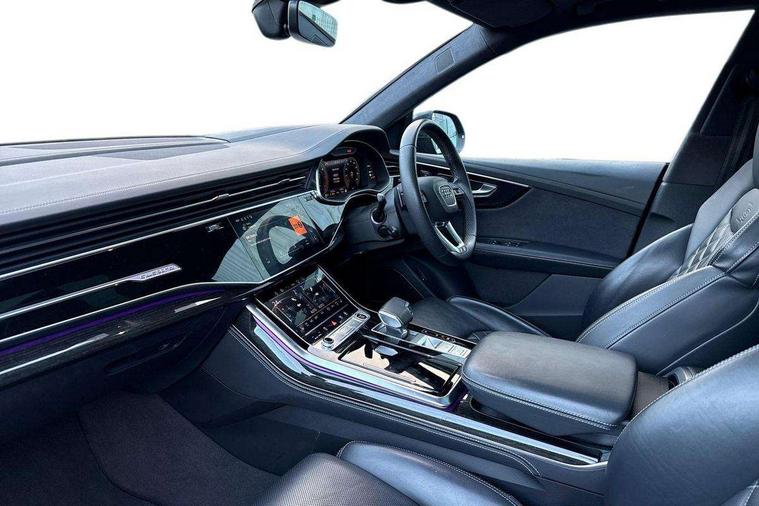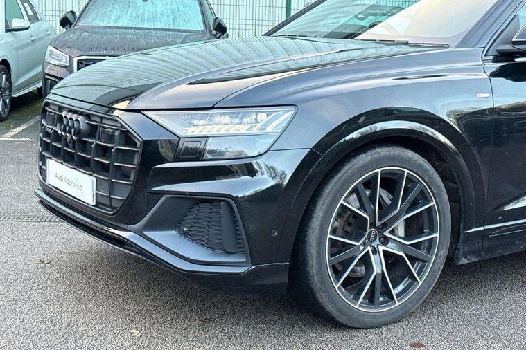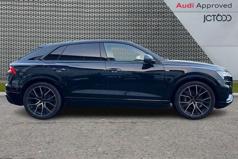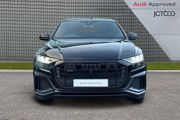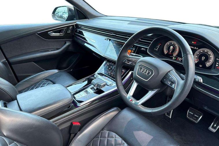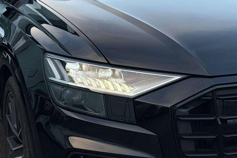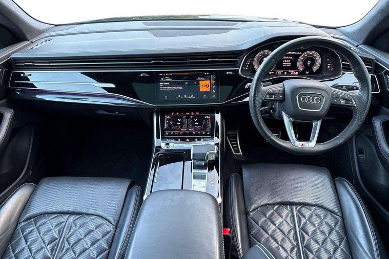 10.1" and 8.6" Dual colour touchscreens, 2 USB C ports with charging functionality in the rear, 360 camera, Adaptive cruise control, All wheel steering, Audi connect safety and service (e-call), Audi connect with Amazon Alexa Integration, Audi drive select, Audi phone box light with wireless charging, Audi side assist, Audi virtual cockpit plus, Automatic start/stop system, Camera based traffic sign recognition, Collision avoidance assistant, Cross traffic assist front and rear, Electro-mechanical PAS, Head up Display, Lane departure warning with emergency assist, Low washer fluid indicator, MMI - Multi Media Interface control system, MMI navigation plus with MMI touch, Natural voice recognition, On board computer, Operating buttons in black, glass look with haptic feedback, Power door closure, Power operated tailgate, Predictive efficiency assistant, Remote park assist plus, Service interval indicator, Smartphone interface includes wireless Apple carplay/Android Auto, Turn Assist, 48V Mild hybrid technology, Adaptive sport air suspension, Diesel particulate filter, Quattro all wheel drive with self locking centre differential, Audi music interface with 2 USB ports with charge and data functions, Aux-in socket, Bang + Olufsen sound system, DAB Digital radio, 3rd brake light, Acoustic windscreen, Adaptive windscreen wipers with integrated washer jets, Aluminium window trim, Audi beam, Audi HD Matrix LED headlights with dynamic front and rear indicators, Auto dimming frameless rear view mirror, Coming/leaving home lighting function, Electric front+rear windows, Electric panoramic glass sunroof, Electrically folding auto dimming/adjustable/heated door mirrors with memory function, LED side indicators and kerb view function for passenger side, Gloss black finish for exterior Audi rings and Q8 logo without engine badging, Headlight washers, Heat insulating glass in windshield, LED signature daytime running lights, Platinum grey front spoiler lip and diffuser insert with honeycomb grille in black, Privacy glass - dark tinted rear and rear side windows from B-pillar backwards, Rain and light sensors, Rear side wing doors, Rear wiper, 3 bench rear seats in 2nd row, 3 spoke heated leather multi-function sport steering including paddle shift, 4 zone deluxe automatic climate control, 4-way lumbar support for front seats, 40:20:40 split folding rear bench seat, Audi phone box light, Black dinamica headlining, Comfort front centre armrest, Double sun visor with illuminated vanity mirror on driver and passenger side extendable, Driver and front passenger seat memory function for electrically adjustable front seats, Electric luggage compartment cover, Electric sunblind for the rear side windows and manual sunblind for the rear window, Front head restraints, Front/rear floor mats, Heated front and outer rear seats, ISOFIX child seat mounting for front passenger seat and 2 outer rear seats with top tether child seat mounting for all 3 rear seats, Luggage compartment sill protection in stainless steel, Massage and ventilation function for front seats, Power adjustable steering wheel, Rear centre armrest with 2 cupholders, Rear headrests, Seat cushion displaceable by 100mm in the ratio 60:40, Single front passenger seat, Stainless steel pedals, Valcona leather upholstery + front super sport seats with S embossed logo, Ambient lighting package plus - Q8, Extended leather pack - Q8, Multi coloured extended LED Interior lighting pack - Q8, 3 point seatbelts on all seats, Audi pre sense basic, Audi pre sense front, Audi pre sense rear, Child locks on rear doors, Driver and front passenger, front side and curtain airbags, Electromechanical parking brake, Electronic Stability Control (ESC) including ABS, ASR and EDL, Exit warning, Front passenger airbag deactivation, Hill descent control, Hill hold assist, Predictive pedestrian protection, Seatbelt monitoring, Traction control, Tyre pressure loss indicator, Warning triangle and first aid kit, Advanced key, Anti theft alarm with tow away protection, Anti-theft wheel bolts and wheel loosening detection, Immobiliser, Polished oak trim with grey finish inlay, Tool kit, Tyre repair kit,