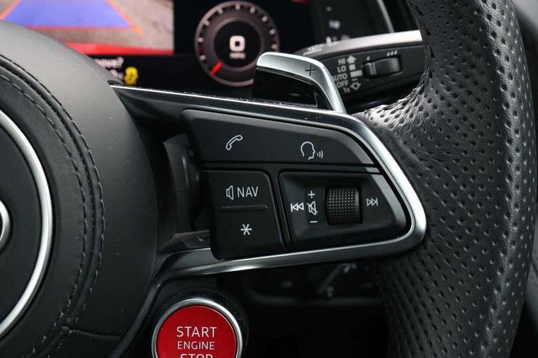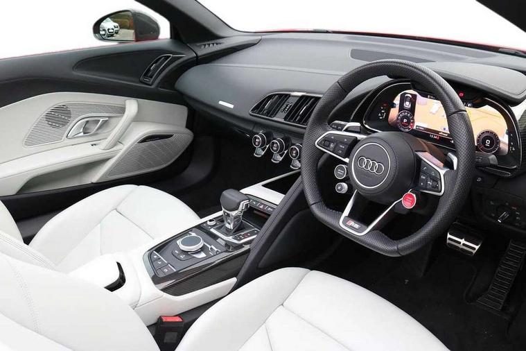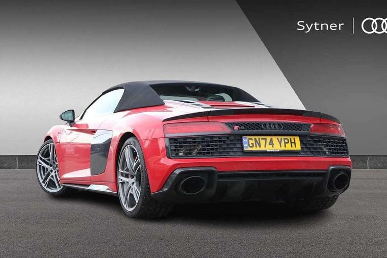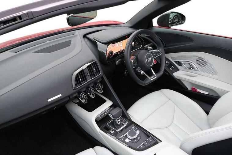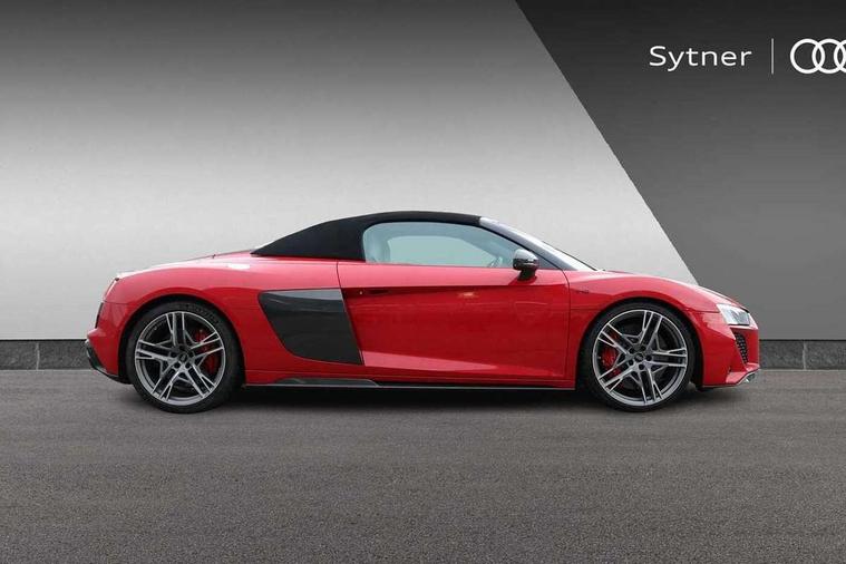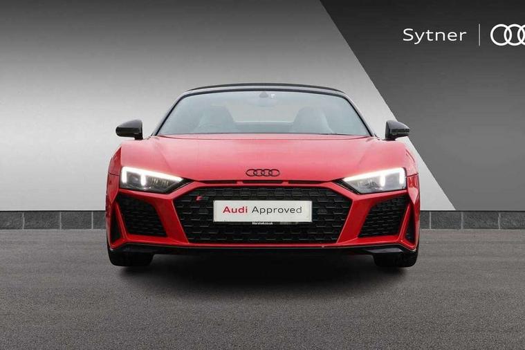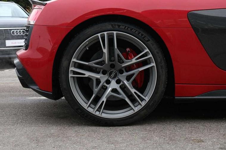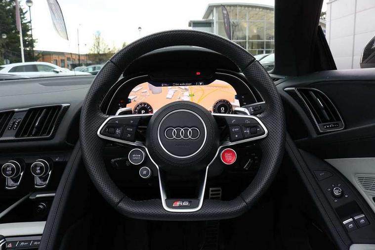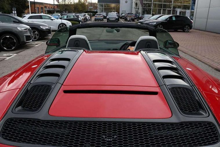 Audi connect, Audi drive select, Audi parking system plus with front and rear sensors, Audi phone box with wireless charging, Audi smartphone interface, Audi virtual cockpit, Bluetooth interface, Cruise control with speed above 18mph, Emergency call service, MMI navigation plus with MMI touch, PAS, Reversing camera, Service interval indicator, Start/Stop system with energy recuperation, Voice control system, 80 litre fuel tank, Audi cylinder on demand, S tronic transmission with hill hold assist, Sports suspension, Audi music interface with 2 USB ports with charge and data functions, Bang and Olufsen Sound System with loudspeakers in the head restraints, DAB Digital radio, 3rd brake light, Audi beam, Audi space frame, Auto dimming rear view mirror and frameless with light and rain sensor, Black mirrors, Electric front windows, Electrically adjustable, heated, folding and automatically dimming door mirrors with integrated LED indicator, Fixed rear lip spoiler in Gloss Carbon, Gloss black oval tailpipe trim, Gloss black radiator grille with R8 emblem, Heated rear window, High beam assist, LED headlights with dipped beam, daytime running lights, indicator and static turning light in LED technology, LED rear lights with dynamic rear indicators, Light and rain sensor, Rear boot, Sideblades in gloss carbon, Variable front intermittent wipers, 3 spoke flat bottomed multi-functional perforated performance leather steering wheel with 3 operating satellites, Deluxe automatic climate control air conditioning, Hood lining in black, Illuminated door sills with aluminium insert, Pneumatic seat backrest and side bolster adjustment, Seat heating, Single front passenger seat, Stainless steel pedals and footrest, Black styling pack - R8 Spyder, Gloss black styling pack - R8, Interior light pack - R8, ABS, Ceramic brakes in front with brake calipers in gloss red, Driver/front passenger airbag, EDL traction control, ESP, Front side airbags, Seatbelt monitoring, Tyre pressure warning light, Warning triangle and first aid kit, Wave brake discs, Advanced key with safelock, Anti theft alarm and immobiliser, Locking wheel bolts, Remote central locking, Belt loops, top section of centre console, centre armrest, door pull handle and speaker trim on front pass. side in fine Nappa leather seat up. colour, Door armrests and map compartments in fine Nappa leather in seat upholstery colour, Loudspeaker on drivers side in artificial black leather, Matt anthracite titanium finish inlays, Piano black lower inlays, Steering wheel impact absorber trim, lower part of centre console, door rails, rear panel rail and side panel trims in black Fine Nappa Leather, Upper and lower section of dashboard, cowl, monoposto, knee pad on the drivers side, airbag cover in black Fine Nappa Leather, Tool kit, Tyre repair kit,