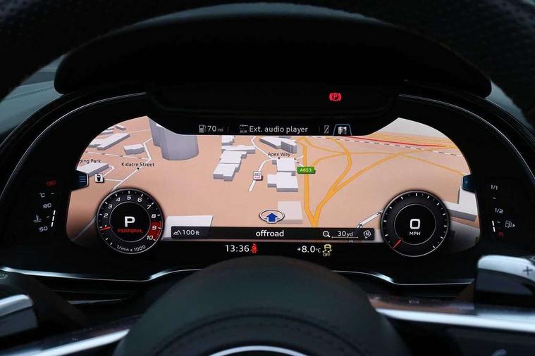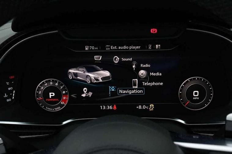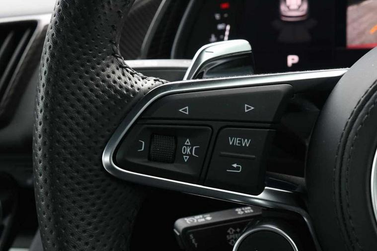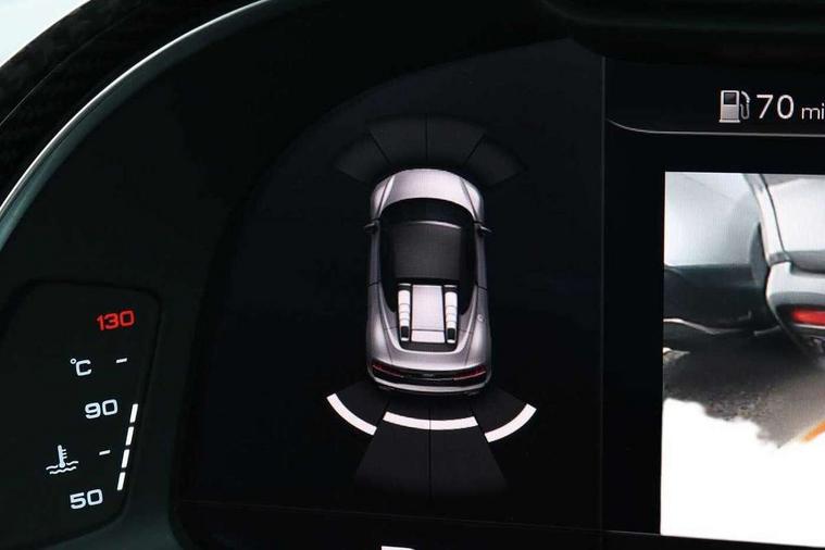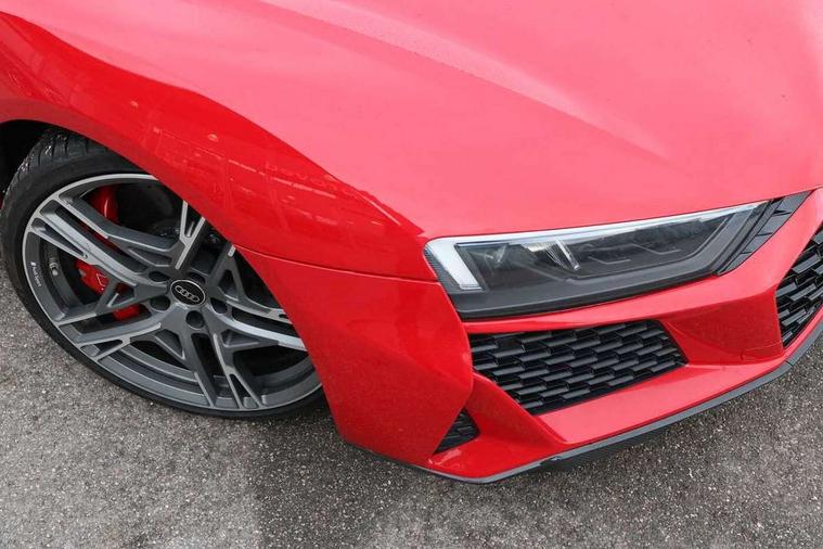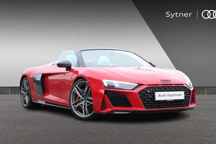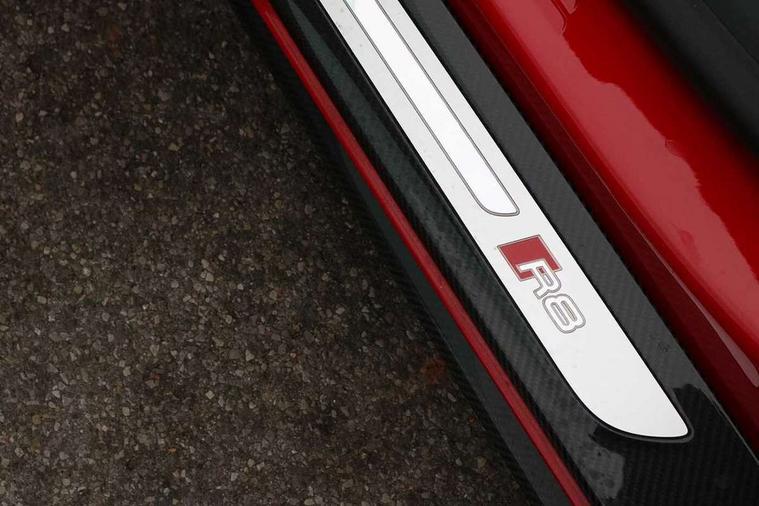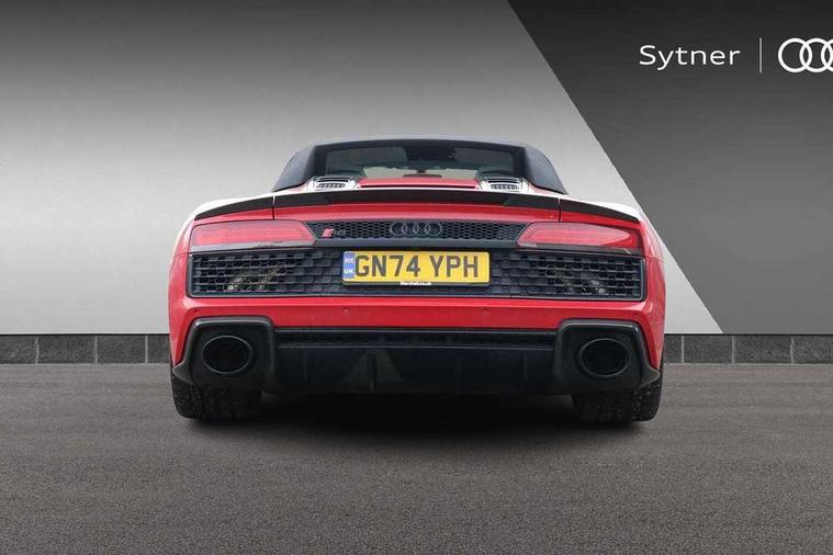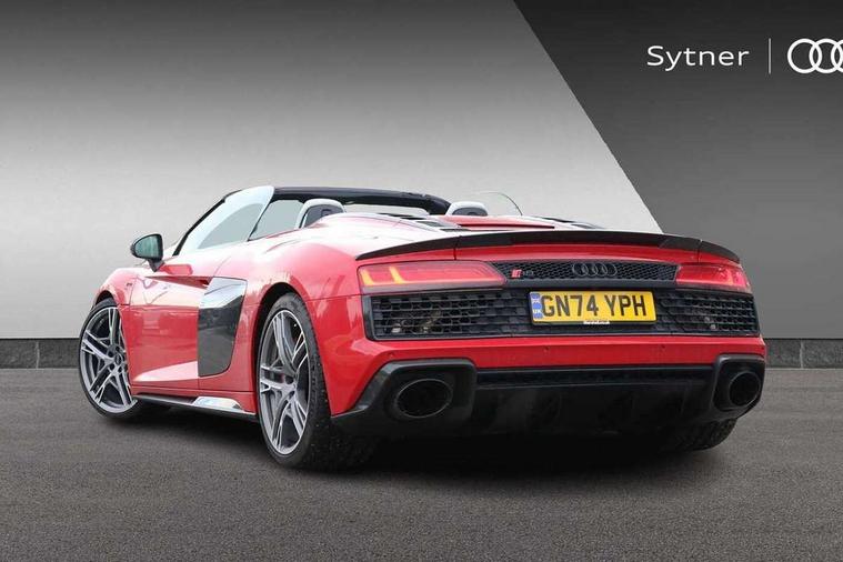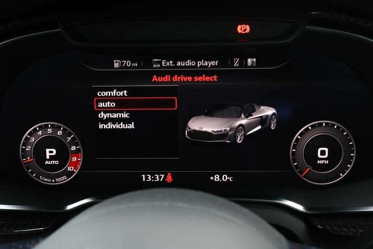 Audi connect, Audi drive select, Audi parking system plus with front and rear sensors, Audi phone box with wireless charging, Audi smartphone interface, Audi virtual cockpit, Bluetooth interface, Cruise control with speed above 18mph, Emergency call service, MMI navigation plus with MMI touch, PAS, Reversing camera, Service interval indicator, Start/Stop system with energy recuperation, Voice control system, 80 litre fuel tank, Audi cylinder on demand, S tronic transmission with hill hold assist, Sports suspension, Audi music interface with 2 USB ports with charge and data functions, Bang and Olufsen Sound System with loudspeakers in the head restraints, DAB Digital radio, 3rd brake light, Audi beam, Audi space frame, Auto dimming rear view mirror and frameless with light and rain sensor, Black mirrors, Electric front windows, Electrically adjustable, heated, folding and automatically dimming door mirrors with integrated LED indicator, Fixed rear lip spoiler in Gloss Carbon, Gloss black oval tailpipe trim, Gloss black radiator grille with R8 emblem, Heated rear window, High beam assist, LED headlights with dipped beam, daytime running lights, indicator and static turning light in LED technology, LED rear lights with dynamic rear indicators, Light and rain sensor, Rear boot, Sideblades in gloss carbon, Variable front intermittent wipers, 3 spoke flat bottomed multi-functional perforated performance leather steering wheel with 3 operating satellites, Deluxe automatic climate control air conditioning, Hood lining in black, Illuminated door sills with aluminium insert, Pneumatic seat backrest and side bolster adjustment, Seat heating, Single front passenger seat, Stainless steel pedals and footrest, Black styling pack - R8 Spyder, Gloss black styling pack - R8, Interior light pack - R8, ABS, Ceramic brakes in front with brake calipers in gloss red, Driver/front passenger airbag, EDL traction control, ESP, Front side airbags, Seatbelt monitoring, Tyre pressure warning light, Warning triangle and first aid kit, Wave brake discs, Advanced key with safelock, Anti theft alarm and immobiliser, Locking wheel bolts, Remote central locking, Belt loops, top section of centre console, centre armrest, door pull handle and speaker trim on front pass. side in fine Nappa leather seat up. colour, Door armrests and map compartments in fine Nappa leather in seat upholstery colour, Loudspeaker on drivers side in artificial black leather, Matt anthracite titanium finish inlays, Piano black lower inlays, Steering wheel impact absorber trim, lower part of centre console, door rails, rear panel rail and side panel trims in black Fine Nappa Leather, Upper and lower section of dashboard, cowl, monoposto, knee pad on the drivers side, airbag cover in black Fine Nappa Leather, Tool kit, Tyre repair kit,