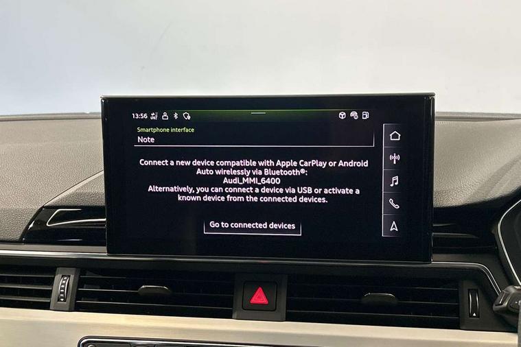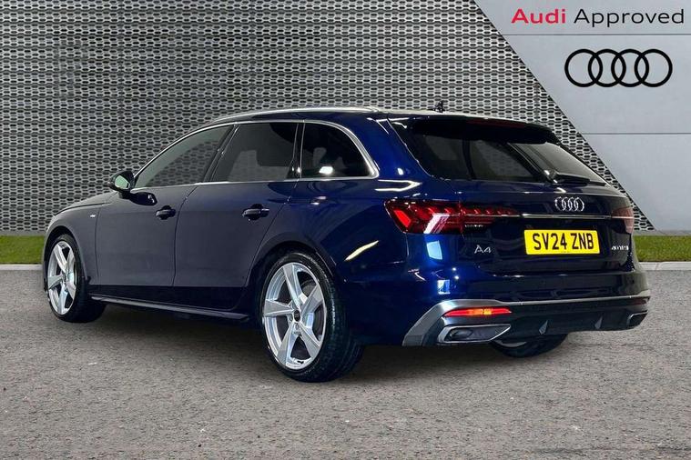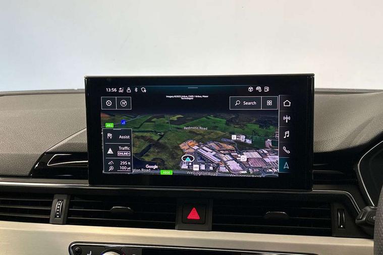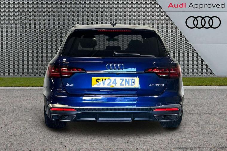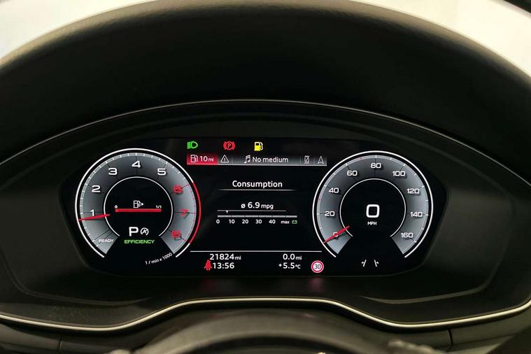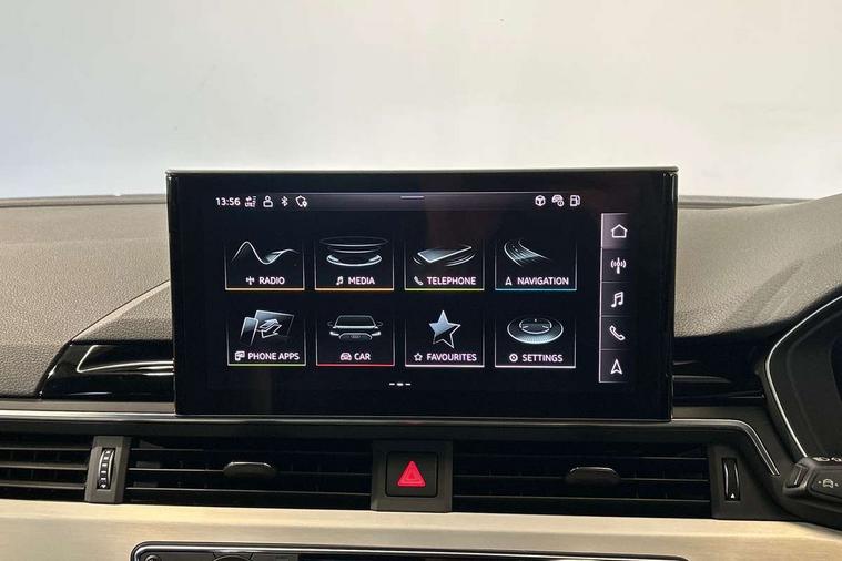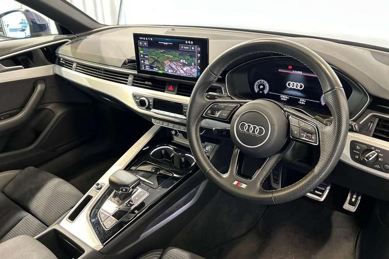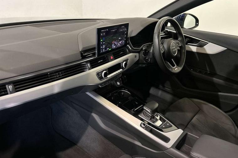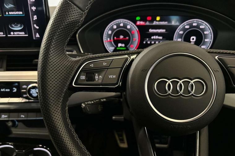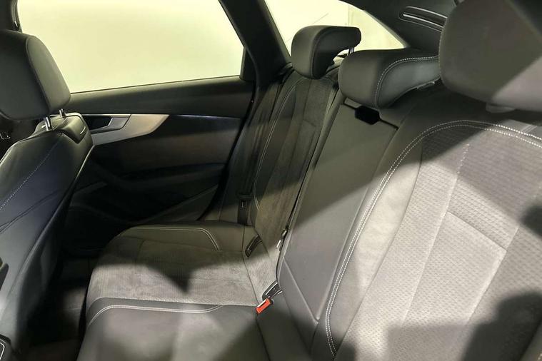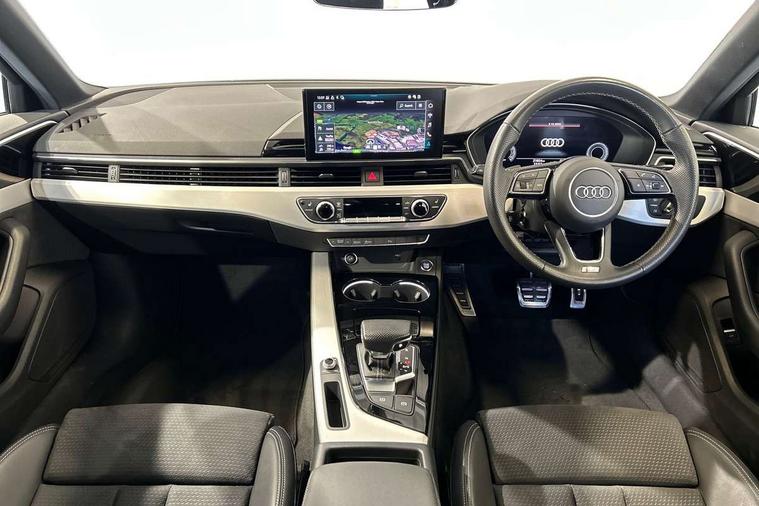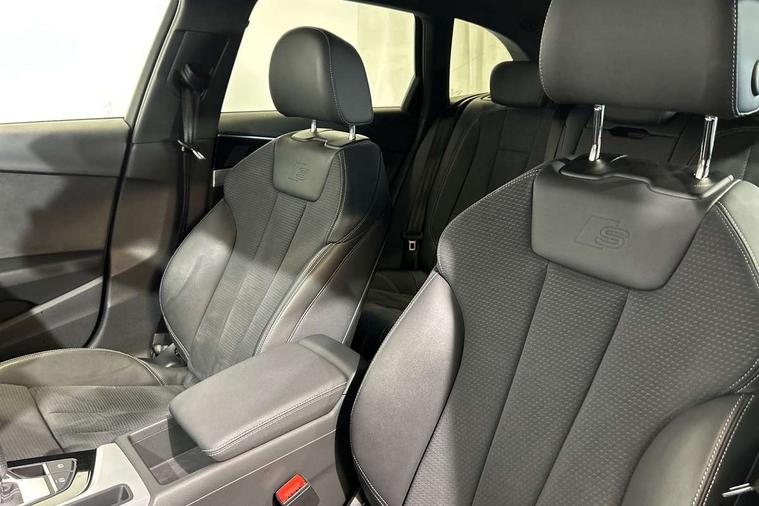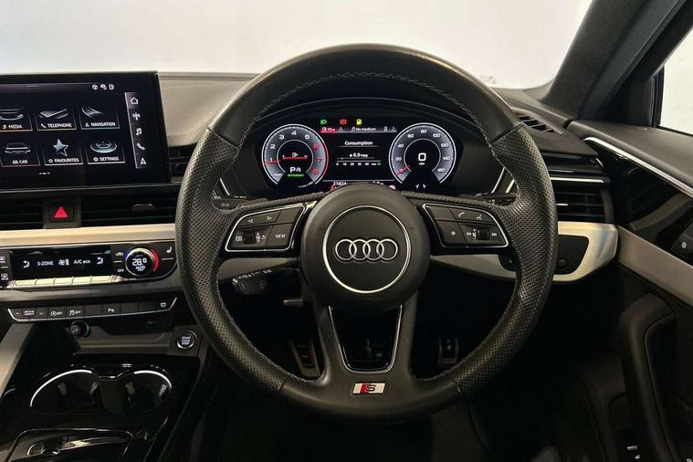 Audi connect safety and service (e-call), Audi drive select, Audi smartphone interface, Audi virtual cockpit, Automatic start-stop system with coasting functionality and efficiency programme, Bluetooth interface, Camera based traffic sign recognition, Electromechanical power steering, Email, calendar and text messages displayed via MMI, Front and rear parking sensors, Lane departure warning, MMI Navigation plus with MMI touch includes 10.1" high resolution colour MMI display, 3D map, Power operated tailgate, Rear view camera, Voice control system, 54 litre fuel tank, Sports suspension lowered by 23mm, 2 USB charging ports, 8 passive loudspeakers, DAB digital radio reception, Aluminium roof rails, Auto dimming rear view mirror, Body colour door handles, Body colour front spoiler lip, Body colour side sill trim, Body coloured door mirrors, Electric adjustable/heated/folding door mirrors with auto dimming, Grained matt black side air inlets with matt aluminium silver inlay, High beam assistant, Honeycomb structure radiator grille in grained matt black, LED headlights with LED rear lights + dynamic rear indicators + headlight adjustment and high beam, turning light + LED daytime running lights, LED third brake light, Matt aluminium silver tailpipe trim, Privacy glass, Rain and light sensors, Rear side wing doors, Rear wiper, S Line badges on the front wings, S line front and rear bumpers with side skirts, S Line rear diffuser in matt anthracite black with trim strip in matt aluminium silver, S Line roof edge spoiler, Variable intermittent front wash/wipe, Windscreen with acoustic glazing, 3 spoke high multi-function sports leather steering wheel grips in perforated leather with S badging including paddle shift, 4 way electric lumbar support for driver and front passenger, 40/20/40 split folding 3 rear seat bench in 3 parts with rear centre armrest, Black carpets, Black cloth headlining, Black perforated leather gearknob, Contrast stitching on seats, steering wheel and gear lever gaiter, Deluxe 3 zone electronic climate control, Electric load area cover, Front and rear head restraints, Front centre armrest, Heated front seats, Illuminated door sill trims with S logo, ISOFIX child seat mounting and top tether, Manual seat adjustment, Single front passenger seat, Stainless steel pedals and foot rest, High gloss package - A4, LED Interior light pack - A4/S4, 3 rear seatbelts, 6 airbags - Driver, front passenger, curtain and side windows, Attention and drowsiness assist, Electronic Stabilisation Control (ESC) including ABS, ASR and EDL, Hill hold assist, Multi collision brake assist, Pop-up bonnet for pedestrian protection, Pre sense city, Rear door child safety locks, Seatbelt monitoring, Warning triangle and first aid kit, Anti theft alarm, Anti theft wheel bolts, Central locking, Keyless Go, Matt brushed aluminium inlays, Tool kit, Tyre repair kit,