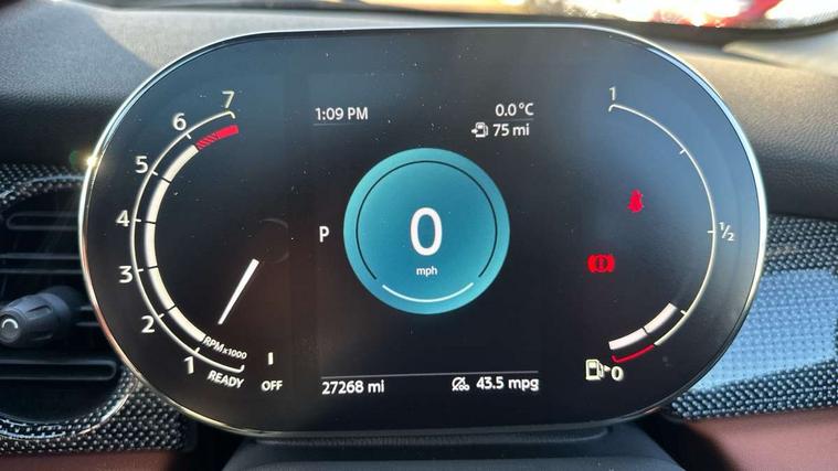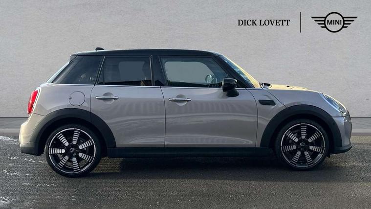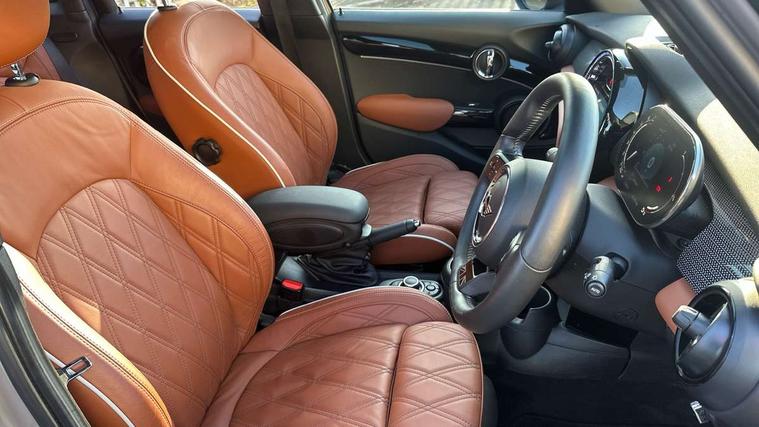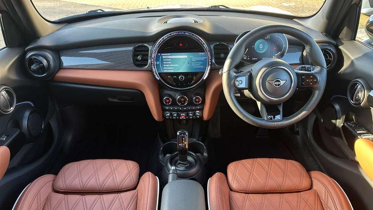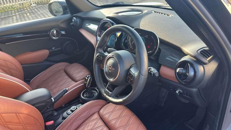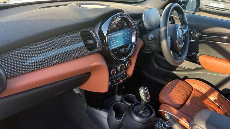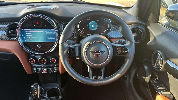 Automatic start/stop function with brake energy recuperation, Compatible mobile phone bluetooth with audio streaming, Cruise control with brake assist, Electro-mechanical speed dependant steering assistance, Flexible car sharing preparation, Instrument cluster, MINI Driving Modes - centre toggle switch to control driving setting (sport, mid and green), Mini E-call, MINI TeleServices, On board computer, Rear park distance control, Service interval indicator, Double Vanos system, Fully variable valve control, Gear change indicator display, High precision injection, Performance Control, Steptronic transmission with double clutch, 6 speakers in front door trims and underneath front seats, 8.8" touchscreen with LED ring, FM tuner and DAB digital radio, Automatic headlight activation switch, Body colour fuel filler cap, Chrome line exterior - radiator grille bars, tailgate handle, lower front grille grating and rear central fog-light, Dynamic brake lights, Electric front+rear windows, Heated rear window, Heated windscreen washer jets, LED headlight with closed ring and daytime driving lights, Metal door sill strips with MINI imprint, Model logo Cooper on right of tailgate, Rain sensor window wipers, Rear fog lights, Rear LED lights with union jack design, Rear window wiper, Side scuttle panel with integrated indicator, Sun/heat protection glass, White indicator lenses, 12V Accessory socket in centre console, 4 lashing eyes in luggage compartment, 60/40 split folding rear seat, Anthracite headliner including grab handles and clothes hooks, Carbon black colour line - Knee roll and door armrest, Chrome interior highlights, Chrome line interior - air vents, gear lever base, door handles and speakers in doors, Cupholders, Front and rear head restraints, Front and rear isofix with front passenger airbag deactivation, Glove compartment, Height and length steering column adjustment, Interior lighting with 12 different colours across the dashboard, underneath door bezel with illuminated laser-engraved design on central display, Leatherette gearshift lever and handbrake gaiters, LED reading lights, vanity mirror lights, front foot well light and spotlight on front seats, Manual air conditioning, Mechanical seat adjustment - forward/back & backrest for front seats and driver seat height adjust, MINI yours badge on exterior pillar, Multifunction steering wheel, Storage compartments in doors, Sunvisors with vanity mirrors, Velour floor mats, Walknappa leather steering wheel with grey seam and MINI Yours badge on Piano Black lower steering wheel spoke, 3 point seatbelts on all five seats, 6 Airbags - front, side, head and seat belt tensioners, Anti-lock braking system (ABS), DSC - Dynamic Stability Control, Front and rear disc brakes, Hill start assist, Single tone fanfare horn, Tyre pressure monitoring system, Alarm system with tilt sensor, monitoring doors, bonnet interior and tailgate, Electronic vehicle immobiliser, Start/stop toggle with keyless go, Tool kit,