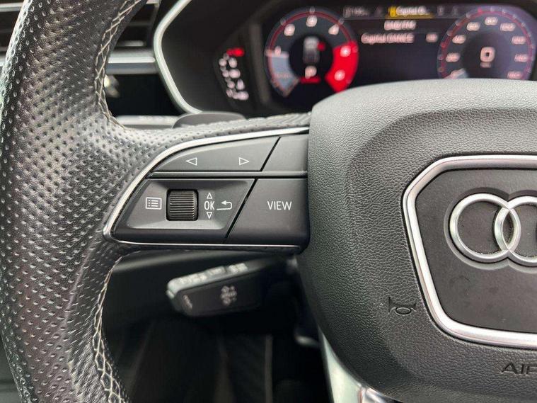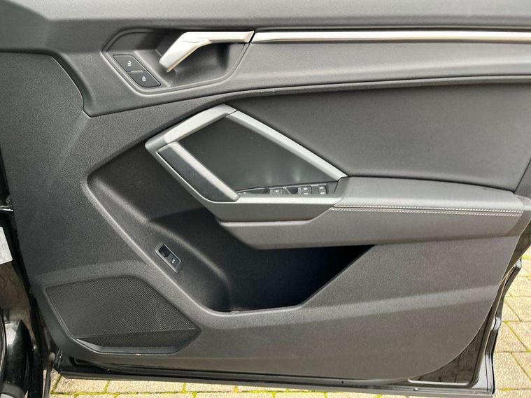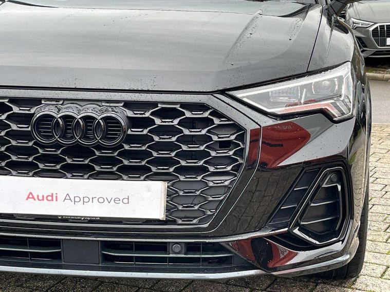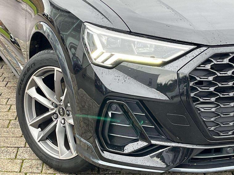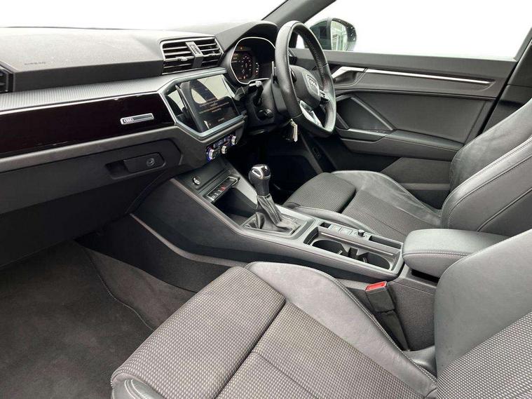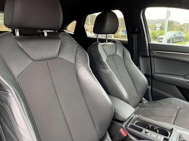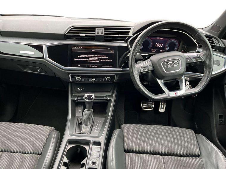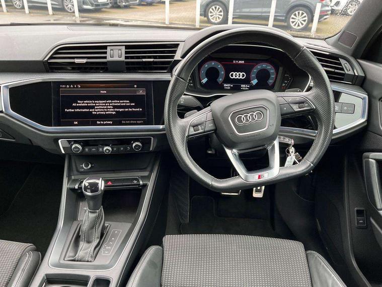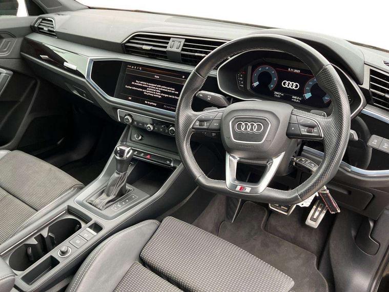 Audi drive select, Audi lane departure warning, Audi Virtual Cockpit - 10.25" display, Bluetooth interface, Camera based traffic sign recognition, Legal emergency call, MMI Navigation Plus with high resolution 10.1 inch touchscreen colour display, Power operated tailgate, Progressive steering, Service interval indicator, Smartphone interface includes wireless Apple carplay/Android Auto, Start stop system with recuperation, Voice control system with natural language interaction, Diesel particulate filter, Sports suspension, 2 USB-C ports with charge and data functions, 6 passive loudspeakers, DAB digital radio module, Acoustic windscreen, Auto dimming frameless rear view mirror, Diffuser grille in grained matt black, Diffuser trim in selenite silver, Electrically folding, adjustable and heated door mirrors with integrated LED side indicators and kerb view function for passenger side, Front and rear electric windows, Front fog lights, Front underbody protection in manhattan grey paint finish, High gloss black finish B and C pillars, LED Dynamic rear indicators, LED headlights with LED daytime running lights, LED rear lights, LED third brake light, Privacy glass dark tinted rear and rear-side windows (from B-pillar backwards), Rain and light sensors, Rear side wing doors, Rear underbody protection in matt black, Rear wiper, Variable front intermittent wipers, 12V socket in rear centre console, 3 seat bench in 2nd row, 40:20:40 folding with manual adjustment for 60:40 forwards/backwards position and backrest angle, Adjustable rear seat bench/backrest with centre armrest and cupholder, Black cloth headlining, Dual zone electronic climate control, Front and rear black floor mats with contrast stitching, Front and rear headrests, Front and rear roof module including reading lights, Front centre armrest, Glove compartment lighting, Height and reach adjustable steering wheel, Illuminated door sill trims with S logo, ISOFIX child seat mounting for front passenger with airbag deactivation and outer rear seat including top tether attachment point for outer rear seats, Luggage compartment light right in white, Luggage compartment sill protection in stainless steel, Manual front seats with height adjustment, Perforated leather gearknob, Single front passenger seat, Stainless steel pedals, Ambient lighting pack - Q3, Black styling pack - Q3, Non smoking pack - Q3, 3x3 point rear seatbelts, 6 airbags - Driver, front passenger, curtain and side windows, Audi pre-sense front with pedestrain and cyclist recognition, Electrically operated child locks on rear doors, Electromechanical parking brake, Electronic stabilisation control including ABS, ASR and EDL, Front seatbelt reminder, Hill descent control, Hill hold assist, Pre sense basic, Seatbelt monitoring, Tyre pressure warning, Warning triangle and first aid kit, Anti theft alarm, Anti theft wheel bolts, Immobiliser, Remote central locking, Aluminium look interior elements, Black dashboard, Detail dashboard around MMI touch colour display in glass look, black with surround in aluminium look, Leatherette door armrest, Piano black inlay, 19" 5 twin arm design diamond cut audi sport alloy wheels in matt grey look,
