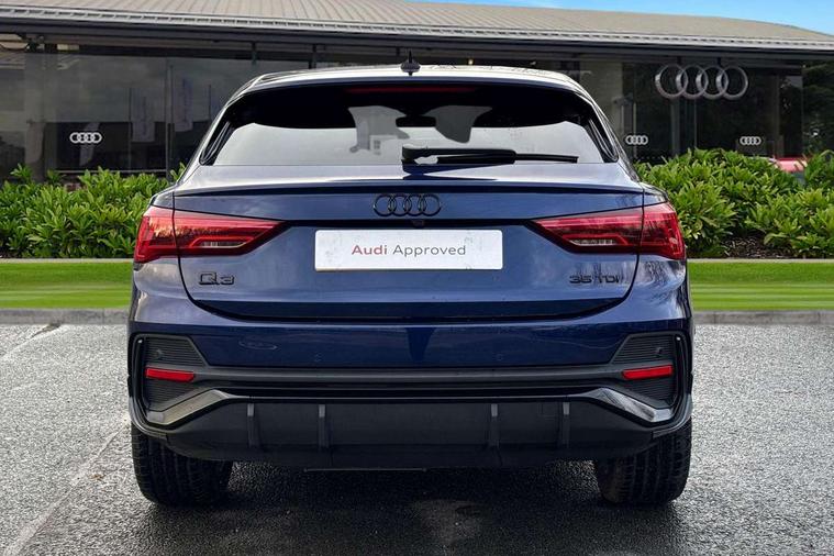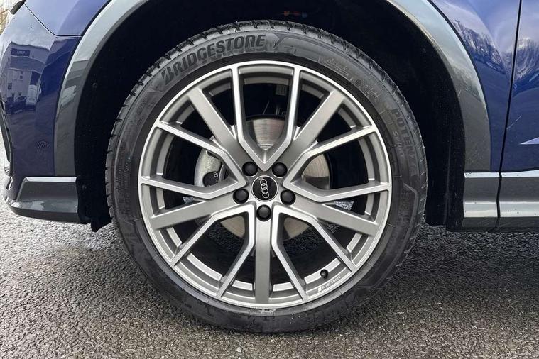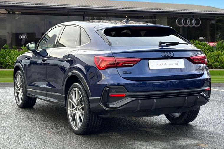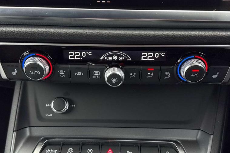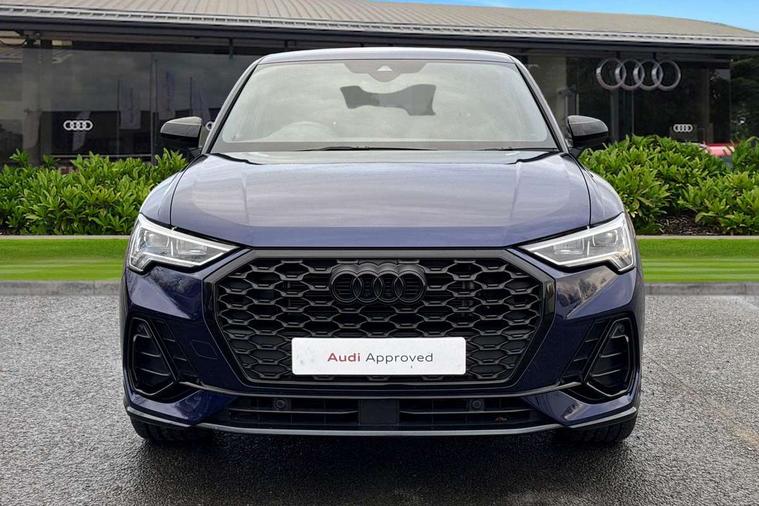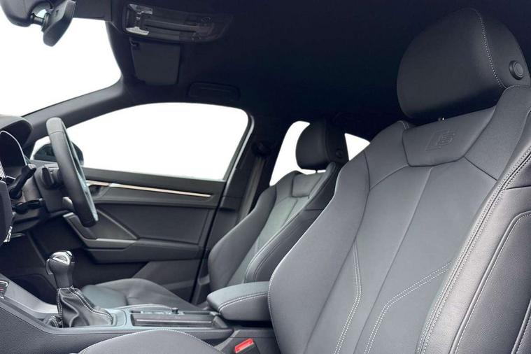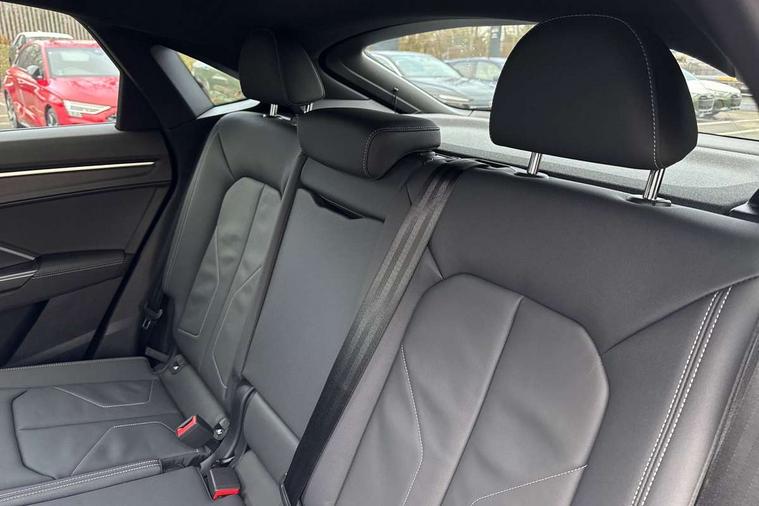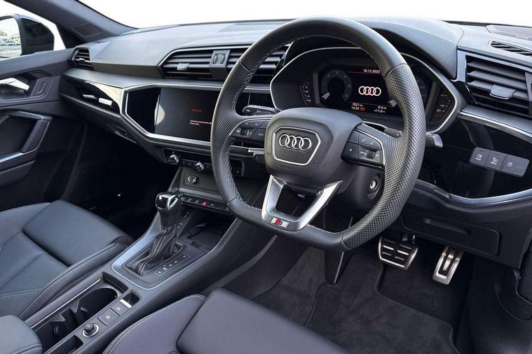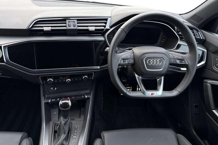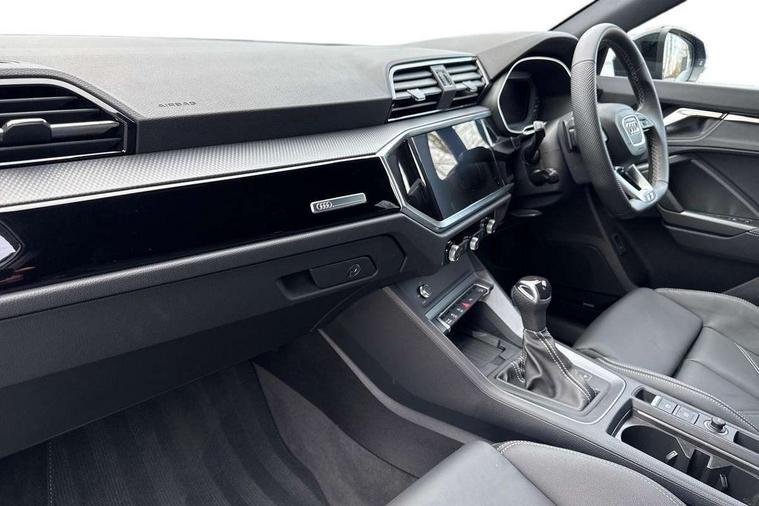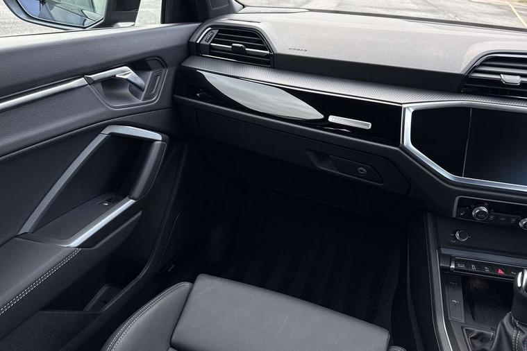 Audi connect safety and service, Audi drive select, Audi lane departure warning, Audi Virtual Cockpit - 10.25" display, Bluetooth interface, Camera based traffic sign recognition, Distraction and Fatigue warning, Legal emergency call, MMI Navigation Plus with high resolution 10.1 inch touchscreen colour display, Power operated tailgate, Progressive steering, Service interval indicator, Smartphone interface includes wireless Apple carplay/Android Auto, Start stop system with recuperation, Voice control system with natural language interaction, Diesel particulate filter, Sports suspension, 2 USB-C ports with charge and data functions, 6 passive loudspeakers, DAB digital radio module, Acoustic windscreen, Audi Beam uses LEDs to project the Audi logo onto the ground as you exit your Q3, Auto dimming door mirrors, Auto dimming frameless rear view mirror, Electrically folding, adjustable and heated door mirrors with integrated LED side indicators and kerb view function for passenger side, Front and rear electric windows, Front fog lights, Front underbody protection in manhattan grey paint finish, High gloss black finish B and C pillars, Honeycomb design radiator grille in matt anthracite black, LED Dynamic rear indicators, LED headlights with LED daytime running lights, LED rear lights, LED third brake light, Privacy glass dark tinted rear and rear-side windows (from B-pillar backwards), Rain and light sensors, Rear diffuser grille in grained matt black, Rear diffuser strip in matt anthracite black, Rear side wing doors, Rear underbody protection in matt black, Rear wiper, S line front and rear bumpers and side skirts in contrasting Manhattan grey paint finish, Variable front intermittent wipers, 12V socket in rear centre console, 3 seat bench in 2nd row, 40:20:40 folding with manual adjustment for 60:40 forwards/backwards position and backrest angle, Adjustable rear seat bench/backrest with centre armrest and cupholder, Black carpet mats, Black cloth headlining, Dual zone electronic climate control, Electric lumbar support, Front and rear black floor mats with contrast stitching in rock grey, Front and rear headrests, Front centre armrest, Height and reach adjustable steering wheel, Illuminated door sill trims with S logo, ISOFIX child seat mounting for front passenger with airbag deactivation and outer rear seat including top tether attachment point for outer rear seats, Luggage compartment sill protection in stainless steel, Manual front seats with height adjustment, Perforated leather gearknob, Single front passenger seat, Stainless steel pedals, Twin leather upholstery with front sport seats + S embossing, Black styling pack - Q3, Non smoking pack - Q3, 3x3 point rear seatbelts, 6 airbags - Driver, front passenger, curtain and side windows, Audi pre-sense front with pedestrain and cyclist recognition, Electrically operated child locks on rear doors, Electromechanical parking brake, Electronic stabilisation control including ABS, ASR and EDL, Front seatbelt reminder, Hill descent control, Hill hold assist, Pre sense basic, Seatbelt monitoring, Tyre pressure warning, Warning triangle and first aid kit, Anti theft wheel bolts, Immobiliser, Remote central locking, Thatcham approved category 1 anti theft alarm, Aluminium look interior elements, Detail dashboard around MMI touch colour display in glass look, black with surround in aluminium look, Leatherette door armrest, Piano black inlay,
