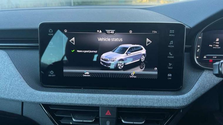 Advanced driver attention and drowsiness monitor, Bluetooth system, E-call, Front assist system, PAS, Rear parking sensors, Rear view camera, Service indicator, Speed limiter, Traffic sign recognition, Virtual cockpit with 10.25" display, Voice control system, Wireless smartlink, 4 USB C ports, 8 Speakers, 9.2" Skoda navigation display, DAB Digital radio, Auto dimming rear view mirror, Automatic headlight control with coming home and leaving home feature, Black roof rails, Body colour bumpers, Body colour door mirrors and handles, Chrome grille surround, Front and rear electric windows, Full LED headlights, Heated rear window, LED brake lights, LED daytime running lights, LED front turning lights, LED high beam, LED low beam, LED third brake light, Rear LED fog light, Rear side wing doors, Rear wiper, Ticket holder inside windscreen, 12V socket in luggage compartment, 3 seat bench in 2nd row, Black hotstamping, Cargo elements, Chrome inner door handles, Driver and passenger sun visors with vanity mirror, Dual zone climate control, Front and rear roof lights, Front centre armrest, Front head restraints, Glove compartment with illumination, Height adjustable driver seat, Height adjustable front passenger seat, Ice scraper, Inner circulation control with pollen filter, ISOFIX on front passenger seat, Isofix preparation for back seats, Krepp recycled decor inserts, Leather gearknob and handbrake lever, Loft cloth upholstery, Manual lumbar support for front seats, Net package and top tether hooks in boot space, Net under rear shelf, Overhead glasses storage compartment, Pocket on the back of both front seats include mobile phone pockets, Rake/reach adjustable steering wheel, Reading lights, Satin black door inserts, Single front passenger seat, Textile floor mats, Third rear headrest, Top tether for front passenger seat, Umbrella in driver's door, 3x3 point rear seatbelts, Airbags - driver and front passenger, Disc brakes, ESP, Extended and predictive pedestrian/cyclist protection, Front passenger airbag deactivation switch, Front side airbags with curtain airbags, Hill hold control, Manual leather parking brake, Manual rear child locks, One tone horn, Seatbelt reminder for driver an co-driver, Traction control, Tyre pressure monitor, Anti-theft alarm system with interior monitoring, backup horn, towing protection and remote central locking with SAFE system, Anti-theft wheel bolts, Electronic engine immobilizer,