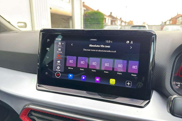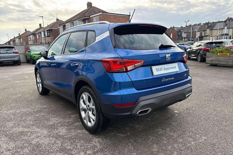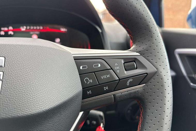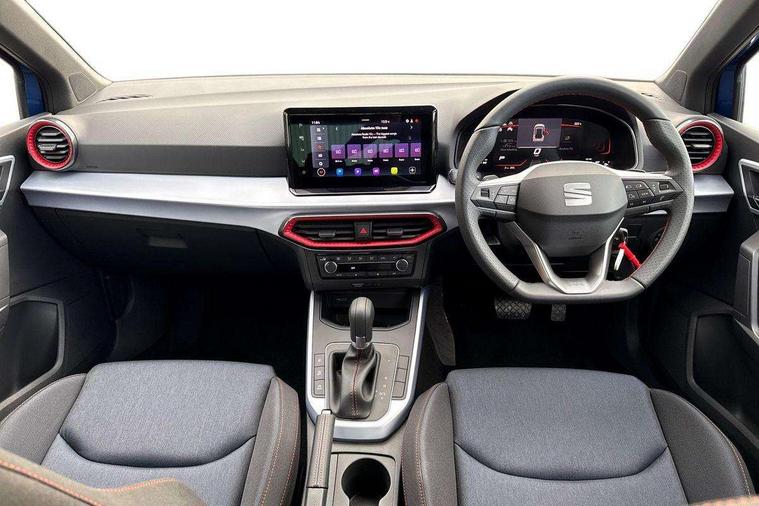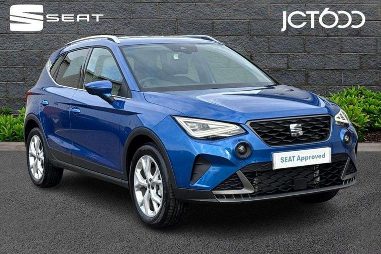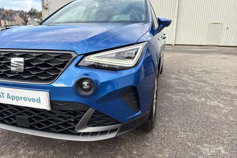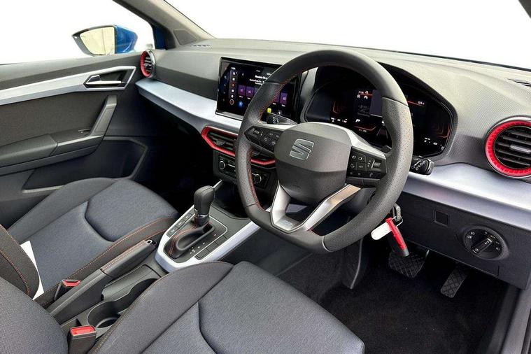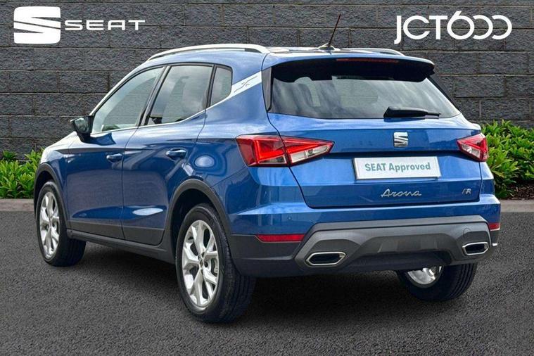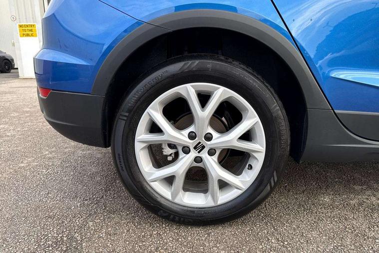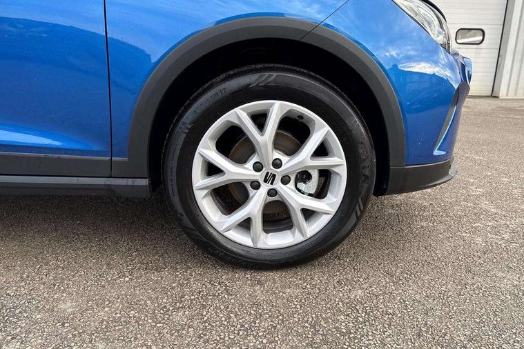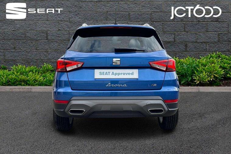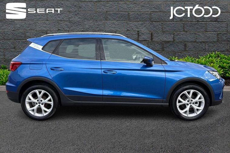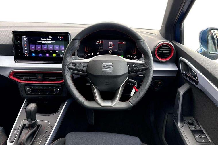 'Lights On' Reminder warning buzzer, 8" Digital cockpit, Digital clock, E-call, Electric speed sensitive power steering, Full link smartphone integration with mirror link, wireless apple carplay, Google android auto + USB Type C cable for apple and android devices, Lane keeping system, Low fuel warning light, Outside temperature display, RPM counter, SEAT Drive profile - Four different models normal-sport-eco-individual, steering response, throttle response and gear shifts mode, Trip computer, Wireless phone charger, 9.2" colour touchscreen with navigation system, voice control and USB port (type c), Bluetooth interface for hands free and audio streaming, DAB digital radio and AM/FM radio, Steering wheel mounted audio controls, Anti theft roof antenna, Auto dimming interior rear view mirror, Automatic activation of hazard warning lights, Body coloured bumpers, Body coloured door handle inserts, Chrome roof rails and window surrounds, Dark tinted rear windows, Electric front/rear windows, Electrically adjustable, heated and folding door mirrors, Front fog lights with cornering function and rear fog light, FULL LED automatic headlights with dynamic headlight range control, coming and leaving home, LED daytime running lights, LED rear tail lights and licence plate lights, Protective side mouldings, Rain sensing wipers, Rear side wing doors, Rear spoiler, Rear window wash/wipe, Roof colour door mirrors, Third brake light, Twin exhaust pipe styling hidden exhaust pipe, Visible VIN plate, 2 cupholders, 3 seat bench in 2nd row, 60/40 split folding rear seat, Aircare filter, Black interior roof, Cloth upholstery, Double boot floor, Driver sunvisor with covered mirror + card holder, Dual zone climate control, Front courtesy light with front reading lights, Gear shift indicator, Height adjustable front seats, Height/reach adjustable steering column, Illuminated air vent surrounds, Illuminated boot, Instrument lighting with brightness control, Interior ambient lighting, Interior light in footwell, central console and door panel, ISOFIX points in outer rear seats with top tether anchorage points, Passenger sunvisor with vanity mirror, Perforated flat bottomed leather steering wheel/gear knob/handbrake with red stitching and FR logo, Potentiometer, Single front passenger seat, Steering wheel mounted gearshift paddles, Two front and three rear height adjustable headrests, Interior chrome pack - Arona, Safe and driving pack (S) - Arona, 3 point seatbelts on all rear seats, ABS, Active front headrests, Child locks on rear doors, Driver and front passenger airbags with front passenger airbag de activation, front side and curtain airbags, Emergency Brake Assist (EBA) and front assist, Front and rear seatbelt reminder, Hill hold control, Multi-Collision braking, Tiredness recognition system, Traction control, Tyre pressure monitoring system, Alarm with back up horn with tow away protection, Deadlock, Electronic engine immobiliser, Locking wheel bolts, Remote central locking, Titan black dashboard, 17" Dynamic alloy wheels,