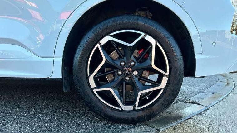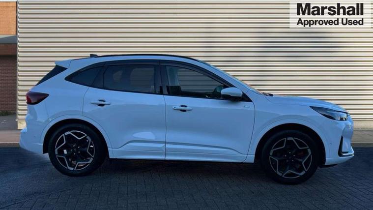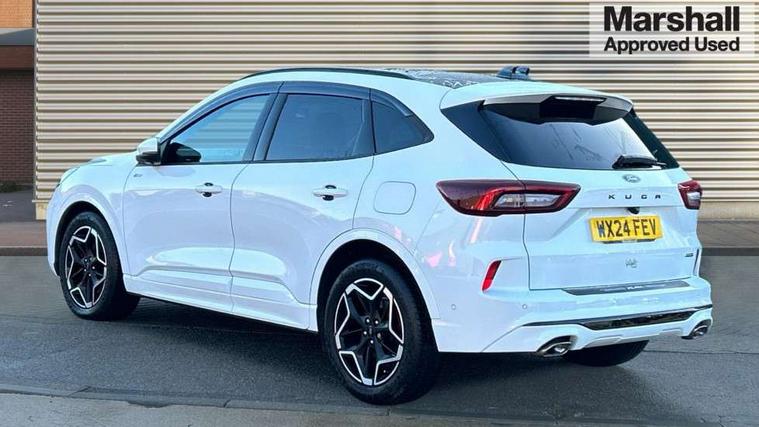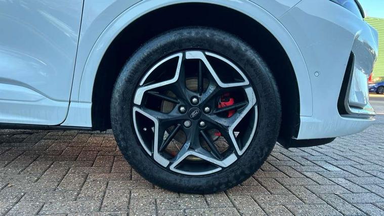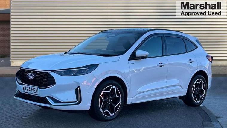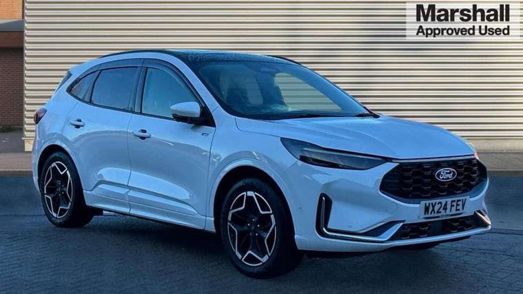 12.3" digital colour instrument cluster, 360 degree camera, e-Call (emergency call), Ford easy fuel, Ford SYNC 4 Navigation with 13" touchscreen, DAB radio, emergency assistance, Andriod Auto/Apple CarPlay, 5G modem & Ford Pass connect, Front and rear parking sensors, Hands free power tailgate, Lane centering assist, Lane keeping aid with lane departure warning, Power assist steering, Selectable drive modes, Service interval indicator, Sports suspension, Twist beam rear suspension, B&O premium audio system with 10 speakers, subwoofer and 2 USB ports, Auto headlamps with high and low beam, Black roof rails, Body colour bumpers, Front LED fog lamps, Large rear spoiler, LED daytime running lights, LED rear lights, Pop out door edge protectors, Power front/rear windows with global close, Power heated folding door mirrors with puddle lights, memory function and camera, Power opening panoramic roof, Quickclear heated windscreen, Rain sensing wipers, Rear privacy glass, Rear side wing doors, Rear wiper, ST-Line body styling kit, Third brake light, 12 way ergonomic power adjust driver's seat with memory (AGR certified), 12 way ergonomic power adjust passenger seat (AGR certified), 2nd row sliding seats, Electronic automatic temperature control (EATC), Front and rear head restraints, Partial premium touch sensico upholstery, Rear centre head restraint, Single front passenger seat, Sports seats, Driver assistance pack with intelligent adaptive cruise control - Kuga FHEV/PHEV, Winter pack - Kuga, 3x3 point rear seatbelts, Airbags - front driver/passenger, front and rear curtain, Drivers knee airbag, Dynamic brake support, Electronic stability control (ESC) and ABS, Evasive steering assist, Ford MyKey Gen 2 safety system, Manual child proof rear door locks, Pre collision assist with autonomous emergency braking, Rear seat Occupancy alert, Red brake calipers, Tyre pressure monitoring system, Engine immobiliser, Keyless entry and Ford power start button (Keyless start), Locking wheel nuts, Remote powered central double locking doors, Thatcham category 1 alarm,
