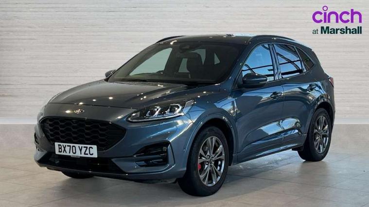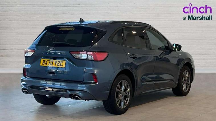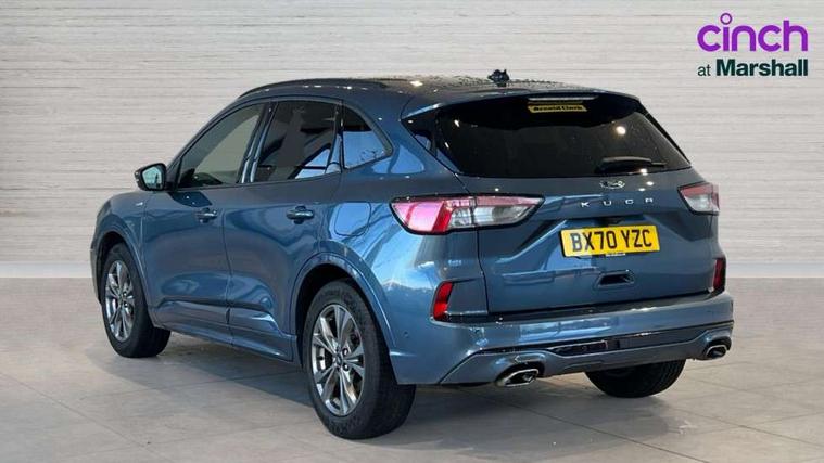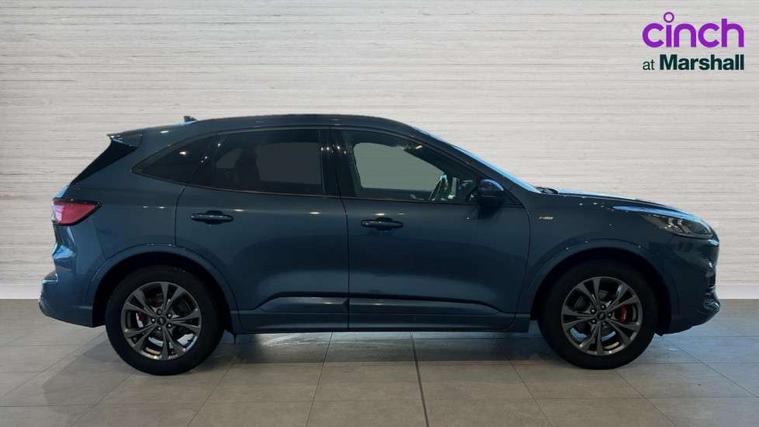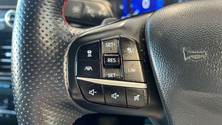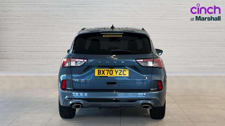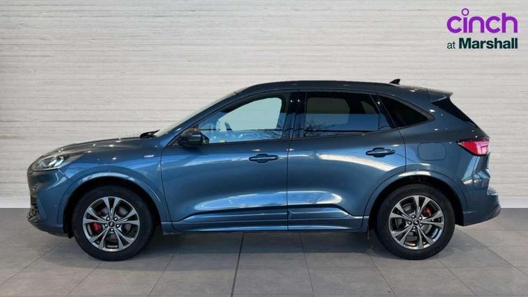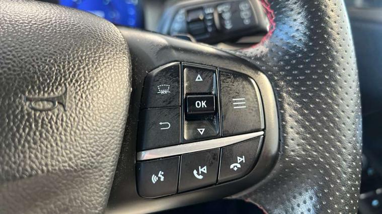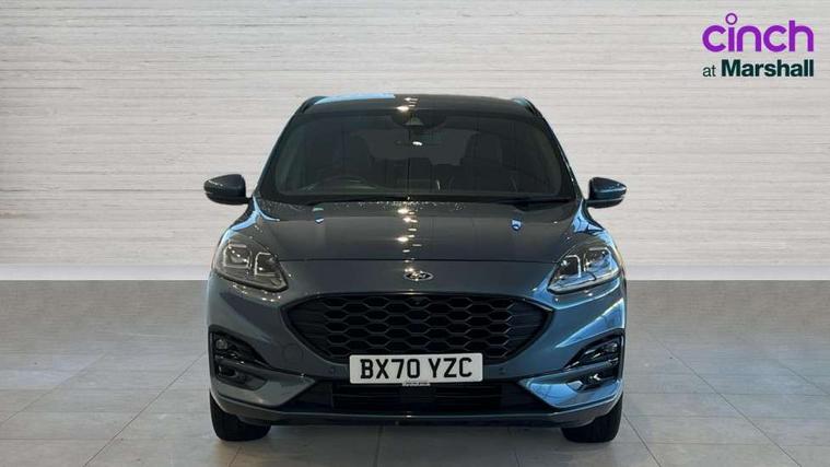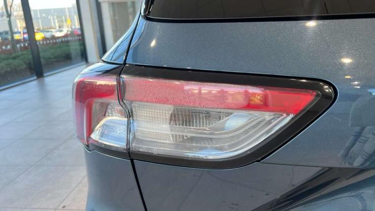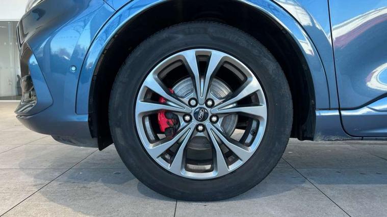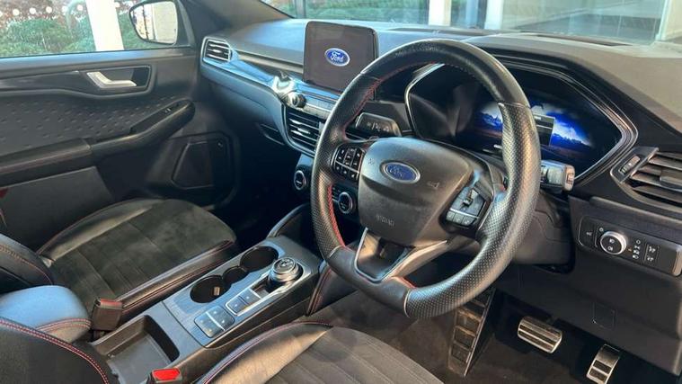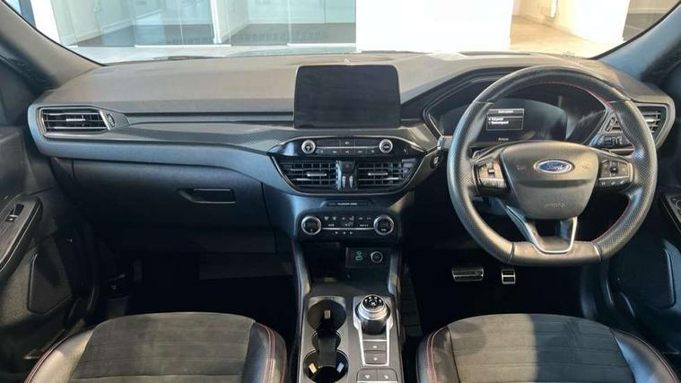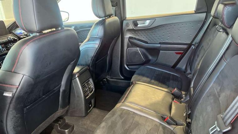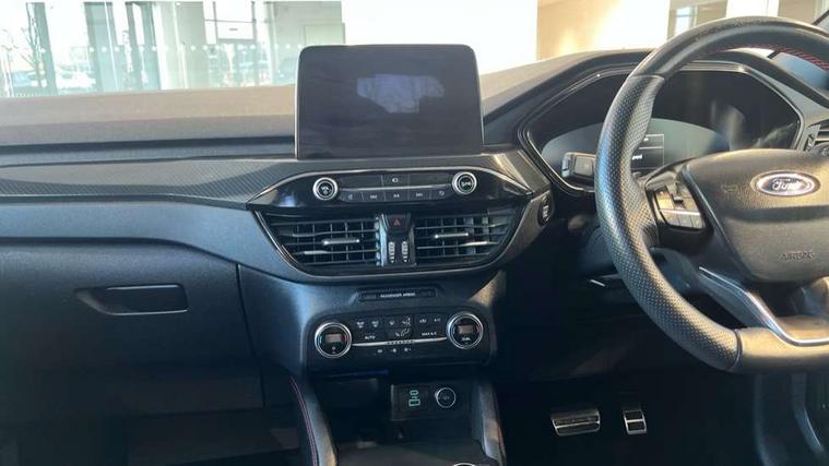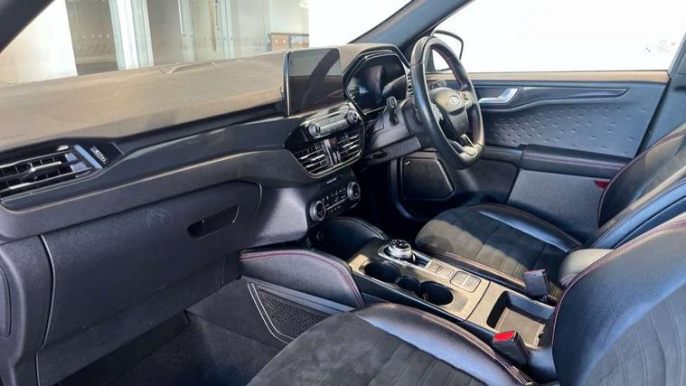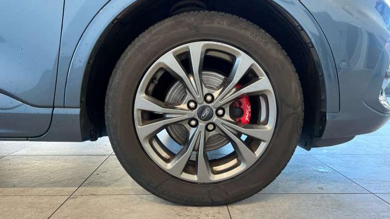 Active park assist, Adaptive cruise control with Stop and Go, BLIS (Blind spot information system), Driver impairment monitor, Eco coaching, Ford easy fuel, Front and rear parking sensors, Front and rear view camera, Hands free power tailgate, Head up Display, Intelligent speed assist, Lane keeping aid with lane departure warning, Mobile phone wireless charging pad, Power assist steering, Selectable drive modes, SYNC 3 with navigation, DAB audio, Sports suspension, Auto dimming rear view mirror, Auto headlamps with high and low beam, Auto wipers, Black roof rails, Door edge guards, Electrically operated front and rear windows, Front LED fog lights with cornering function, Full LED quad projector headlamps with glare free, Large rear spoiler, LED daytime running lights, LED rear lights, Power folding heated door mirrors with puddle lights, Power front/rear windows with global close, Privacy glass, Quickclear heated windscreen, ST Line badges in exterior and interior, ST Line front scuff plates, Twin exhausts, 2nd row sliding seats, 8 way manual passenger seat including lumbar support and height adjust, Alloy pedals, Ambient lighting, Centre console with electronic parking brake, Dark headlining and pillars, Dual electronic automatic temperature control, Flat bottomed leather steering wheel in sensico with red stitching, Front and rear head restraints, Partial leather manual track seat, Rear charging point, Sensico partial premium leather upholstery, Sports seats, ST Line front and rear floor mats, Steering wheel mounted paddle shift, B&O with large instrument cluster pack - Kuga, ST Line body styling kit - Kuga, 3x3 point rear seatbelts, Airbags - front driver/passenger, front and rear curtain, Drivers knee airbag, Electronic stability control (ESC) and ABS, Ford MyKey Gen 2 safety system, Hill launch assist, Post collision braking, Powered child proof rear door locks, Pre collision assist with autonomous emergency braking, Red brake calipers, Tyre pressure monitoring system, Engine immobiliser, Keyless entry, Keyless start with 'Ford Power' starter button, Locking wheel nuts, Remote powered central double locking doors, Thatcham category 1 alarm,