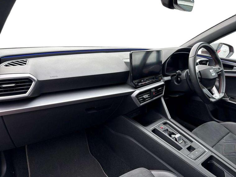 Digital cockpit, Front assist with forward collision warning braking reaction to vehicles, pedestrians and cyclists, Full link smartphone integration with Mirror Link, wireless Apple CarPlay and wired Google Android Auto, Lane keeping system, Park assist (inc front/rear parking sensors), Power assisted speed sensitive electro-mechanical steering, RPM, trip computer, outside temp gauge, instrument light brightness, low fuel warning light, lights on reminder, gearshift indicator, SEAT drive profile with 4 modes (Eco/Normal/Sport/Individual), throttle response and gearshift mode, Service interval indicator, Start/stop system with regenerative braking, Sports suspension, XDS electronic differential lock and dynamic traction support, Auxiliary input socket, Auto dimming rear view mirror, Body colour door handles, Body coloured bumpers, Dark tinted rear windows, Door mirror LED indicator lights, Electric adjustable/heated/folding door mirrors with memory, Electric front/rear windows, FR sports bumper, Illuminated front door sill, LED front fog lamps with cornering function, LED headlights and tail lights with dynamic turn signals, welcome light silhouette from exterior mirrors and dynamic headlight range control, LED rear fog lamp, Rain sensing wipers, Rear wash/wipe, Separate daytime running light with automatic headlight control and coming home feature, 12v power point in centre console, 60/40 split rear bench seat with armrest, Ambient lighting in door trim, Black headlining, Driver/passenger manual seat height adjustment, Dust/pollen filter, Folding boot cover, Front and rear height adjustable headrests, Front and rear reading lights X 4, Front centre armrest, Front seatback storage pockets, Height/reach adjust steering wheel, Interior lighting with LED lighting in sunvisor, glovebox and rear headlining, ISOFIX points in outer rear seats with top tether anchorage points, Luggage tie-down hooks, Lumbar adjustment for front seats, Microsuede cloth upholstery, Sunvisors with covered illuminated mirror, Three zone climate control, Tool kit, Wraparound lighting, Media system plus with navigation - Leon, 3 point seatbelts on all rear seats, ABS, Brake control system - ESC and brake booster, Child proof door locks, Driver and front passenger airbags with front passenger airbag de-activation, front side and curtain airbags, Electronic parking brake, Extended safety system - seat belt tensioner, window closure and hazard lights, Hill hold control, Rear disc brakes, Seat belt reminder for front and rear seats, Tiredness recognition system, driver alert system, Tyre pressure monitoring system, Anti theft alarm system with interior monitoring in cab, backup horn and towing protection, KESSY Go (Keyless start), Lockable tailgate, Locking wheel bolts, Wireless phone charging, Chrome interior detailing, 18" Performance machined alloy wheels with 92Y tyres,
