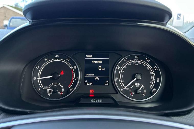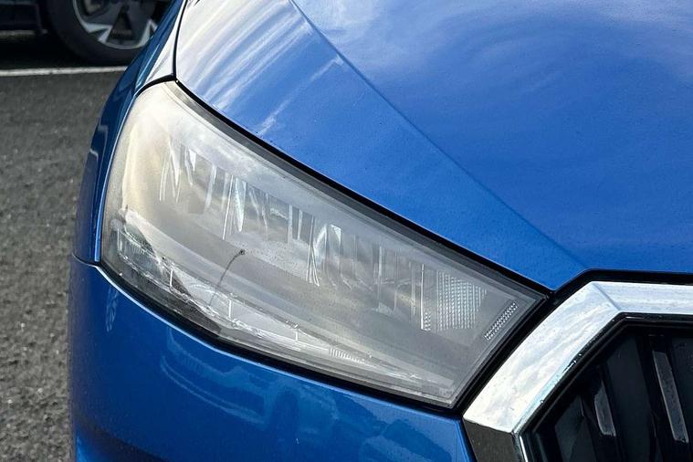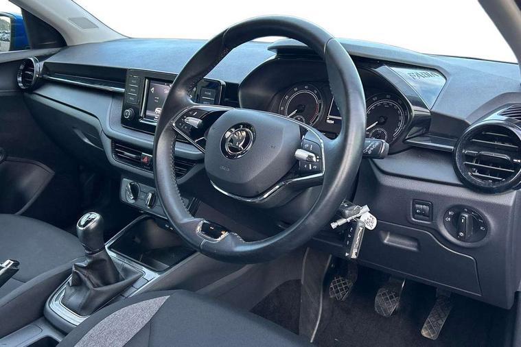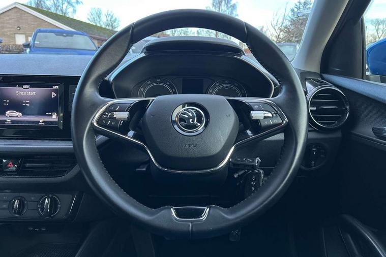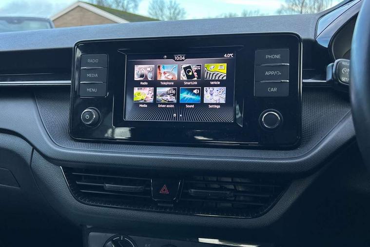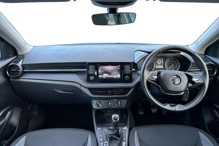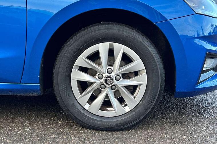 Bluetooth connection, Driver alert system - DAS, Electromechanical power steering, Exterior temperature gauge, Lane assist including road edge detection, Multifunction trip computer in black and white, Service interval indicator, Speed limiter, 2x USB-C in the front (for data transmission and charging), 4 speakers in front, Auxiliary socket for external MP3 player, DAB digital radio reception, Radio Swing with 6.5" colour display, Basic LED Headlights, Basic rear lights, Body colour door mirrors, Body coloured bumpers, Dimming rear view mirror with black frame, Door mirror integrated indicators, Electrically adjustable and heated door mirrors, Electrically adjustable front windows with function auto up/down, Front fog lights, Front window wiper intermittent control, Headlight range control - Automatic, Ice scraper in fuel cap, LED daytime running lights with coming and leaving home feature, Mechanical adjustable rear windows, Rain sensor, Rear LED fog light, Rear side wing doors, Rear window wiper with washing nozzles, Roof mounted spoiler, SKODA tailgate lettering in chrome, Third brake light, 2 reading lights in front and 2 reading lights in rear, 2 spoke leather multifunction steering wheel, 3 rear headrests, Backrest split and folding, Central console with fixed cup holder and storage box, Chrome handbrake release button, Fabric upholstery, Gearshift knob/handle in leather, Grain satin black interior door handles, Hand brake lever handle in leather, Height adjustable front headrests, Height adjustable front seats, Height adjustable steering wheel, ISOFIX and TopTether anchorage points to the outer rear seats, ISOFIX and TopTether on the front passenger seat, Luggage compartment lighting, Manual air conditioning, Manually adjustable lumbar support in front seats, Pollen filter, Rear seat bench unsplit, Single front passenger seat, Storm grey headlining, Sun visors with mirror and airbag label on passenger side, Ticket holder, 3-point height adjustable front seats belts with pretensioner and force limiter, Automatic warning lights in case of crash, Driver and passengers airbag with switch off function, e-Call+, ESC including ABS, MSR, ASR, EDS, HBA and XDS, Front and rear seat belt warning, FRONT ASSIST (AEB City and AEB Inter Urban), Front side airbags, Head airbags, One tone horn, Pedestrian protection, Three rear 3-points safety seat belts with pretensioner and force limiter including stop function for outer rear seat belts, Tyre pressure monitoring system, Anti-theft alarm system including immobiliser, interior monitoring, backup horn, and towing protection, Central locking with radio remote control, interior controls, SAFE function and 2 foldable keys, Black painted air vents, Glossy black decorative trim, Grain satin black central console cover, Grain satin black lower decorative trim, Satin black door and side trim panel in front, Anti-theft wheel bolts protection, Super-low rolling resistance tyres,