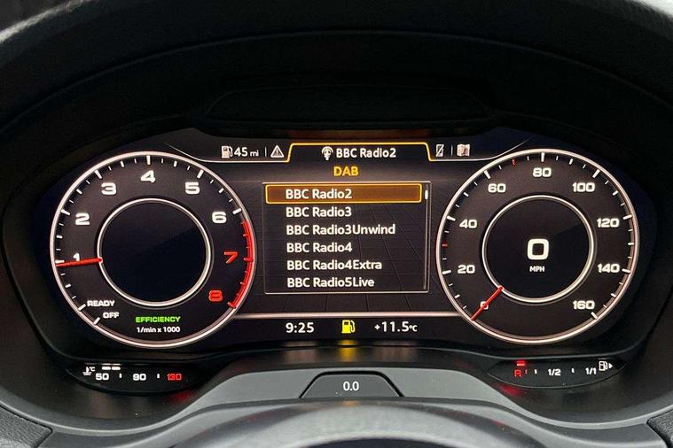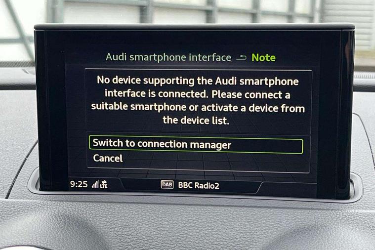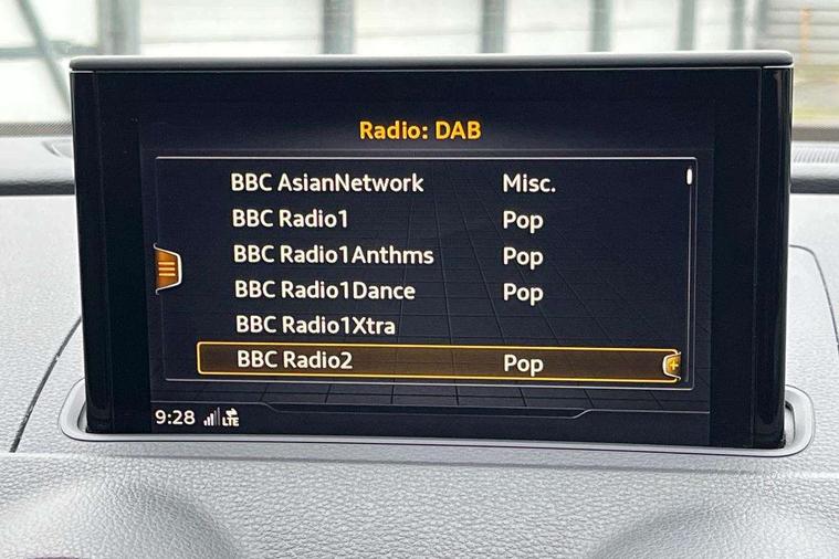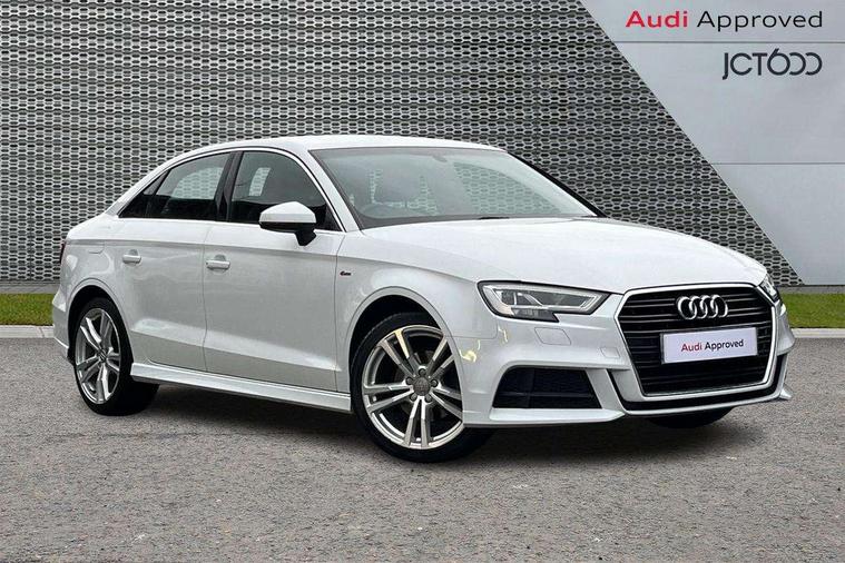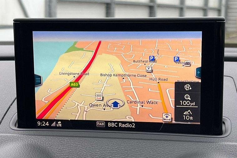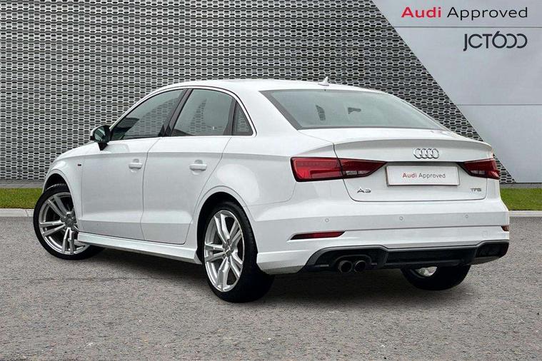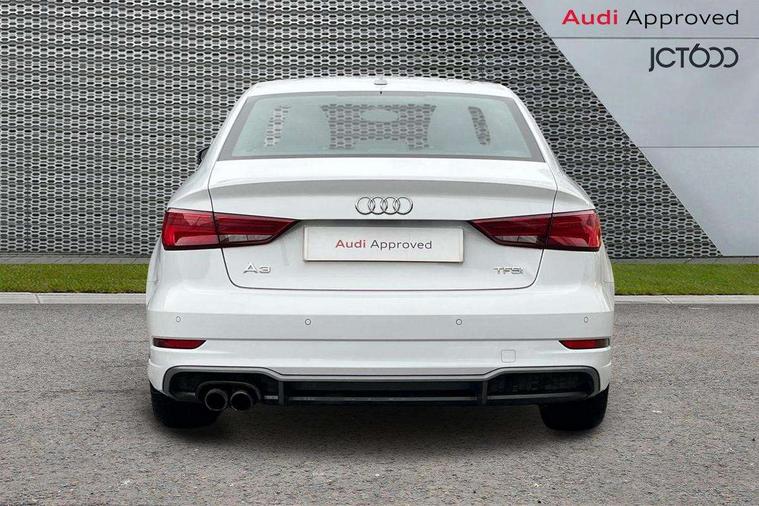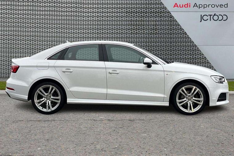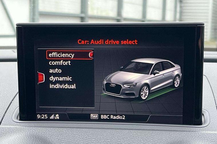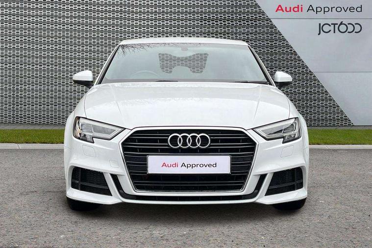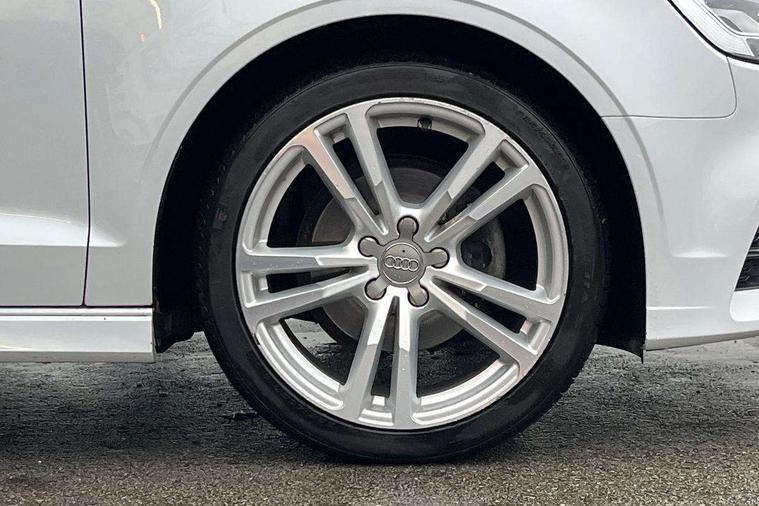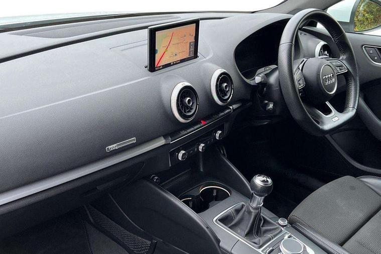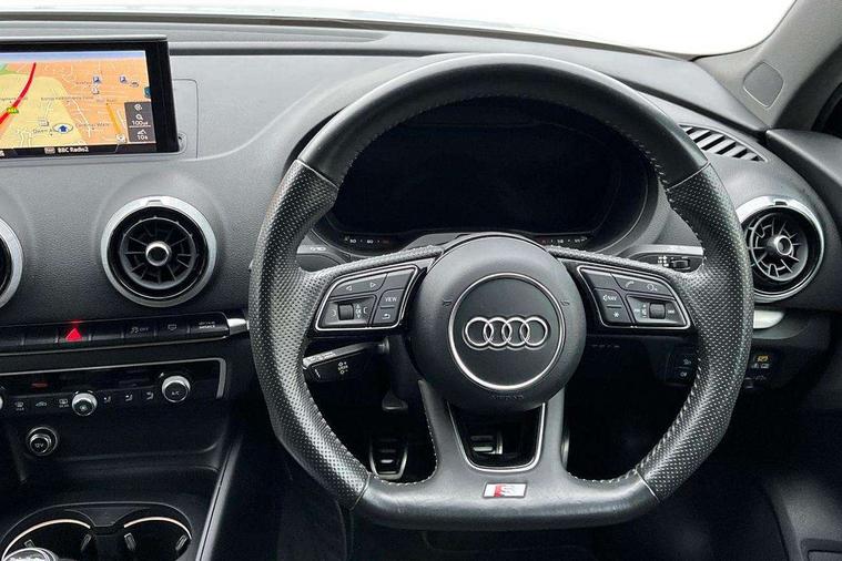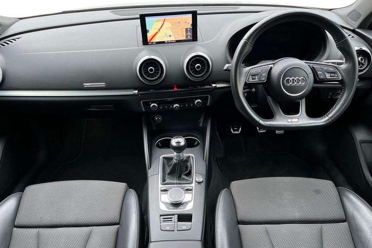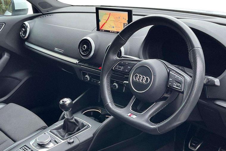 Audi connect, Audi drive select, Audi smartphone interface, Bluetooth interface, Colour driver's information system display, Electro-mechanical PAS, SD card based satellite navigation system, Service interval indicator, Voice control system, 2 USB ports, Audi music interface, Aux-in socket, CD player, DAB Digital radio, MMI radio plus with 7" colour MMI screen and MMI controller, Aluminium side window trim, Automatic lights and wipers, Body colour bumpers, Body colour door mirrors with integral indicators, Body colour roof spoiler, Chrome exhaust tailpipes, Electric operated/heated door mirrors, Front and rear electric windows, Heated rear window, Heated windscreen washer jets, High gloss dark chrome radiator grille, LED daytime running lights, S Line body styling, 3 adjustable rear headrests, 3 spoke flat bottomed multi-function leather steering wheel, 4 lashing points to secure luggage, Adjustable front armrest, Black cloth headlining, Driver/passenger sunvisors, Dual zone electronic climate control, Front and rear interior lights with delay, Front sports seats, Front/rear floor mats, Height/depth adjustable steering column, Illuminated door sills, Illuminated glovebox, ISOFIX child seat preparation+airbag deactivation, Jack and tool kit, Stainless steel pedals, Storage compartment in centre console, Storage compartments in doors, Storage under driver's seat, LED interior light pack - A3/RS3, Non smoking pack - A3, Storage and luggage pack - A3/RS3, 3 point seatbelts on all seats, ABS/EBD, ASR, Curtain airbags, Driver and passenger side airbags, Driver/Front Passenger airbags, Drivers knee airbag, EDL, Electromechanical parking brake, ESC - Electronic Stability Control + traction control, Front passenger airbag deactivation, Seatbelt warning, Tyre pressure warning, Warning triangle and first aid kit, Anti theft alarm, Anti-theft wheel bolts, Immobiliser, Remote control central locking, Aluminium air vent surrounds, Aluminium trim elements, Matt brushed aluminium inlays,
