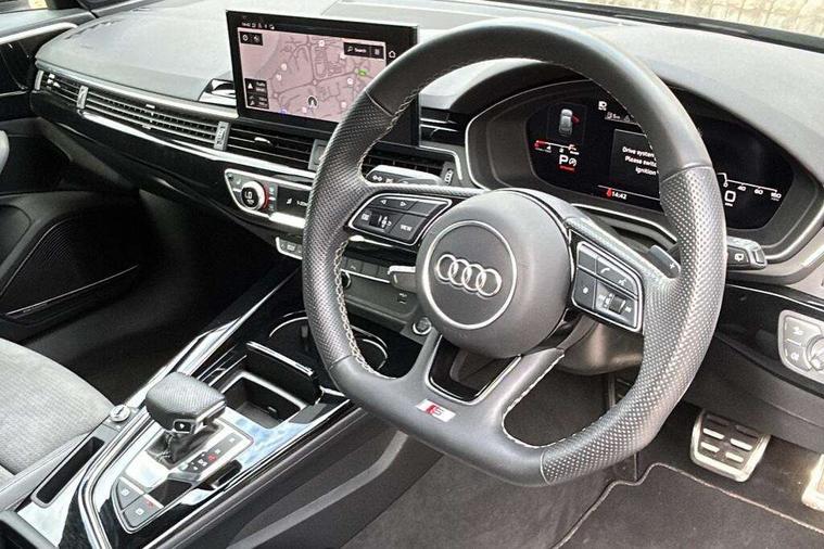 Audi connect safety and service (e-call), Audi drive select, Audi smartphone interface, Audi virtual cockpit, Automatic start-stop system with coasting functionality and efficiency programme, Bluetooth interface, Camera based traffic sign recognition, Electromechanical power steering, Email, calendar and text messages displayed via MMI, Front and rear parking sensors, Lane departure warning, MMI Navigation plus with MMI touch includes 10.1" high resolution colour MMI display, 3D map, Power operated tailgate, Rear view camera, Voice control system, Sports suspension lowered by 23mm, 2 USB charging ports, 8 passive loudspeakers, DAB digital radio reception, Audi beam uses LEDs to project the audi logo onto the ground as you exit your A4, Auto dimming rear view mirror, Black Audi rings and black badging (model name in black badging, no engine badging), Body colour door handles, Body colour front spoiler lip, Body colour side sill trim, Electric adjustable/heated/folding door mirrors with auto dimming, Exhaust tailpipes in high dark chrome, Grained matt black side air inlets with matt aluminium silver inlay, High beam assistant, High gloss black B pillar trims and triangular rear door trim, LED headlights with LED rear lights + dynamic rear indicators + headlight adjustment and high beam, turning light + LED daytime running lights, LED third brake light, Privacy glass, Rain and light sensors, Rear diffuser in matt black with trim strip in matt aluminium silver, Rear side wing doors, Rear wiper, RS4 rear spoiler in body colour, S Line roof edge spoiler, Sport front and rear bumpers with side skirts, Variable intermittent front wash/wipe, Windscreen with acoustic glazing, 4 way electric lumbar support for driver and front passenger, 40/20/40 split folding 3 rear seat bench in 3 parts with rear centre armrest, Black carpets, Black cloth headlining, Black perforated leather gearknob, Contrast stitching on seats, steering wheel and gear lever gaiter, Deluxe 3 zone electronic climate control, Electric load area cover, Front and rear head restraints, Front centre armrest, Heated front seats, Illuminated door sill trims with S logo, ISOFIX child seat mounting and top tether, Manual seat adjustment, Single front passenger seat, Stainless steel pedals and foot rest, Tool kit, Black styling pack - A4 Avant, LED Interior light pack - A4/S4, 3 rear seatbelts, 6 airbags - Driver, front passenger, curtain and side windows, Attention and drowsiness assist, Electronic Stabilisation Control (ESC) including ABS, ASR and EDL, Hill hold assist, Multi collision brake assist, Pop-up bonnet for pedestrian protection, Pre sense city, Rear door child safety locks, Seatbelt monitoring, Warning triangle and first aid kit, Anti theft alarm, Anti theft wheel bolts, Central locking, Keyless Go, Piano black finish inlay, Tyre repair kit,