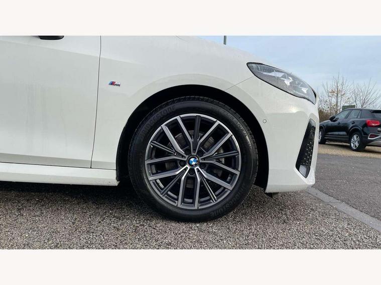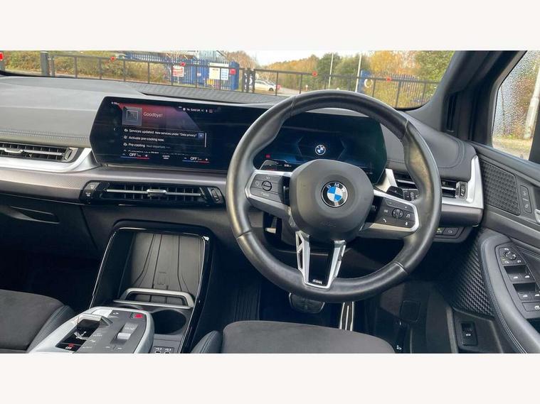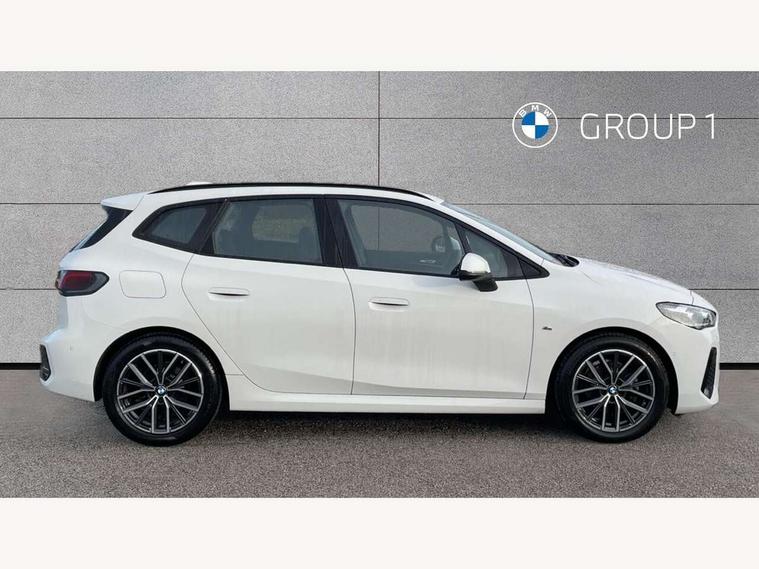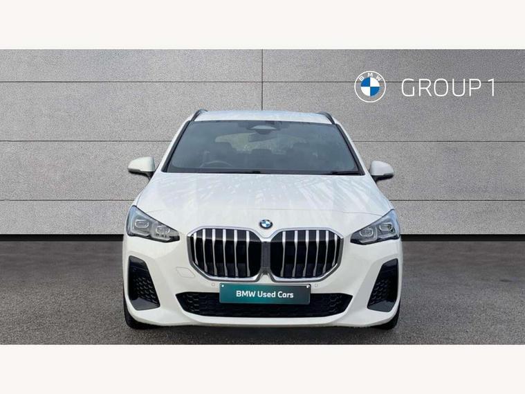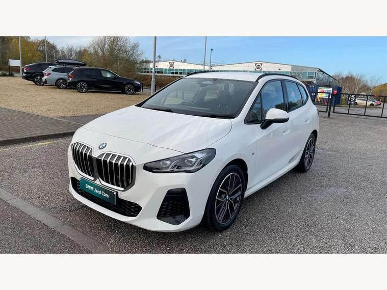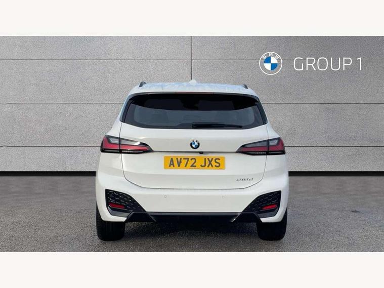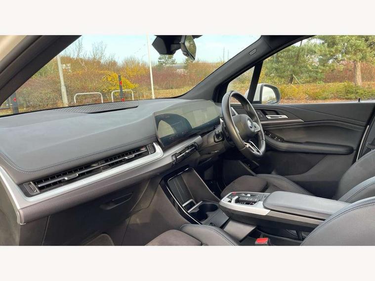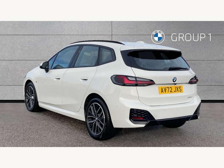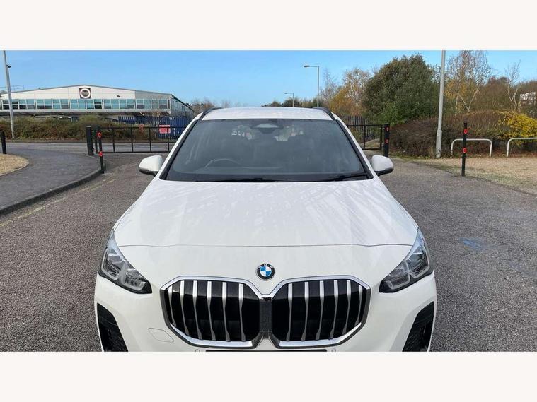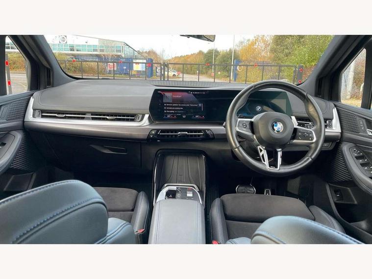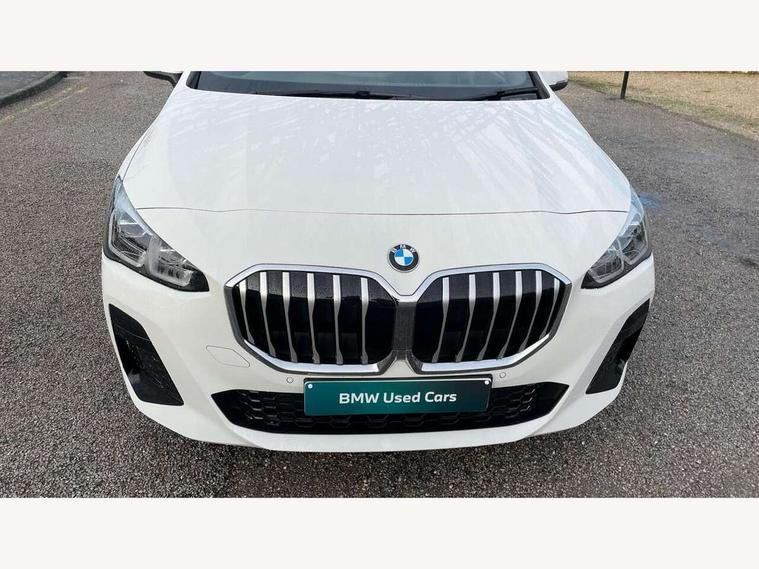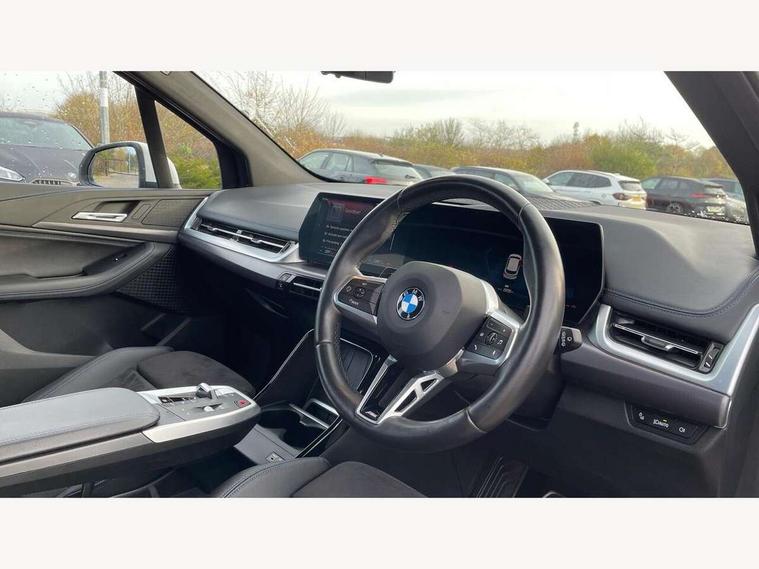 Active Guard incl speed limiting and lane departure functions with auto steering, and front collision warning with brake intervention, Automatic powered tailgate, Automatic start/stop function, BMW Online services, BMW Teleservices, Brake pad wear indicator in front and rear, Condition based service, Drive off assistant, Flat air vents on instrument panel in high gloss black, adjustable slats with elements in pearl chrome, iDrive controller, Language version English, On board computer - average speed+fuel consumption, service interval, clock/date, odometer/trip meter, outside temperature display and ice warning, Parking assistant with active park distance control, reversing assistant, lateral parking aid and rear view camera, Servotronic variable electric power steering (EPS), Smartphone integration, Widescreen display, Diesel particulate filter, Diesel with SCR emission control system, Drive performance control with ECO PRO comfort + sport mode, Gear selector switch with toggle operation, M Adaptive suspension, Steptronic sport transmission with double clutch and gear shift paddles, 2x USB Type C ports in front centre console for charging and data transfer, 2x USB Type C ports in rear centre console for charging, DAB Digital radio, Welcome sound upon opening of the front driver or passenger door, Air inlet middle part on front apron in lines specific design with trim strip in satinised aluminium, Automatic headlights, BMW emblem, engine compartment lid and tailgate, Body colour roof mouldings, Body coloured door mirror caps, Contoured rear roof spoiler in vehicle colour with side aeroblades in black high-gloss, Driver side exterior mirror lighting with BMW logo projection, Dynamic brake lights, Electric adjustable heated door mirrors, Electric windows - front and rear, with open/close fingertip control, anti-trap facility and comfort closing, Folding door handles integrated flush with surface, Front and rear windscreen wipers with heated front washer nozzles, Front bumper cover with independent design in body colour with inserts in black high gloss, Front bumper design elements in satinised aluminium, Front door exit lights, Front door sill finishers aluminium inserts with M inscription, Front entry sills with aluminium inserts + BMW inscription, Front oramental grille with radiator grille bars in satinised aluminium, Heated rear window, Hidden exhaust pipe, High gloss shadow line, High gloss shadowline roof rails, Key with M identification, LED Daytime running lights and parking lights with turn indicators, LED number plate light, LED third brake light in rear spoiler, M identification on sides, Manual headlight range control, Model inscription on right tailgate, Rain sensor, Rear bumper cover with independent design in body colour with inserts in black high gloss, Rear bumper trim strip in satinised aluminium, Rear side wing doors, Shark fin antenna, Side sill covers with independent design in Body colour, Trailer stabilisation logic, Trims on front and rear bumper covers colour-coordinated with side window graphic, Visible VIN plate, Welcome lighting, Windscreen washer nozzle for rear view camera, 12V power socket in luggage compartment and front centre console, 12V socket in right side trim panel, 2 bag hooks in luggage compartment, 2 front reading lights, 2 open cup holders in front centre console, 3 seat bench in 2nd row, 40:20:40 split folding rear seat backrests, Ambient lighting front and rear, Automatic two zone climate control air conditioning, Bottle trays in all doors, Child seat ISOFIX attachment for two outer rear seats and front passenger seat with anchorage points, Driver and front passenger sports seats, Four grab handles integrated in roof lining, Front and rear door pockets, Front and rear footwell lighting, Front and rear side armrest integrated into door trim, Front centre console storage compartment, Front head restraints, Glovebox with light, Heated front seats, Height adjustable 3 rear head restraints, Interior door handle recess light on all doors, Luggage compartment lighting, M Anthracite headlining, M specific floor mats, M sport leather steering wheel, Map pockets, Mechanical rear seats with fore/aft adjustment, Multi-function controls for steering wheel, One piece parcel shelf opens together with tailgate and removable, Rear cloth hooks, Single front passenger seat, Sliding rear seat bench, Stainless steel pedals, Steering wheel column manual adjustment, Storage compartment lighting in centre console and storage tray in centre stack, Storage compartment net in left side trim panel, Storage compartment with folding cover under centre console armrest cushion, Storage tray in right side trim panel, Sunvisors with illuminated vanity mirrors, Three spoke sport leather steering wheel, Connected pack professional - 2 Series Active Tourer, Technology pack - 2 Series Active Tourer - MY22, 3 point seatbelts on all seats, front pyrotechnic belt tensioners, stopper and belt force limiters, rear coded belt buckles, Airbag - Front driver and passenger, front and rear head, front side, curtain head protection, manual deactivation of front passenger airbag possible, Anti lock braking system (ABS) with brake assist, Automatic hold function, BMW emergency call, Brake drying, Braking readiness, Child proof locking system in rear door, Cornering brake control, Crash Sensor - activates hazard/interior lighting + unlocks doors, DSC - Dynamic Stability Control, Dynamic brake control, Dynamic Traction Control - DTC, Electromechanical parking brake, Energy recovery system, Front disc brakes, Integrated braking system, PC iBrake PostCrash approach control warning with light braking function, Rear disc brakes, Tyre pressure monitoring system, Warning triangle and first aid kit, Anti theft alarm system, Closing system with central locking, Engine immobiliser, Locking wheel bolts, Front centre console trim in high gloss black with my mode expressive, Reduced rolling resistance tyres,