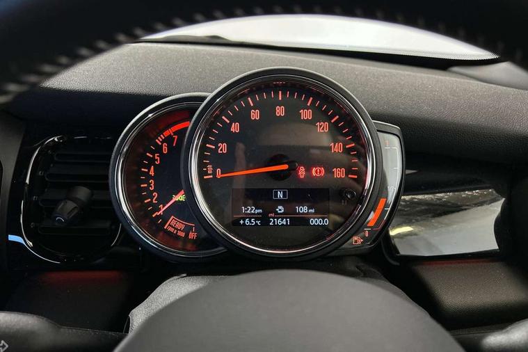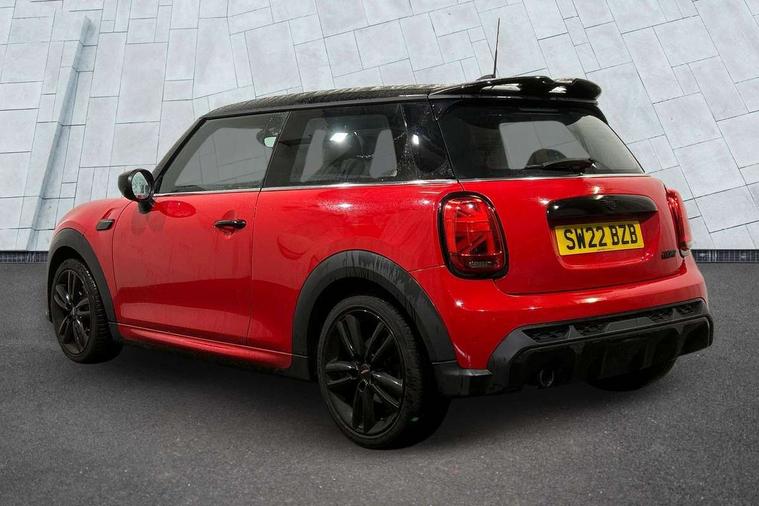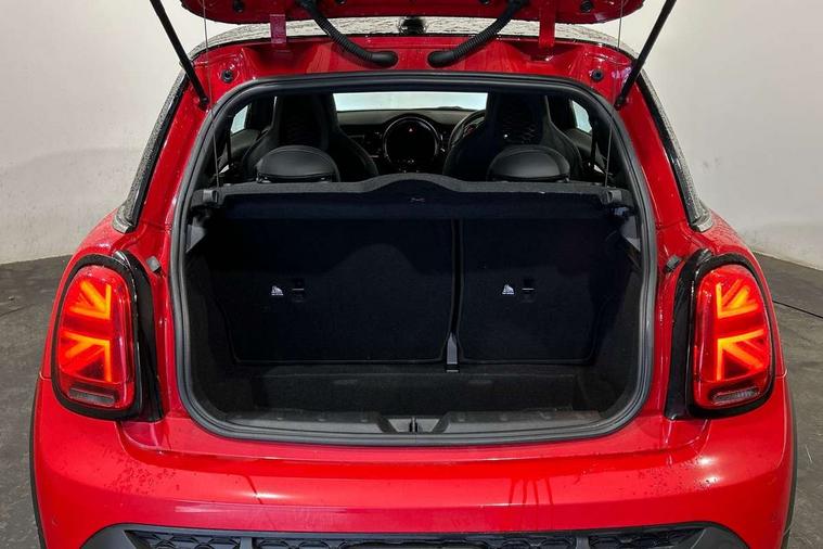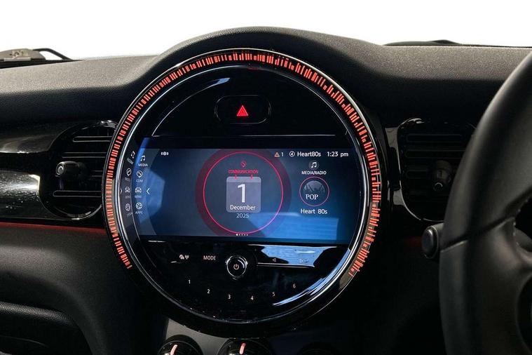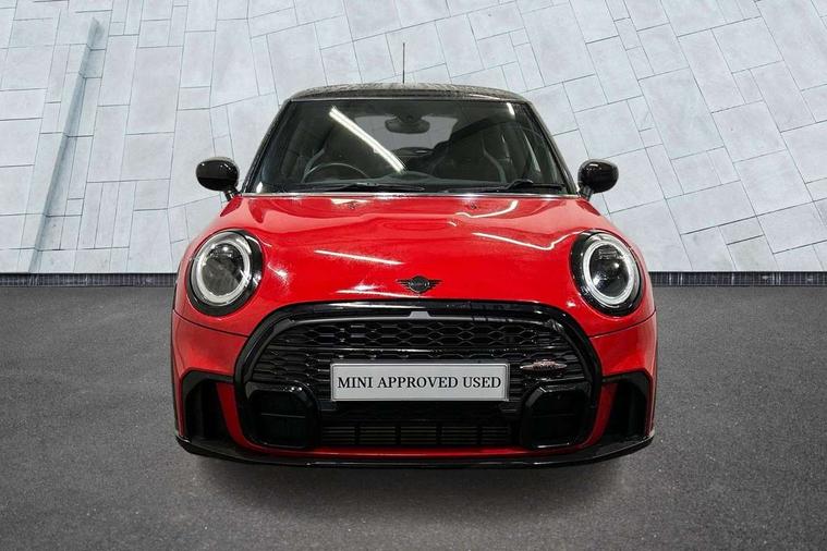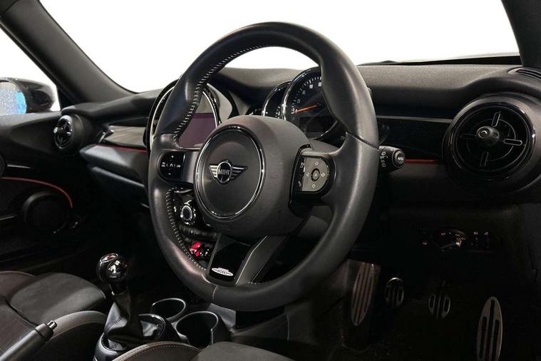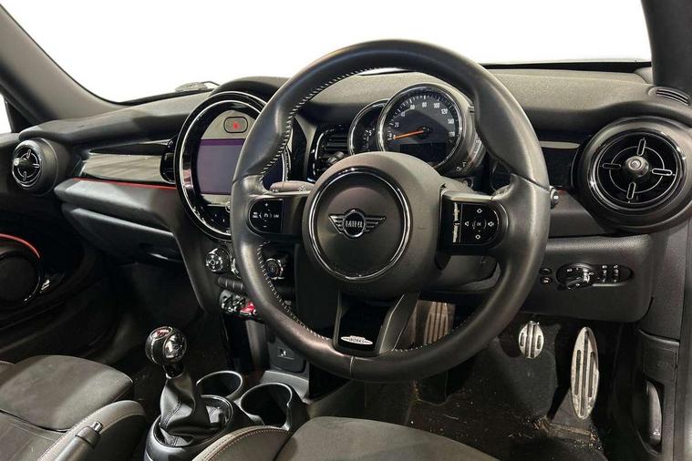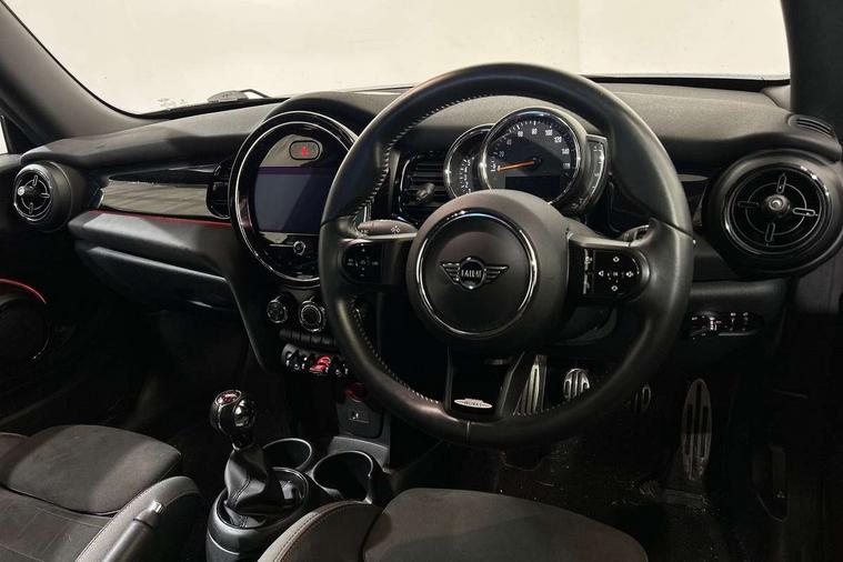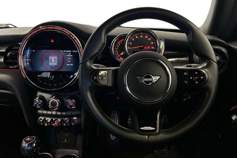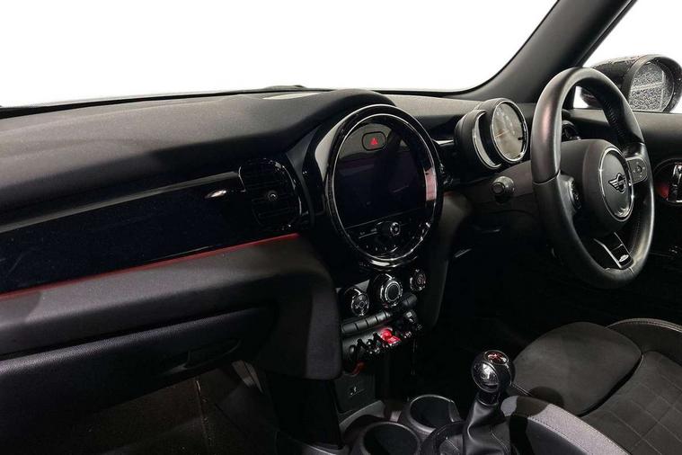 Apple CarPlay, Automatic start/stop function with brake energy recuperation, Compatible mobile phone bluetooth with audio streaming, Cruise control with brake assist, Electro-mechanical speed dependant steering assistance, Flexible car sharing preparation, Instrument cluster, MINI Driving Modes - centre toggle switch to control driving setting (sport, mid and green), Mini E-call, MINI TeleServices, On board computer, Rear park distance control, Service interval indicator, 6 Speed manual transmission including gear change indicator display, Double Vanos system, Fully variable valve control, High precision injection, Intelligent adaptive suspension, Performance Control, 8.8" touchscreen with LED ring, FM tuner and DAB digital radio, 3rd brake light, Automatic headlight activation switch, Body colour fuel filler cap, Chrome border high gloss black slats radiator grille, Dynamic brake lights, Electric front windows, Exhaust tailpipe on left with chrome finisher, Heated rear window, Heated windscreen washer jets, JCW Aerodynamic kit - Front and rear bumpers with sporty JCW styling and part-painted side sills with MINI John Cooper Works door sill finishers, John Cooper Works rear spoiler, LED headlight with closed ring and daytime driving lights, Metal door sill strips with MINI imprint, Model logo Cooper on right of tailgate, Rain sensor window wipers, Rear fog lights, Rear LED lights with union jack design, Rear window wiper, Side scuttle panel with integrated indicator, Sun/heat protection glass, White indicator lenses, 12V Accessory socket in centre console, 2 seat bench in 2nd row, 4 lashing eyes in luggage compartment, 60/40 split folding rear seat, Anthracite headliner including grab handles and clothes hooks, Carbon black colour line - Knee roll and door armrest, Chrome interior highlights, Cupholders, Front and rear isofix with front passenger airbag deactivation, Front floor mats in velour, Glove compartment, Height and length steering column adjustment, Interior lighting with 12 different colours across the dashboard, underneath door bezel with illuminated laser-engraved design on central display, JCW Sport seats with integrated headrests, adjustable thigh support and John Cooper Works logo, Leatherette gearshift lever and handbrake gaiters, LED reading lights, vanity mirror lights, front foot well light and spotlight on front seats, Manual air conditioning, Mechanical seat adjustment - forward/back & backrest for front seats and driver seat height adjust, Multifunction steering wheel, Passenger seat height adjuster, Single front passenger seat, Storage compartments in doors, Sunvisors with vanity mirrors, Walknappa leather steering wheel with grey seam and John Cooper Works badge on Piano Black lower steering wheel spoke, Piano black exterior pack - Mini Hatchback Cooper, 3 point seatbelts on all four seats, 6 Airbags - front, side, head and seat belt tensioners, Anti-lock braking system (ABS), DSC - Dynamic Stability Control, Front and rear disc brakes, Single tone fanfare horn, Tyre pressure monitoring system, Alarm system with tilt sensor, monitoring doors, bonnet interior and tailgate, Electronic vehicle immobiliser, Start/stop toggle with keyless go, Piano black interior trim, Tool kit,