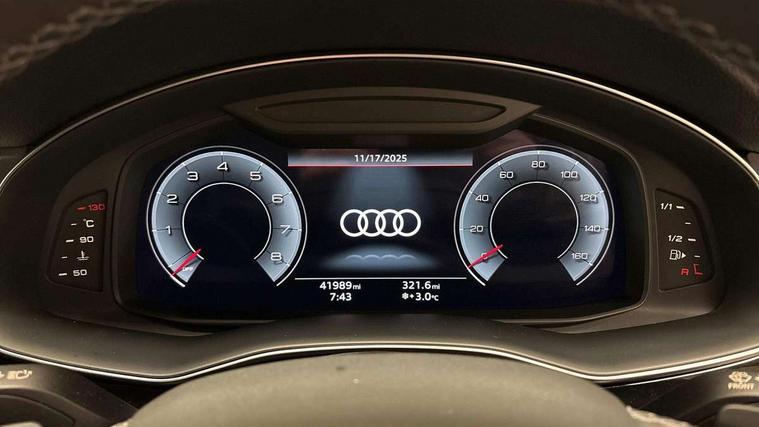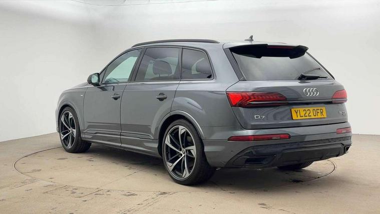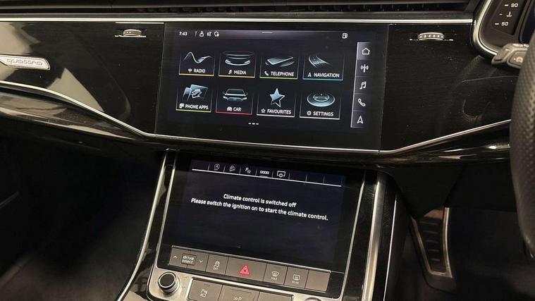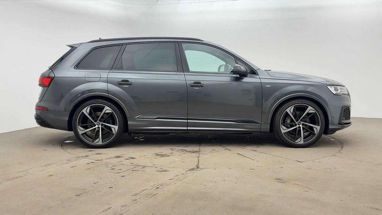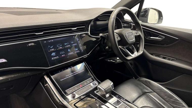 Audi connect safety and service (e-call), Audi connect with Amazon Alexa Integration, Audi drive select (Auto, Comfort, Dynamic, Efficiency, Individual, Off-road and All road), Bluetooth interface, Camera based traffic sign recognition, Electromechanical steering, MMI navigation plus with MMI touch screens includes 10.1" and 8.6" screens with haptic feedback, Natural voice recognition, Parking system plus with 360 degree display (front, rear and side sensors) - acoustic and visual park assist system, Power operated tailgate, Rear view camera, Smartphone interface includes wireless Apple carplay/Android Auto, Start/stop system, 48V Mild hybrid technology, 85 litre fuel tank, Adaptive air sports suspension, Quattro all wheel drive with self locking centre differential, Audi music interface - front 2 USB-C ports with charger and data functions, Audi sound system with 6 channel amplifier, 180 watt amplifying capacity and 10 loudspeakers including subwoofer, DAB digital radio module, 3rd brake light, Audi matrix LED headlights with dynamic front and rear indicators, Auto dimming frameless rear view mirror, Black roof rails, Bumpers in contrast paint scandium grey finish includes door trim and wheel arch trim strips, inlays in door strip contain quattro embossing, Electrically adj heated/folding + automatically dimming exterior mirrors with memory + automatic kerb side function for passenger side exterior mirror, Heat insulating glass in windshield, Integrated LED indications in door mirrors, LED daytime running lights, LED rear tail lights, Privacy glass - dark tinted rear and rear side windows from B-pillar backwards, Rear side wing doors, Rear wiper, 2 seat bench in 3rd row, 3 seat bench in 2nd row, 4 zone deluxe automatic climate control, 7 seat layout with ISOFIX points for the front passenger seat and rear passenger seat, Black cloth headlining, Comfort front centre armrest, Electric adjustable front seat with 4 way lumbar support, driver memory functionality, Folding rear seats, Front head restraints, Front/rear floor mats, Heated front seats, Illuminated door sill trims with S logo, LED interior ambient lighting, Luggage compartment cover, Luggage compartment sill protection in stainless steel, Rear head restraints, Single front passenger seat, Stainless steel pedals, Sunvisors with illuminated vanity mirrors, Titanium black styling pack - Q7/SQ7, 3 point seatbelts on all rear seats, Audi pre sense front, Child locks on rear doors, Driver and front passenger, front side and curtain airbags, Electromechanical parking brake, Electronic Stabilisation Control (ESC) including ABS, ASR and EDL, Extended pedestrian protection measures, Hill hold assist, Seatbelt monitoring, Tyre pressure loss indicator, Warning triangle and first aid kit, Anti theft alarm, Anti-theft wheel bolts and wheel loosening detection, Keyless Go, Remote central locking, Polished oak trim with grey finish inlay, Tool kit, Tyre repair kit,