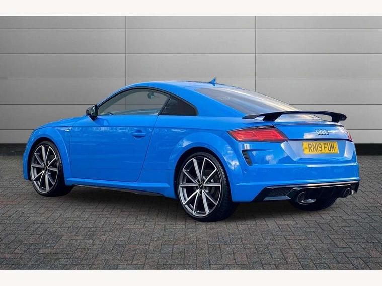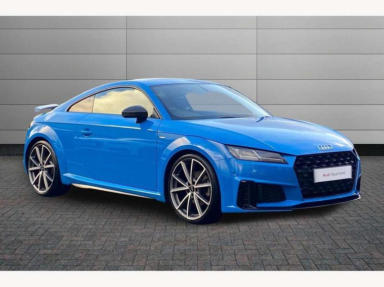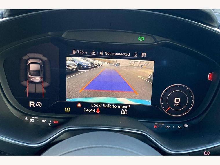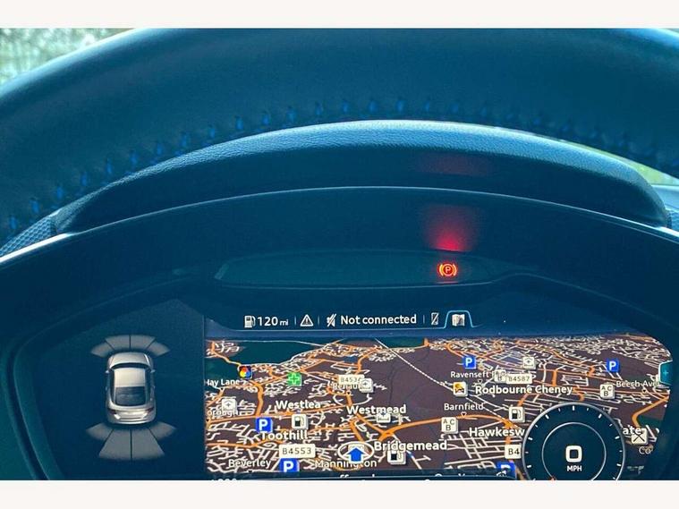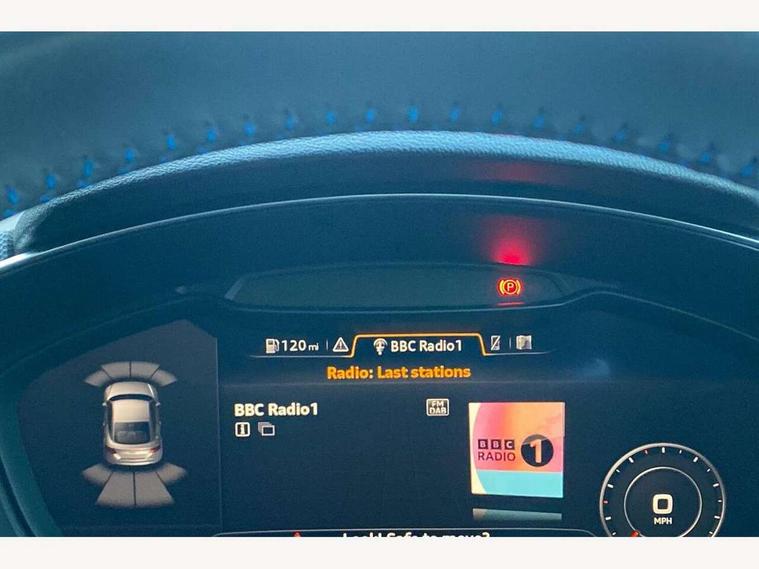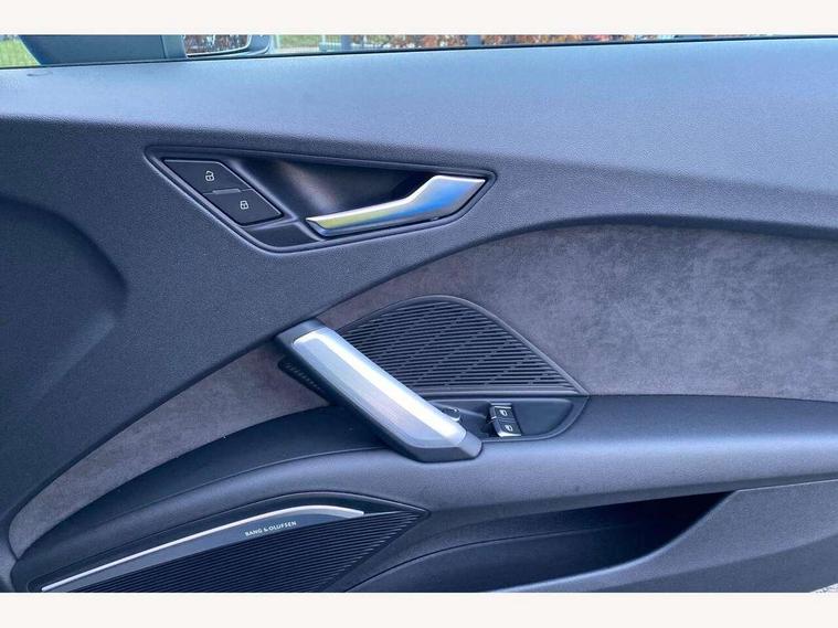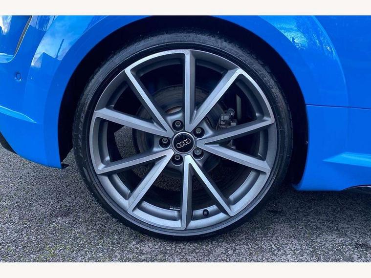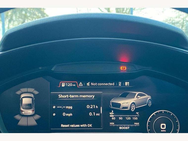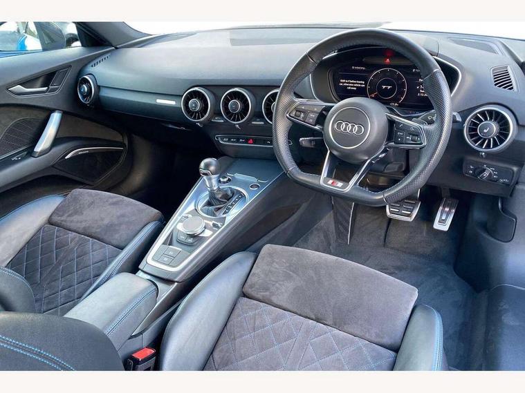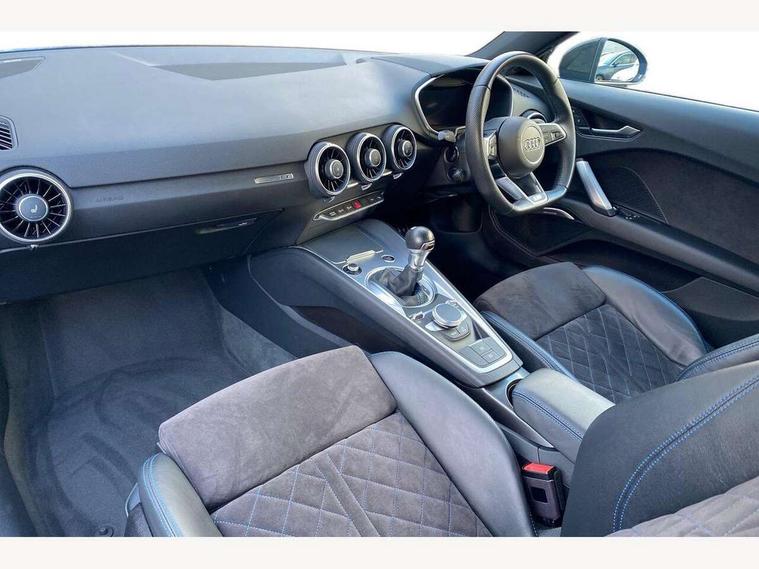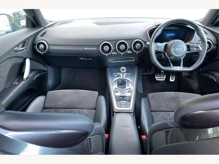 Audi drive select with 4 Pre configured modes, Audi virtual cockpit - 12.3" high-resolution LCD display with fully customisable instrument cluster, Cruise control + speed limiter, MMI touch panel, Mobile phone preparation with bluetooth interface, Progressive power assisted steering, Rear parking sensors, Service interval indicator, Start/Stop system with energy recuperation, TP memo, S line sports suspension, 8 Speakers, AM/FM radio, Audi music interface, Bluetooth audio streaming, DAB Digital radio, MMI Radio with CD player and SD/XC card slot, Auto dimming rear view mirror, Auto headlight range control, Black chrome tailpipe, Black door mirrors, Dark privacy glass from B-pillar backwards, Dynamic rear indicators, Electric folding door mirrors, Electric front windows, Front fog lights, Green tinted heat insulating glass, Headlight wash system, LED daytime running lights, Light and rain sensors, S Line body styling, S Line front and rear bumpers, S line rear diffuser with platinum grey insert, S line sill plates, Sunband for windscreen, 12V socket, 3 spoke flat bottomed high multi-function leather sport steering wheel with gearshift paddles, 4 way electric lumbar support for driver and front passenger, Black headlining, Chrome slate grey interior trim, Door sill trims with S line logo, Extended aluminium look with stainless steel pedals, Front centre armrest, Front super sports seats, Heated front seats, Height adjustable driver's seat, Height adjustable front head restraints, Height/reach adjust steering wheel, ISOFIX child seat mounting for front passenger seat with airbag deactivation, Perforated leather gearknob, Rear head restraints, Rear top tether child seat ISOFIX attachment, S Line badge on steering wheel, Split folding rear seat, Top tether anchor plate for isofix child seat, Black styling pack - TT, Non smoking pack - TT/TT RS, 3 point front seat belts, ABS, ASR traction control, Brake energy regeneration, Curtain airbags, Driver and front passenger airbag with front passenger airbag deactivation, EDL traction control, Electromechanical parking brake, ESP, First aid kit, Front side airbags, Head airbags, Hill hold assist, Roll bar in glossy black, Seatbelt warning, Tyre pressure warning, Warning triangle, Anti theft alarm, Anti theft wheel bolts, Immobiliser, Keyless Go, Remote central locking, Matt brushed aluminium inlays, Tool kit, Tyre repair kit,