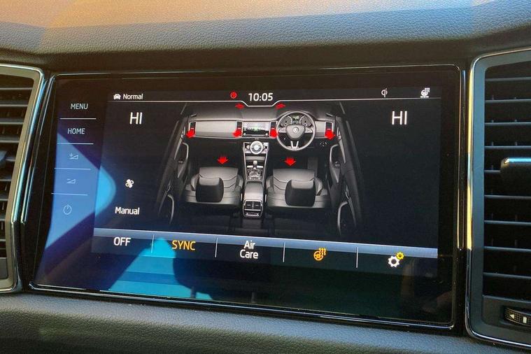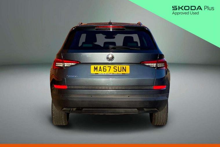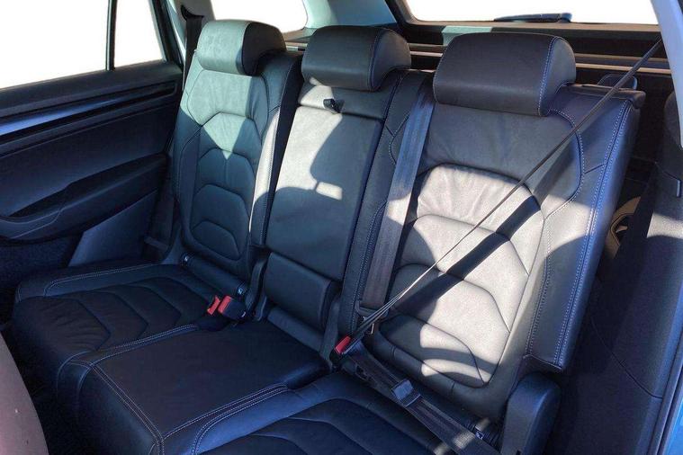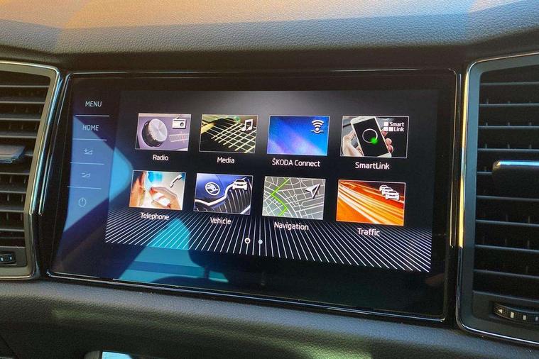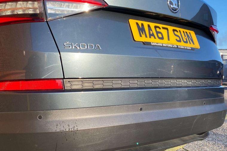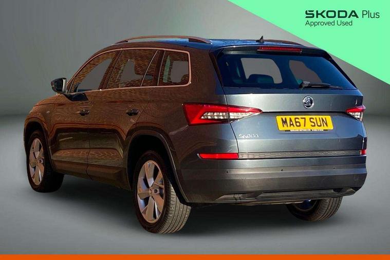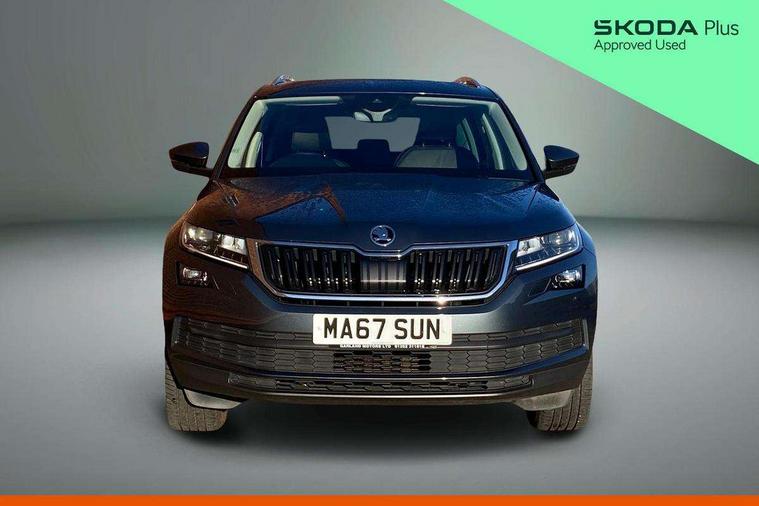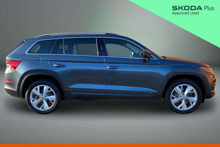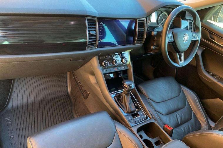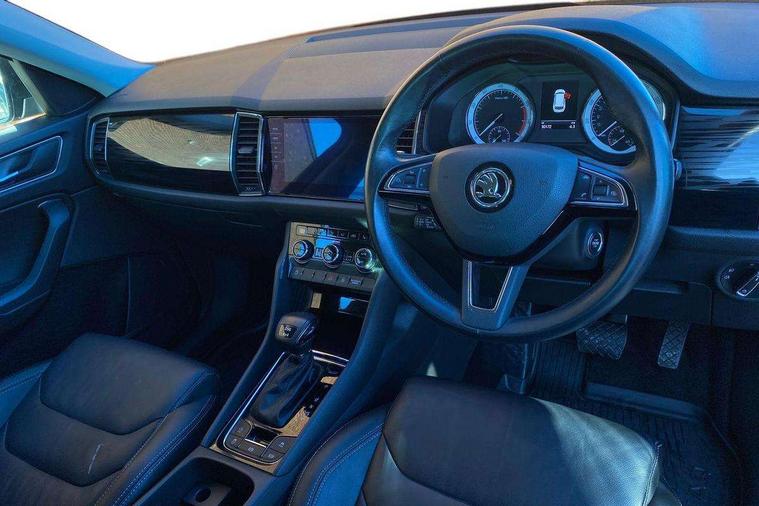 Bluetooth system, Colour maxi dot trip computer, Columbus satellite navigation with 9.2" touch screen and integrated Wi-Fi, Drive mode selector, Exterior temperature gauge, Phone box, Power tailgate, SmartLink, Smartphone wireless charging plate, Speed limiter, Bolero Radio, DAB Digital radio, DVD System, SD card slot, USB connection, Adaptive front lighting system, Aero wiper + intermittent function, Auto dimming door mirrors, Auto dimming rear view mirror, Automatic activation of hazard warning lights, Body colour bumpers, Body colour door mirrors and handles, Electric adjustable/heated/folding door mirrors, Electric front windows, Electric rear windows, Front and Rear door steps, Headlight washers, Heated rear window, High beam assist, High gloss black grille with chrome inserts, LED daytime running lights, LED front fog lights with static cornering light function, LED Headlights, Light assistant (coming home/tunnel light), Rain and light sensors, Rear spoiler, Rear wiper, Silver roof rails, Sunset privacy glass, Tinted windows, 12V Accessory socket in centre console, 12V power point in luggage area, 3 rear height adjustable headrests, 4 lashing points on luggage floor, 60/40 split fold rear seat back, Boot storage compartments, Centre console with storage/cupholders, Chrome gear shift lever, Chrome inner door handles, Driver + front passenger lumbar support, Driver's glovebox with lid, Driver's storage box, Electric front seats with memory function, Folding grab handles with rear coat hooks, Front and rear bottle holders, Front centre armrest with storage compartment, Front/rear courtesy lights, Height adjustable front seats, Height/tilt adjustable front headrests, Illuminated air conditioned glovebox, Illuminated luggage compartment, Isofix system on outer rear seats, Leather upholstery, Luggage compartment cover, Luggage nets in boot, Manually adjustable steering column, Passenger side net compartment on centre console, Pollen filter, Rear centre armrest with cupholders, Removable LED light in boot, Sunglasses storage, Sunvisors with illuminated vanity mirrors, Ticket holder, Chrome pack - Kodiaq, 3 point front/outer rear seatbelts+pre-tensioners, ABS + EDL + ASR + MSR + ESC, Automatic unlocking of doors in case of impact, Driver and passenger airbags, Drivers knee airbag, Electromechanical parking brake, Front assist including city emergency braking, Front side airbags, Fuel cut off safety device, Head airbags, Hill hold control, Hydraulic Brake Assist (HBA), Passenger airbag deactivate switch, Seatbelt warning, Two tone horn, Tyre pressure monitor, Alarm with interior monitoring and tilt sensor, Anti-theft wheel bolts, Immobiliser, Keyless entry and keyless start, Remote central locking,