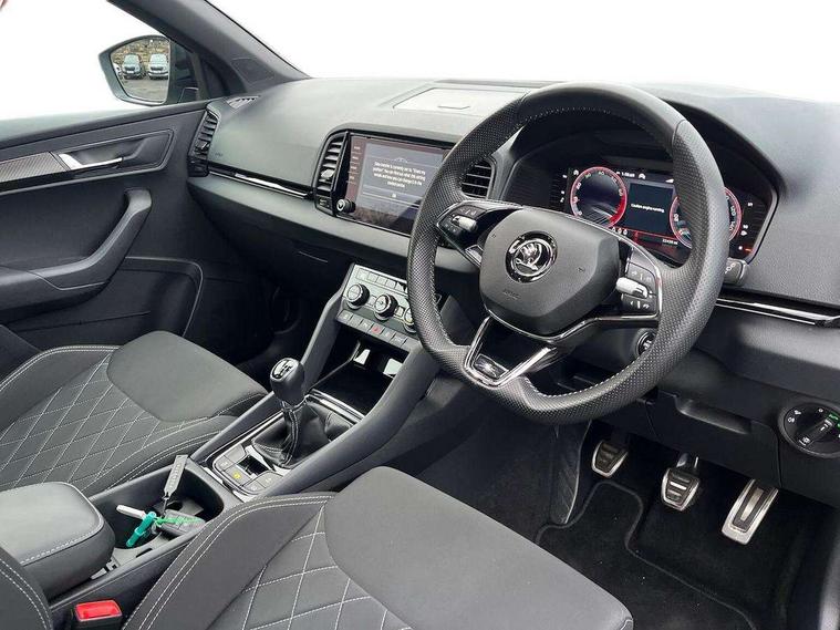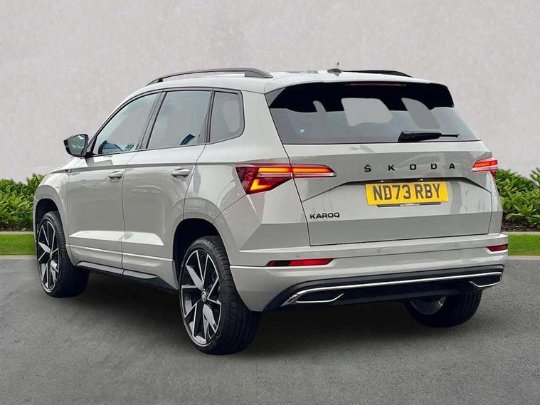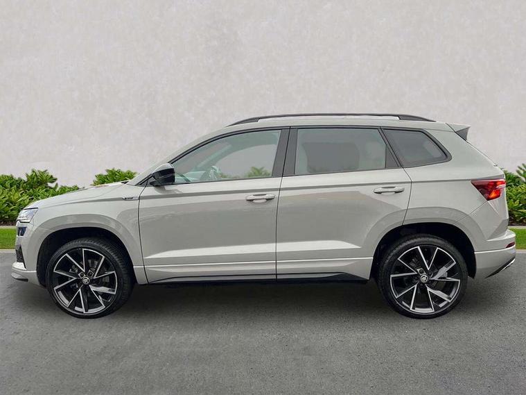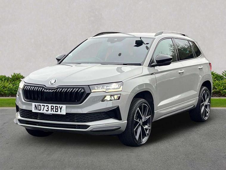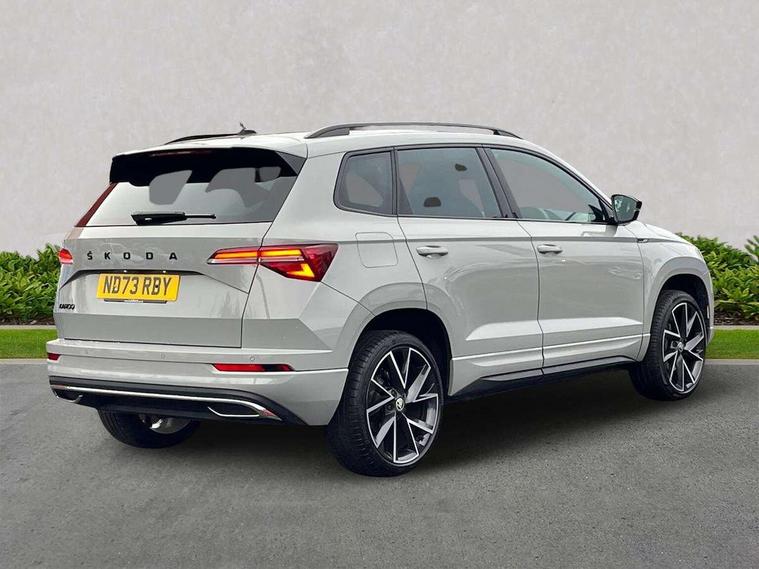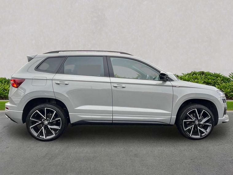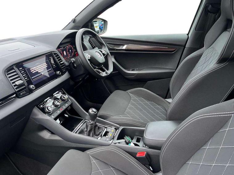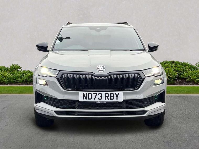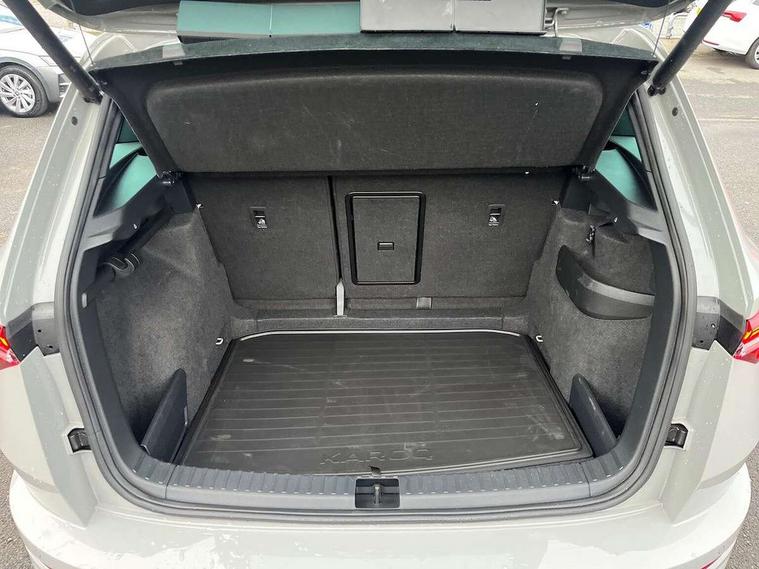 8" Digital display, Care connect, Driver fatigue sensor, Emergency services call system, Outside temperature gauge, Service interval indicator, SmartLink wireless for Apple and wired for Android, Start/stop system with regenerative braking, USB C Port x 2 in front centre console, Virtual cockpit, Virtual pedal with electrically operated boot door, 8 Speakers, DAB radio with Bluetooth, USB connection, Wireless charging without wireless aerial connection, Acoustic glass, Aero front windscreen wipers with intermittent function, Auto dimming rear view mirror with light and rain sensors, Black door mirrors, Black electric window control buttons, Black radiator grille, Black roof rails, Body colour door handles, Electric front and rear windows with child proof lock, Front door steps with SportLine logo, Heated rear windscreen, LED daytime running lights, LED rear lights with high functionality welcome effect and dynamic indicators, Light assistant (coming/leaving home/tunnel light), Panoramic sliding sunroof, Plastic scuff plates, Privacy glass, Protective door side sills in body colour, Rear diffuser, Rear side wing doors, Rear spoiler, Rear window wiper with washer system and intermittent control, Safety reflectors on front doors, Skoda lettering on tailgate in black, Sportline badge on front fender, Sportline decorative inserts with badging, Sports front and rear bumpers, 1.5 litre bottle holders in driver and front passenger door panels, 12V socket in boot, 12v socket in front centre armrest with storage compartment and rear air vents, 3 rear height adjustable headrests, 3 seat bench in 2nd row, 3 spoke leather sports multifunction steering wheel and silver stitching, 4 foldable roof handles with rear coat hooks, Black floor carpet, Black roof headlining, Chrome inner door handles, Double sided boot floor, Foldable hooks in the boot, Front head restraints, Height adjustable front three point seats belts with tensioners, Height/reach adjust steering wheel, Ice scraper, Illuminated glovebox, Illuminated luggage compartment, Isofix child seat preparation outer rear, Manual lumbar support for front seats, Pen holder, Pollen filter, Rear boot cover, Rear reading lights, Rear seats fixed folding and divided 60:40, Rubbish bin door, Safety vest holder, Single front passenger seat, Storage box in upper central dashboard closed, Sunvisors with illuminated vanity mirrors, Textile floor mats, Ticket holder, Titan black interior ceiling, Welcome animation with sportline logo, Boot pack - Karoq, Light Pack - Karoq, Parking pack - Karoq, Automatic door unlocking in case of crash, Automatic fuel cut off in case of crash, Child locks on rear doors, Driver airbag, Electronic parking brake with auto hold function, Emergency rear braking signal, ESC including ABS, MSR, ASR, EDS, HBA, DSR, RBS, MKB and traction control, Front side airbags, Hill hold control, Knee airbags, Passenger airbag with switch-off function, Pedestrian monitor, Seatbelt reminder signalisation and pretensioner for all seats, Three point seatbelts rear, Two tone horn, Tyre pressure display, Tyre pressure monitor, Alarm with interior monitoring, back up horn and tilt sensor with safe function, Electronic engine immobiliser, Keyless entry and start/stop, Remote central locking with 2 remote folding keys, Black air vent surround, Black centre console, Satin black dashboard, Satin black door trim, 19" Sagitarius anthracite alloy wheels with matt black aero inserts, Anti-theft wheel bolts protection, Matt black aero hub caps, Tool kit,