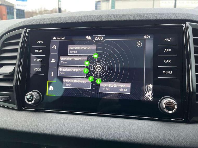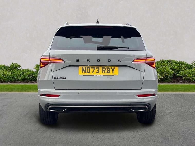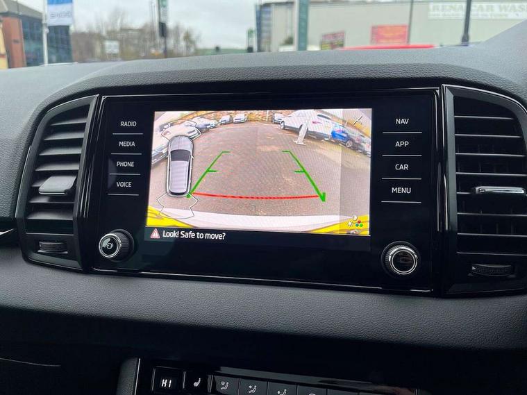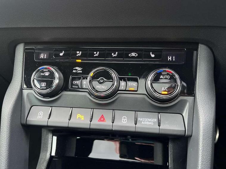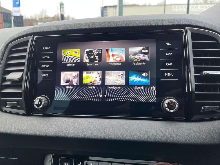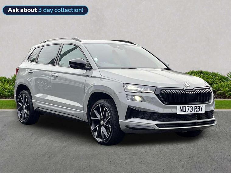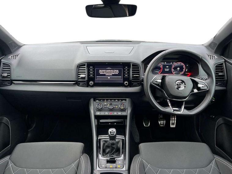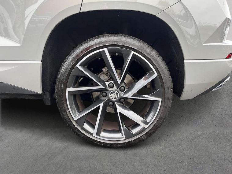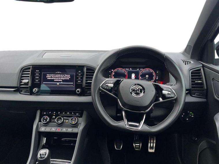 8" Digital display, Care connect, Driver fatigue sensor, Emergency services call system, Outside temperature gauge, Service interval indicator, SmartLink wireless for Apple and wired for Android, Start/stop system with regenerative braking, USB C Port x 2 in front centre console, Virtual cockpit, Virtual pedal with electrically operated boot door, 8 Speakers, DAB radio with Bluetooth, USB connection, Wireless charging without wireless aerial connection, Acoustic glass, Aero front windscreen wipers with intermittent function, Auto dimming rear view mirror with light and rain sensors, Black door mirrors, Black electric window control buttons, Black radiator grille, Black roof rails, Body colour door handles, Electric front and rear windows with child proof lock, Front door steps with SportLine logo, Heated rear windscreen, LED daytime running lights, LED rear lights with high functionality welcome effect and dynamic indicators, Light assistant (coming/leaving home/tunnel light), Panoramic sliding sunroof, Plastic scuff plates, Privacy glass, Protective door side sills in body colour, Rear diffuser, Rear side wing doors, Rear spoiler, Rear window wiper with washer system and intermittent control, Safety reflectors on front doors, Skoda lettering on tailgate in black, Sportline badge on front fender, Sportline decorative inserts with badging, Sports front and rear bumpers, 1.5 litre bottle holders in driver and front passenger door panels, 12V socket in boot, 12v socket in front centre armrest with storage compartment and rear air vents, 3 rear height adjustable headrests, 3 seat bench in 2nd row, 3 spoke leather sports multifunction steering wheel and silver stitching, 4 foldable roof handles with rear coat hooks, Black floor carpet, Black roof headlining, Chrome inner door handles, Double sided boot floor, Foldable hooks in the boot, Front head restraints, Height adjustable front three point seats belts with tensioners, Height/reach adjust steering wheel, Ice scraper, Illuminated glovebox, Illuminated luggage compartment, Isofix child seat preparation outer rear, Manual lumbar support for front seats, Pen holder, Pollen filter, Rear boot cover, Rear reading lights, Rear seats fixed folding and divided 60:40, Rubbish bin door, Safety vest holder, Single front passenger seat, Storage box in upper central dashboard closed, Sunvisors with illuminated vanity mirrors, Textile floor mats, Ticket holder, Titan black interior ceiling, Welcome animation with sportline logo, Boot pack - Karoq, Light Pack - Karoq, Parking pack - Karoq, Automatic door unlocking in case of crash, Automatic fuel cut off in case of crash, Child locks on rear doors, Driver airbag, Electronic parking brake with auto hold function, Emergency rear braking signal, ESC including ABS, MSR, ASR, EDS, HBA, DSR, RBS, MKB and traction control, Front side airbags, Hill hold control, Knee airbags, Passenger airbag with switch-off function, Pedestrian monitor, Seatbelt reminder signalisation and pretensioner for all seats, Three point seatbelts rear, Two tone horn, Tyre pressure display, Tyre pressure monitor, Alarm with interior monitoring, back up horn and tilt sensor with safe function, Electronic engine immobiliser, Keyless entry and start/stop, Remote central locking with 2 remote folding keys, Black air vent surround, Black centre console, Satin black dashboard, Satin black door trim, 19" Sagitarius anthracite alloy wheels with matt black aero inserts, Anti-theft wheel bolts protection, Matt black aero hub caps, Tool kit,