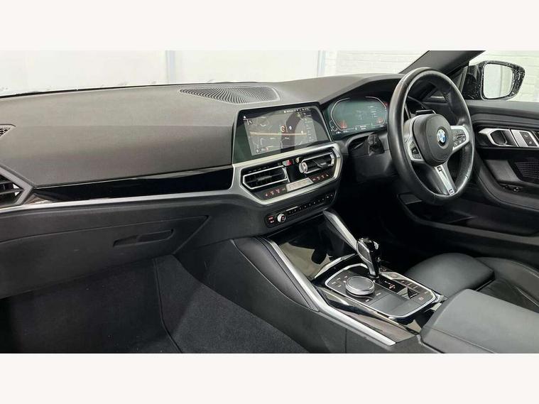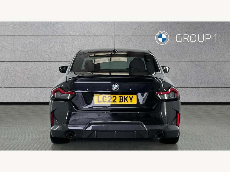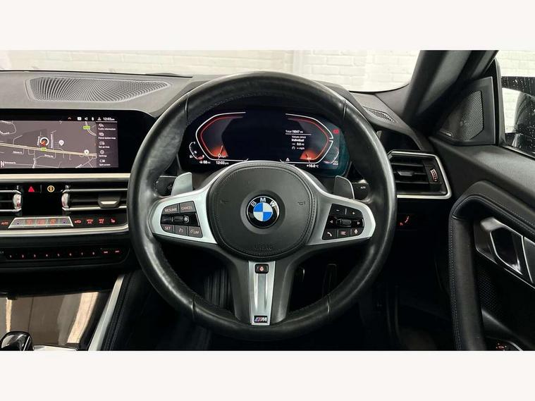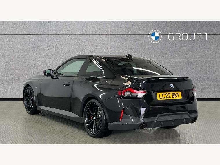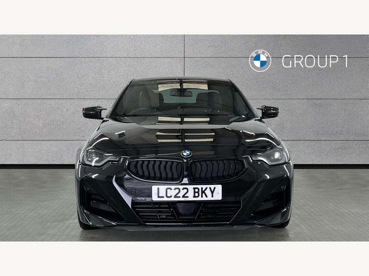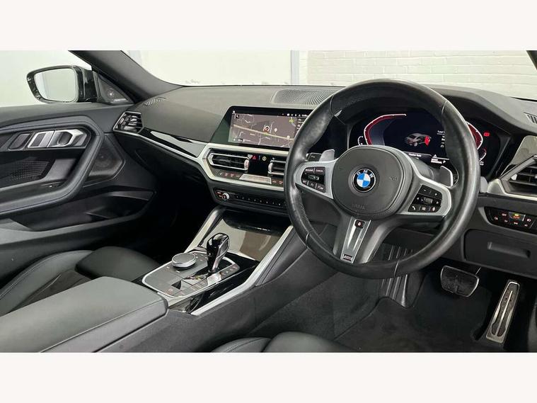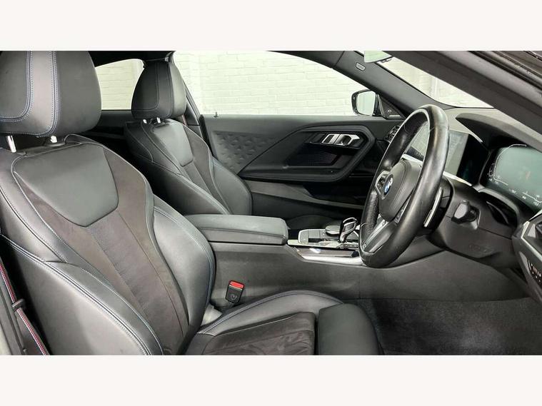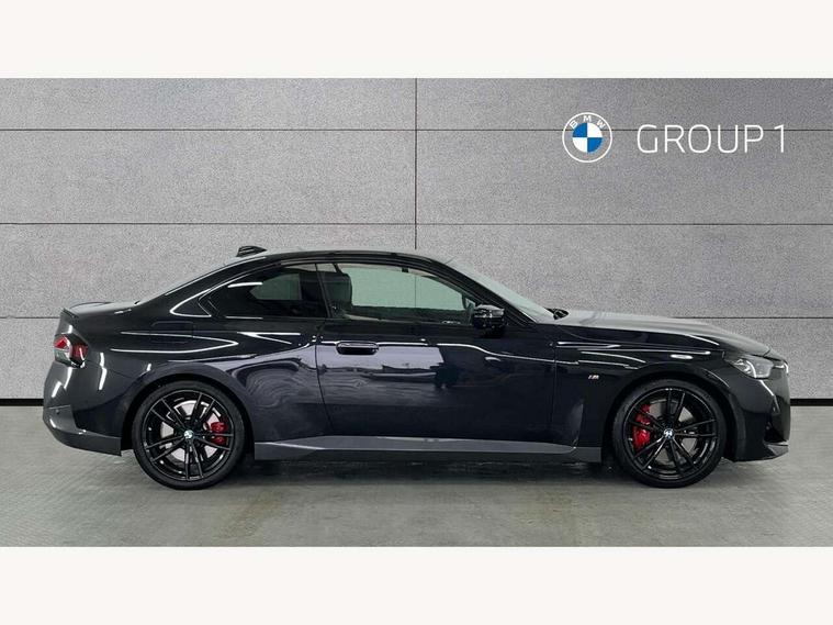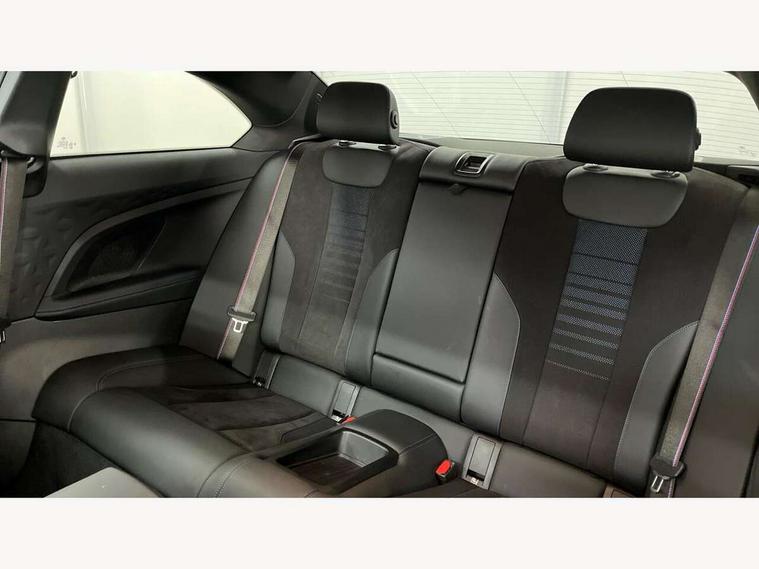 Attentiveness assist, Auto start-stop, Bluetooth, BMW ConnectedDrive online services, BMW Teleservices, Check Control warning system for monitoring of lights and door/luggage compartment open warning, Direct selection buttons, Drive off assistant, Eco pro mode, Electric power steering, Front/rear Parking distance control, iDrive controller with turn and press function, Integrated owners handbook, Intelligent functions, Live cockpit plus with nav function 12.3" instrument cluster and 14.9" centre display, Oil sensor for level and grade, Optimum shift indicator, Personal Profile, Touch operation on control display, Variable sport steering, Widescreen multi-media display, Aluminium lightweight construction, Balancer shaft, BMW TwinPower Turbo four-cylinder petrol engine, Double VANOS, Drive performance control with ECO PRO comfort + sport mode, Electronic differential lock, High precision injection, M sport suspension, Petrol Particulate Filter, Sport automatic steptronic transmission with gearshift paddles, manual gearshift time display, launch control, coasting idle ECO PRO/COMFORT modes, Twin scroll turbocharger with Valvetronic, DAB tuner, Acoustic windscreen wipers for reduced driving noise, Adaptive LED Headlights, Automatic windscreen wipers and automatic headlight, Automatically dimming rear view mirror, Body colour door handles flush with door surface, Body colour door mirrors, Body colour front and rear bumpers, Daytime running lights, Electric windows - front and rear, with open/close fingertip control and trap release, Exhaust tailpipes x2 - 90mm in left and right, Fading support, Front and rear bumper system with replaceable deformation elements, Front door sill finishers in black plastic with BMW designation, Front windscreen wipers with integrated washer jets, Green tinted heat protection glazing, High beam assistant, High gloss shadowline exterior trim in mirror triangle cover, mirror cover panel, mirror bezel and window border, High level third brake light, Indicators integrated int mirror housing, LED registration plate light, LED technology rear tail lights, brake lights and turn indicators, Lightweight engineering, Model designation on right side of tailgate, One piece kidney grille with hight gloss chrome surround, Rear boot, Rear fog lights, Reversing light in rear light cluster, Shark fin antenna, Single part LED rear lights with smoked glass components, Trailer stabilisation logic, Visible VIN plate, 12V power socket in front centre console with blanking plug, 2 cupholders in front centre console, 3 zone automatic air conditioning, Ambient lighting, Compartment in front of cupholder, Conditioned based service, Driver seat backrest width adjustment, Front and rear side armrests integrated into door trim, Front armrest, Front door pockets, Front head restraints, Front sport seats, Heated front seats, Illuminated glove compartment with separate small compartment, M headliner Anthracite, M sport leather steering wheel, Manually adjustment steering wheel column, Rear seat backrest with manual 40:20:40 split folding, Rear seat centre foldable armrest with integrated cup holder, Single front passenger seat, Storage compartment between rear seats, Storage tray and compartment with cover in centre console, Sun visors with vanity mirrors and insert tab, Through loading system with 40/20/40 split folding 2 rear seat in 2nd row, Two folding rear seat headrests, Velour floor mats, Additional storage compartment pack without USB - 2 Series Coupe, Connected pack professional - 2 Series Coupe, Interior and exterior mirror pack - 2 Series Coupe, M Sport exterior styling aerodynamics pack - 2 Series Coupe, 2 tone horn, Anti lock braking system (ABS) with cornering brake control, Automatic Stability Control (ASC), BMW emergency call, Brake drying, Child seat ISOFIX attachment for the two outer rear seats, Crash sensor activating of airbags, Unlocking doors, hazard warning lights, interior light, safety battery terminal, Deactivation of fuel pump in the event of a crash, Driver and front passenger airbags, Driver and front passenger side airbags, integrated in the door side seat backrest bolsters for all seat variants, Dynamic brake control, Dynamic stability control + (DSC+), Dynamic Traction Control - DTC, Electrically operated hand brake including automatic hold function and automatic release when driving off, Front and rear disc brakes, Front passenger airbag deactivation, Head airbags for all 4 outer seats, Manual deactivation of front passenger airbag, Seat belt security check for driver and front passenger, Seatbelt warning, Side impact protection, Three point seat belts on 4 seats including front belt stopper, pyrotechnic belt tensioners and belt force limiters, Tyre pressure sensor, Warning triangle and first aid kit, Alarm system (Thatcham 1) with remote control and electronic engine immobiliser, Central locking switch for all doors, fuel filler cap and luggage compartment, Deadlocking function system to all doors, Drive away locking system on all doors and luggage compartment, Locking wheel bolts, Start/Stop button (illuminated) in centre console with keyless engine start and Auto Start-Stop deactivation button, Two remote control key with integrated key - one button for open and close doors/fuel flap/tailgate and separate button for unlock luggage compartment, BMW mobility tyre sealing system, Electrically powered 12V compressor, Reduced rolling resistance tyres,