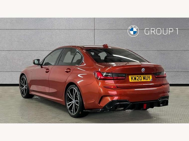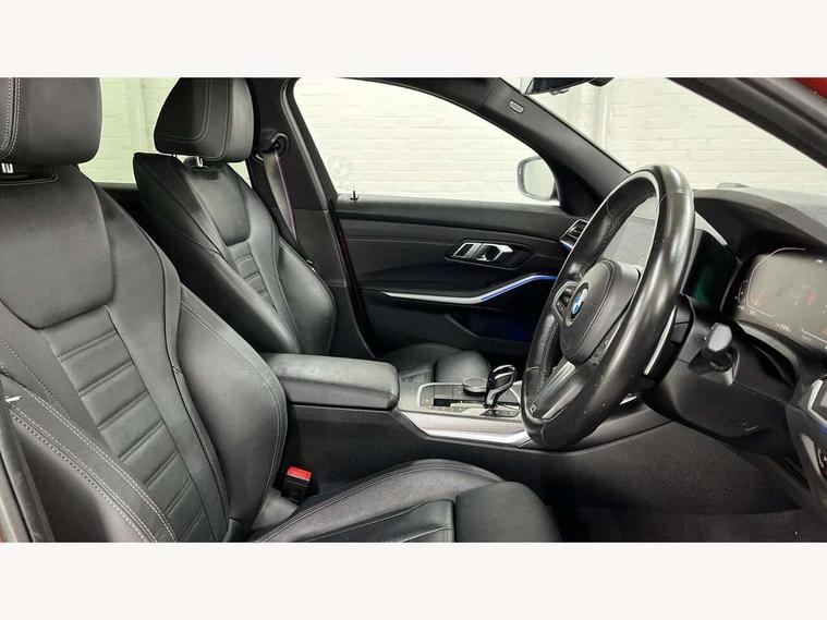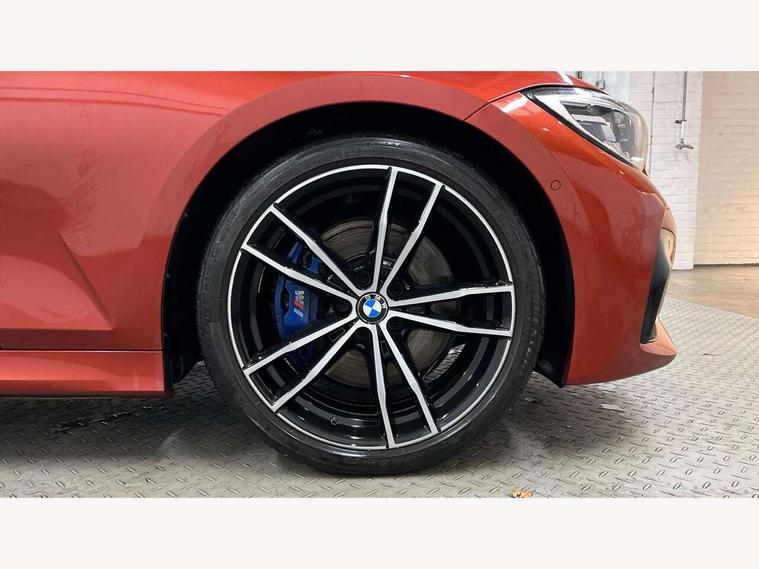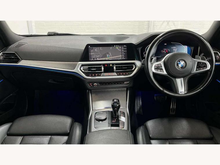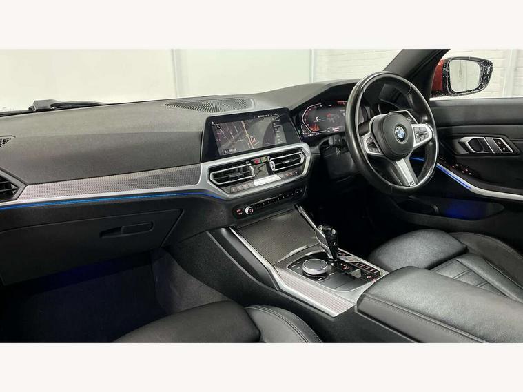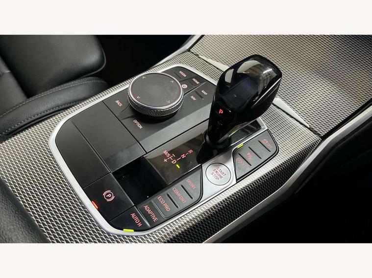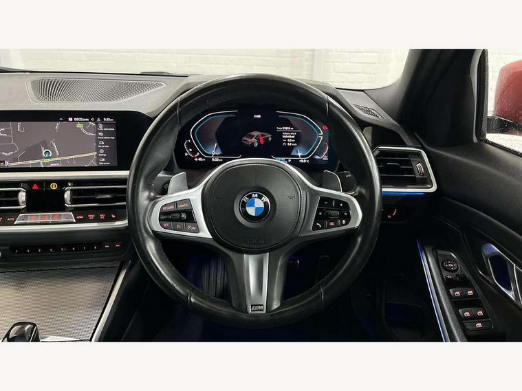 Active guard plus, Attentiveness assist, Auto start-stop, BMW iDrive controller on centre console, BMW Live Cockpit Professional Nav with 12.3" instrument display + 10.25" display, Intelligent Voice Assist, BMW OS 7, HDD, 2USB, 4G LTE connect, BMW service history, BMW Teleservices, Brake pad wear indicator in front and rear, Check Control warning system for monitoring of lights and door/luggage compartment open warning, Condition based service, Electric power steering with Servotronic steering optimised at all speed ranges, Instrument cluster with speedometer with mph readout, tachometer, fuel gauge and oil temperature gauge, Integrated owners handbook, Oil sensor for level and grade, warning by check control system, On board computer - average speed+fuel consumption, service interval, clock/date, odometer/trip meter, outside temperature display and ice warning, Optimum shift indicator, Personal Profile - automatic lock when driving away selectable, Variable sport steering, Balanced 50/50 weight distribution, Battery cut-out switch, Drive performance control - ECO PRO, comfort and sport modes, Larger capacity fuel tank, M sport suspension, Petrol Particulate Filter, Sport automatic transmission with steering-wheel mounted gearshift paddles and launch control, Stroke dependent dampers, DAB tuner, Electronic service booklet, Acoustic glazing, Automatic headlight beam throw control with load dependent regulating reaction, dynamic compensation of braking dive and acceleration squat, Black roof mouldings, Body colour door handles, Body colour fuel filler flap, Body colour mirror caps, Dynamic brake lights, Electric windows - front and rear, with open/close fingertip control, anti-trap facility and comfort closing, Exhaust tailpipe - split left and right, Exterior mirrors - electrically folding with anti-dazzle, Fading support, Front and rear bumper system with replaceable deformation elements, Front black door sill finishers with BMW designation, Green tinted heat protection glazing, High gloss shadow line exterior trim, Interior rear view electrochromatic mirror with automatic anti dazzle function, LED daytime running lights, LED front fog lights, Lightweight engineering, M designation on front side panels, left and right, Matt black exterior B pillar, Model designation on right side of tailgate, Rain sensor with automatic headlight activation, Shark fin antenna, Two part LED tailights in L-shape with components in smoked glass, brake light, LED turn indicator and rear fog light, Visible VIN plate, Welcome lights in interior and door handle area, Windscreen wipers with integrated washing jets, 12V power socket in front storage compartment, 2 front cupholder in centre console with clamping elements and matt black inlay, 3 rear seats with non folding headrests with 3 point seat belts, 3 zone automatic air conditioning, 4 pieces lashing eyelets in luggage compartment, 40:20:40 split folding rear seat with loading system, Ambient lighting with welcome carpet light, Anthracite headlining, Armrest integrated in front and rear door trim + front centre console armrest, Centred top Luggage compartment lights, Four grab handles integrated in roof lining, Front and rear door exit lighting (left / right), Front and rear door pockets, Front and rear reading lights, Front and rear velour floor mats, Front head restraints, Front sport seats, Heated driver and front passenger seats, Height adjustable mechanically and infinitely variable steering column, Illuminated armrest storage compartment, Illuminated glove compartment with separate small compartment, Interior lighting - front centre over interior mirror with soft light, rear centre and front and rear footwell lighting, M Sport multifunction leather steering wheel, Make-up mirror lights, Rear centre armrest with 2 cupholders, Rear centre console with storage compartment and ventilation grille, Sunvisors with vanity mirrors and ticket pocket, Toolkit located in luggage compartment, Connected pack professional - 3 Series Saloon/Touring, M Aerodynamics pack - 3 Series Saloon/Touring, 2 tone horn, BMW emergency call, Brake energy regeneration, Braking pre-tensioning, Child proof locking system in rear door, Child seat ISOFIX attachment rear outer seats, Coasting in idle in ECO PRO mode, Crash sensor activating of airbags, Unlocking doors, hazard warning lights, interior light, safety battery terminal, Driver and front passenger side airbags, integrated in the door side seat backrest bolsters for all seat variants, Driver/Front Passenger airbags, Dry braking, Dynamic brake control, Dynamic stability control + (DSC+) - Anti-lock Braking System (ABS) with brake assist and cornering brake control + Automatic Stability Control (ASC), Dynamic Traction Control - DTC, Electric parking brake including automatic hold function and automatic release of the parking brake when driving off, Electronic differential lock control (EDLC), Front passenger manual airbag deactivation, Head airbags for all 4 outer seats, Hill start assist, Seat belt security check for driver and front passenger, Side impact protection, Three 3 point seat belts on all seats including front belt stopper, pyrotechnic belt tensioners and belt force limiters, Tyre pressure monitoring with three level warning strategy, Ventilated front and rear disc brakes, Warning triangle and first aid kit, Alarm system (Thatcham 1) with remote control and electronic engine immobiliser, Central locking switch for all doors, fuel filler cap and luggage compartment, Remote control with integrated key one button open/close vehicle and windows, sole opening of the luggage compartment lid and panic mode, Start/stop button with Comfort Go keyless engine start and auto Start/stop deactivation button, Vehicle key with M specific designation, Reduced rolling resistance tyres,