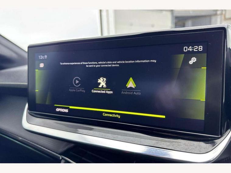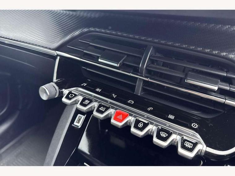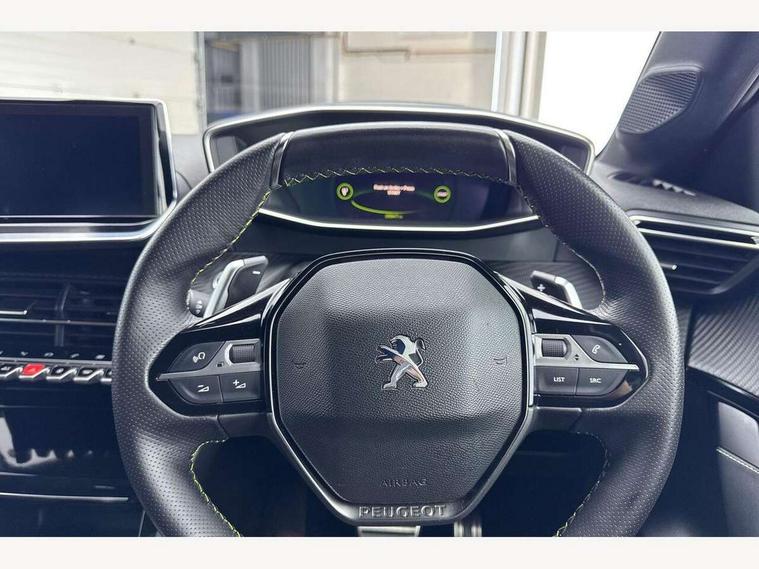 Bluetooth telephone facility, Driver attention warning, Exterior temperature indicator with ice warning, Front and rear parking sensors, Mirror screen with mirror link, apple carplay and android auto, Multi function trip computer, PEUGEOT i-Cockpit with compact steering wheel, PEUGEOT i-Cockpit with configurable 3D headup instrument panel, PEUGEOT SOS and assistance, Push button start, Smart phone docking station, Smartphone charging plate, Speed limit recognition and recommendation, Visio Park 1 with 180 degree Colour reversing camera, 2 front USB socket with USB-C, 2x USB sockets in rear, 6 speakers radio with mp3 compatible, DAB Digital radio, Voice recognition for radio, navigation and telephony features, 2 X Rear number plate lights, Automatic hazard light activation upon heavy brake application, Automatic lights, Automatic windscreen wipers, Body coloured exterior door handles, Dark tinted rear side and tailgate windows, Diamond Black roof, Electric front windows + one touch + anti-pinch, Electric rear windows with one touch/anti-pinch, Electrically adjustable, heated and power folding door mirrors, Extended diamond black rear spoiler, Follow me home headlights, Frameless electrochrome interior rear view mirror, Front windscreen wiper with magic wash cleaning system, Full LED headlights with smartbeam assist, Gloss black finish on B pillar, Gloss black rear cluster connecting strip, Gloss black wheel arch extensions, Gloss black window surround, GT Line model designation badging on C pillar, GT Line model designation badging on tailgate, Headlights left on audible warning, LED daytime running lights with 3 claw headlight with distinctive tooth design, LED side indicator lights integrated into door mirrors, Model designation badges front and rear, Nera black door mirror shells, Radiator grille - Dark chrome chequered and gloss black edge trim, Rear bumper with gloss black finish, Rear full LED 3D peugeot signature claw effect lights with daylight function, Rear lower bumper diffuser effect trim in gloss black, Rear reversing lights, Rear windscreen wiper triggered automatically in reverse gear, Stainless steel door sill scuff plates, Tailgate with heated rear windscreen and wiper blade, Twin chrome exhaust tailpipes, 1/3 to 2/3 split folding rear seats, 12V socket, 8 Colour personalisable ambient lighting, Aluminium pedals and foot rest, Automatic gear lever in full grain leather and satin chrome, Driver and front passenger seat manual adjustment in longitudinal and back rest angle, Driver and front passenger seat mechanical height adjustment, Driver and front passenger sport seats, Dual zone electronic climate control, Electric power steering with reach and rake adjustable steering column, Front and rear carpet mats in black with lime green stitch detail, Front centre armrest with storage compartment, Front LED interior light with 2 reading spotlights and rear interior light with timer, High centre console with 2 cup holders, ISOFIX child seat mounting points on passenger seat, Lime green contrast stitching to armrest, front centre console, door panels and dashboard facia, Map pockets on the backs of the front seats, Mistral full grain perforated leather steering wheel with aikinite stitch detail and satin chrome 'GT' emblem, Piano keys gloss black plated toggle switches to access main functions of the vehicle, Roof lining - Mistral black, Seatbelt unfastened on the move audible and visual alert for front and rear seats, 2x 2nd row ISOFIX child seat mountings, 3 point seatbelts on all rear seats, ABS (Anti-lock Braking System) with EBD (Electronic Brakeforce Distribution) and EBA (Emergency Braking Assistance), Active safety brake with night function/cyclists/pedestrians, Child locking functionality on rear doors, Driver and passenger airbags with Passenger airbag deactivation system, Driver/front passenger side airbags, Electric parking brake, ESP with Hill Assist, Front and rear curtain airbags, Front and rear disc brakes, Front optimised safety headrests and 3 x rear retractable headrests with height adjustable, Front three point retractable seatbelts with force limiters, Tyre pressure sensor, Automatic door locking when moving off, Deadlock, Electronic code immobiliser, Thatcham Cat.1 alarm, Carbon effect Dashboard, front and rear door panel finish, 17" Camden diamond cut two tone alloy wheels, Space saver spare wheel,