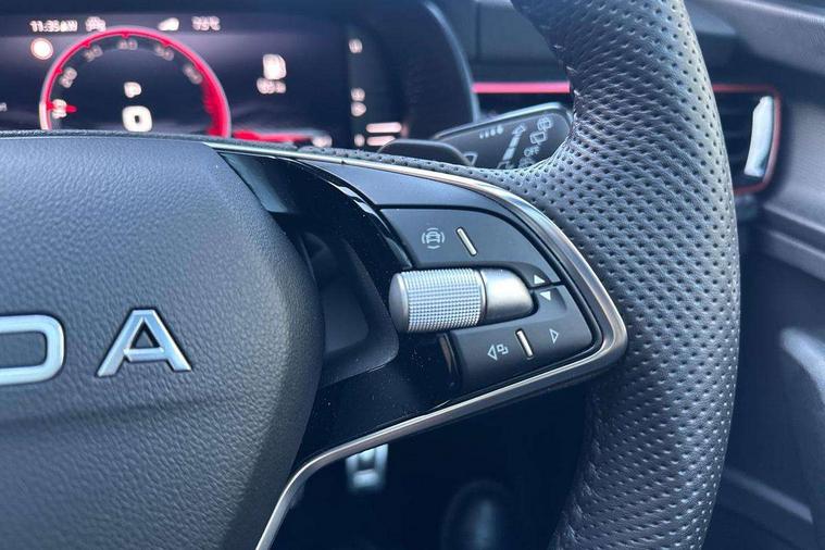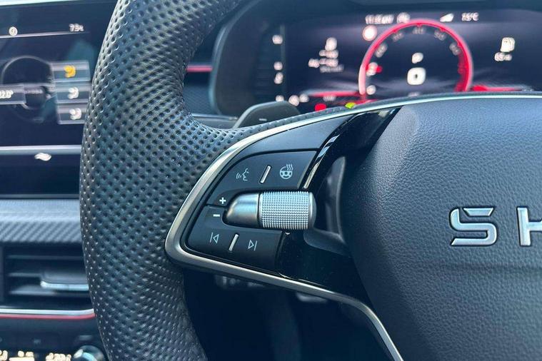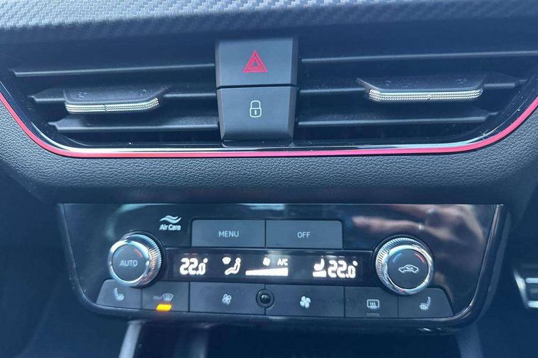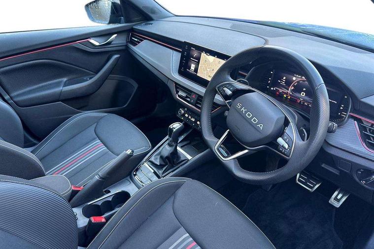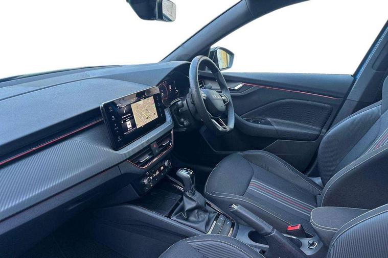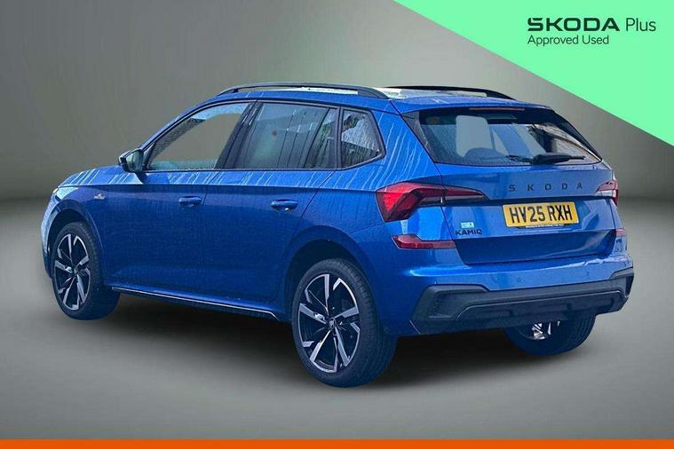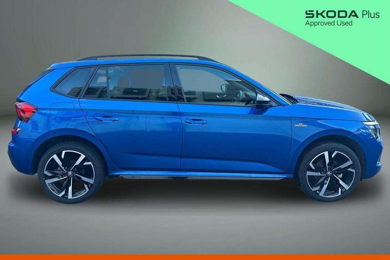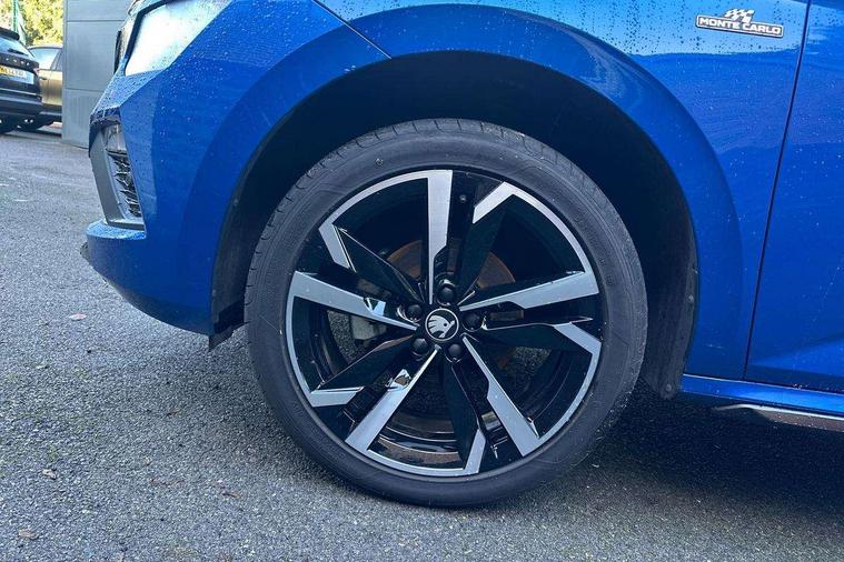 Advanced driver attention and drowsiness monitor, Bluetooth system, E-call, Front assist system, PAS, Rear parking sensors, Rear view camera, Service indicator, Speed limiter, Traffic sign recognition, Virtual cockpit with 10.25" display, Voice control system, Wireless smartlink, 4 USB C ports, 8 Speakers, 9.2" Skoda navigation display, DAB Digital radio, Auto dimming rear view mirror, Automatic headlight control with coming home and leaving home feature, Black door mirrors, Black radiator grille, Black rear diffuser, Black roof spoiler, Body colour bumpers, Body colour door handles, Boot lettering in black, Extended tailgate glass, Fixed panoramic sunroof with black roof rails, Front and rear electric windows, Heated rear window, LED daytime running lights, LED high beam, LED low beam, LED third brake light, Light sensors, Monte carlo plaque, Privacy glass, Rear side wing doors, Rear wiper, Ticket holder inside windscreen, 12V socket in luggage compartment, 3 seat bench in 2nd row, Aluminium pedals, Ambient lighting in white/red, Art leather carbon decor inserts, Art leather carbon door inserts, Black roof lining, Cargo elements, Chrome inner door handles, Driver and passenger sun visors with vanity mirror, Dual zone climate control, Front and rear roof lights, Front centre armrest, Front head restraints, Glove compartment with illumination, Height adjustable driver seat, Height adjustable front passenger seat, Ice scraper, Inner circulation control with pollen filter, ISOFIX on front passenger seat, Isofix preparation for back seats, Leather gearknob and handbrake lever, Manual lumbar support for front seats, Monte Carlo cloth upholstery, Net package and top tether hooks in boot space, Net under rear shelf, Pocket on the back of both front seats include mobile phone pockets, Rake/reach adjustable steering wheel, Reading lights, Rear centre armrests, Red hotstamping, Single front passenger seat, Sports seats, Textile floor mats, Third rear headrest, Top tether for front passenger seat, Umbrella in driver's door, Light and view plus package - Kamiq, 3x3 point rear seatbelts, Airbags - driver and front passenger, Disc brakes, ESP, Extended and predictive pedestrian/cyclist protection, Front passenger airbag deactivation switch, Front side airbags with curtain airbags, Hill hold control, Manual leather parking brake, Manual rear child locks, One tone horn, Seatbelt reminder for driver an co-driver, Traction control, Tyre pressure monitor, Anti-theft alarm system with interior monitoring, backup horn, towing protection and remote central locking with SAFE system, Anti-theft wheel bolts, Electronic engine immobilizer, 18" Ursa black diamond cut alloy wheels,
