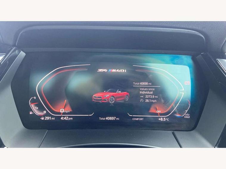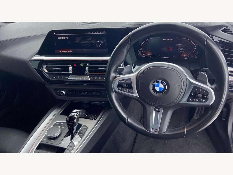 Active Guard, Auto start-stop, Bluetooth hands free telephone connection with USB audio interface + audio streaming, BMW ConnectedDrive online services, BMW Live Cockpit Professional with 10.25" high resolution instrument and control display, BMW Teleservices, Electric power steering, Fuel gauge, Instrument cluster, Oil sensor for level and grade, warning by check control system, Oil temperature gauge, Optimum shift indicator, Pull away assistant, Run flat indicator, Speedometer with mph readout, Tachometer, Variable sport steering, Adaptive M suspension, Double joint spring, Double VANOS, Drive performance control with ECO PRO comfort + sport mode, Eight speed steptronic sport transmission, with gearshift paddles, Fuel tank breather system, High precision injection, M Sport differential, HiFi loudspeaker system, USB connection, Automatic headlight beam throw control with load dependent regulating reaction, dynamic compensation of braking dive and acceleration squat, Cerium grey exterior mirror housing, Door sill finishers with M designation, Door sill strips, Dynamic braking lights comprising activated hazard warning flashers and third brake lights, Electric heated rear window, Exhaust tailpipe - split left and right, Exterior mirrors - electrically folding with anti-dazzle, Fingertip control / anti-trap function on electric window, Follow me home headlight function, Front and rear bumper system with replaceable deformation elements, Green tinted heat protection glazing, Heated windscreen washer jets, High gloss black window recess finisher, High gloss shadow line, Interior rear view electrochromatic mirror with automatic anti dazzle function, Kidney grille in mesh design, LED daytime driving lights, LED Indicators, LED rear lights, Lightweight engineering, Model logo, Tailgate release handle, Two stage brake force display, Visible VIN plate, Welcome lighting, Windscreen wipers with adjustable interval, 12V power socket in front storage compartment, Activation of interior lighting, Additional storage compartment - 4 lashing eyes, strap and storage net, Ambient lighting, Battery in luggage compartment, Child seat ISOFIX attachments for passenger seat, Cupholder, Driver and front passenger heated seats, Driver and front passenger lumbar support, Electrically adjustable front driver and passenger seats with memory, Front and rear velour floor mats, Front headrests, Height adjustable mechanically and infinitely variable steering column, M sport leather steering wheel, M Sport seats for driver and passenger, Microfilter and active carbon filter, Sunvisors with vanity mirrors, Two zone automatic air conditioning, Vernasca leather upholstery, Connected package professional - Z4, 3 point front seat belts, Airbags - Front driver and passenger, front and side impact protection, Anti lock braking system (ABS) with brake assist, Automatic Stability Control (ASC), BMW emergency call, Brake energy regeneration, Braking readiness, Cornering brake control (CBC), Crash sensor activating central locking release, hazard warning lights, fuel cut off, interior lighting, safety battery terminal clamp and airbags, Deactivation of fuel pump in the event of a crash, Dry braking, Dynamic brake control, Dynamic stability control + (DSC+), Dynamic Traction Control - DTC, Electromechanical parking brake with automatic drive away release and auto hold function, Front and rear brake discs with interior ventilation, M Sport brakes with blue calipers M designation in front, M sport seatbelt, Plastic fuel tank, Pyrotechnic seat belt tensioners, Roll over protection, Seat belt force limiter, Seat belt stopper, Seat occupancy protection, Two tone horn, Tyre pressure monitoring with three level warning strategy, Centre lock switch, Closing system with central locking, Electronic vehicle immobiliser, Start/stop button with Comfort Go keyless engine start and auto Start/stop deactivation button, Thatcham cat 1 remote alarm, Sensatec dashboard, 19" Double spoke M light alloy wheels in bicolour cerium grey - style 800M, Reduced rolling resistance tyres, Tyre repair kit,