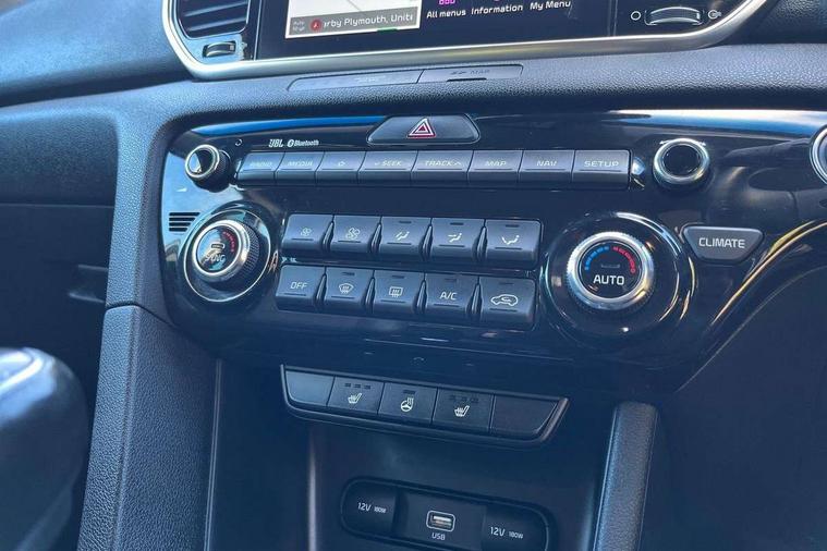 360 degree surround camera, 4.2" supervision colour cluster display, 8" touchscreen satellite navigation with European mapping and traffic messaging channel, Android auto with voice control, Apple car play with voice control, Blind spot collision warning, Bluetooth connectivity with voice control, Cruise control + speed limiter, Digital clock, Driver attention warning, Emergency stop signalling system, Forward collision avoidance assist, Front parking sensor, Kia connected services featuring TomTom live, Lane keep assist, Rear parking sensor, Speed limit information, Speed sensitive power steering, Trip computer, Windscreen washer level indicator, Intelligent Stop and Go, Bluetooth audio streaming, DAB Radio with MP3, JBL Premium sound system with 8 speakers, external amp, subwoofer and front centre speaker, Steering wheel mounted audio controls, USB/iPod/auxiliary input connections, All round electric windows with drivers auto up/down function, Auto dimming rear view mirror, Automatic defog system, Automatic headlights, Black wheel arch body mouldings and side sills with chrome insert, Body colour door handles with chrome inserts, Body colour door mirrors, Chrome front bumper insert, Chrome grille surround, Chrome window surround, Cornering light, Electrically adjustable/heated/folding door mirrors with LED indicators, Front fog lights, High beam assist, High gloss black diamond mesh radiator grille, LED Bi-Function headlights, LED daytime running lights, LED rear lights, Metallic paint, Privacy glass (rear side windows and rear screen), Rain sensing front wipers, Rear spoiler, Rear wiper, Roof rails, Shark fin antenna, Silver painted front and rear skid plates, Speed sensitive front wipers, Tinted glass, Trailer stability assist, Welcome and follow-me home light functionality, Wide view drivers door mirror, Windscreen wiper de-icer, 10 way driver/8 way passenger electrically power adjustable seats, 12V power in front and rear centre console, 3 x passenger assist grips, 60/40 split folding rear seat, Air filter, All-round height adjustable headrests, Centre cabin light, Centre console storage box, Cloth/leather upholstery, Door armrest in leather, Driver and front passenger side sunvisors with illuminated vanity mirrors, Drivers seat power lumbar support, Dual zone automatic air conditioning, Front and rear door storage, Front cabin LED map light with sunglasses case, Front door courtesy reflectors, Front seat and rear pockets, Front/rear centre armrests, Gear shift indicator, Glovebox illumination, Heated front and outer rear seats, Heated steering wheel, Illuminated glovebox, Interior door lock/unlock function, ISOFIX Child seat top tethers and anchor fixings, Leather steering wheel, Leather trimmed gearshift, Light grey headlining, Luggage area light, Luggage area load cover, Luggage net hooks, Rear centre armrest with cupholder, Rear coat hooks, Rear headrests, Satin chrome interior door handles, Stainless Steel Scuff Plates, Tilt/telescopic adjustable steering wheel, Ventilation ducts to rear compartment, 3x3 point rear seatbelts, Active front headrests, All round 3-point seatbelts, Anti-lock braking system with electronic brakeforce distribution, Dual front side airbags, Electronic parking brake, Electronic stability control with downhill brake control, ESP + traction control, Front passenger airbag cut-off switch, Front seatbelt pretensioners + load limiters, Height adjustable front seatbelts, Hill start assist control (HAC), Impact sensing auto door unlocking, Rear door child safety locks, Twin curtain airbags with roll over sensor, Twin front airbags, Tyre pressure monitoring system, Advanced anti-theft system including immobiliser and alarm, Door deadlocks, Engine Start/Stop Button with Smart Entry System, Locking wheel nuts, Speed sensitive auto door locking, Visible vehicle identification number, High gloss black centre fascia, 17" alloy wheels, Tyre mobility system,