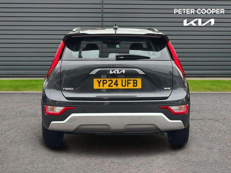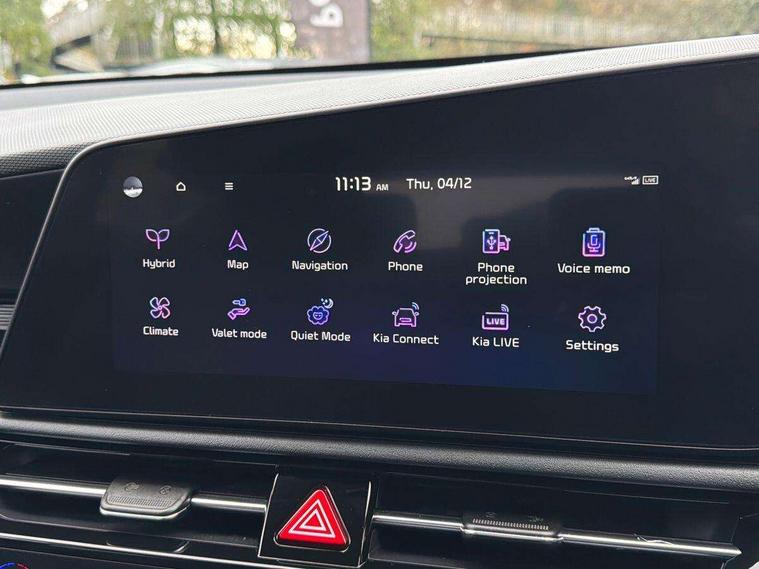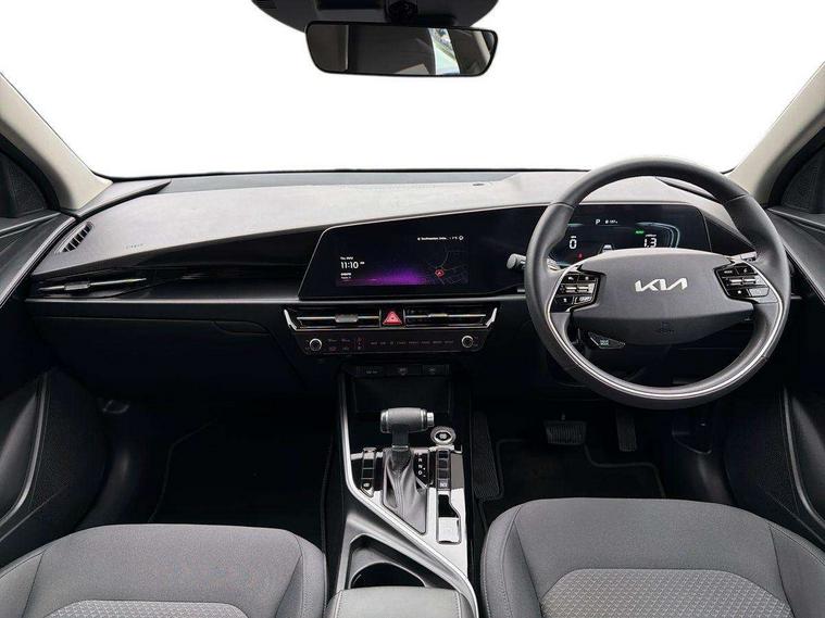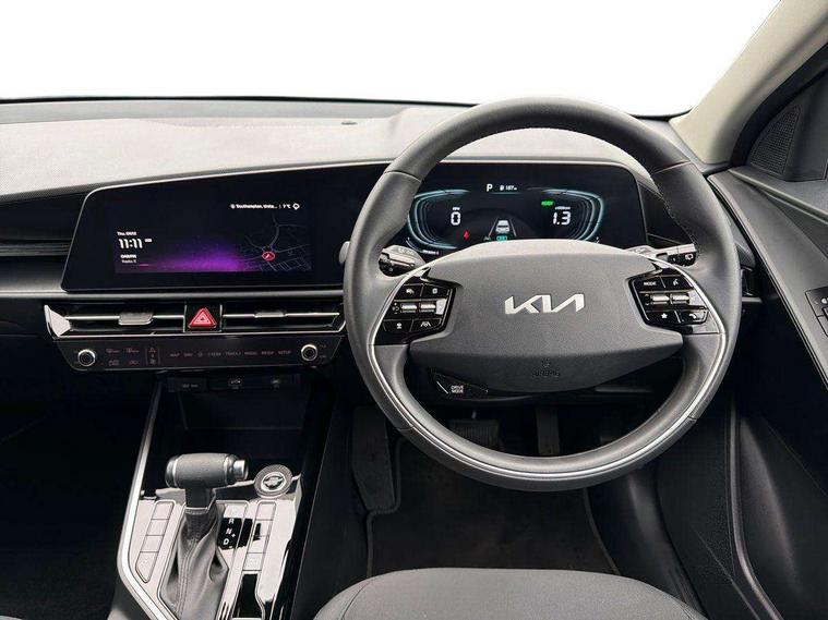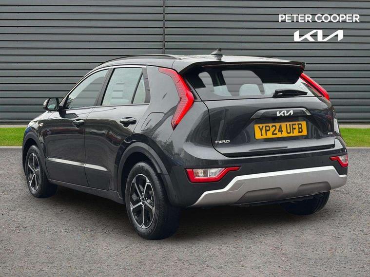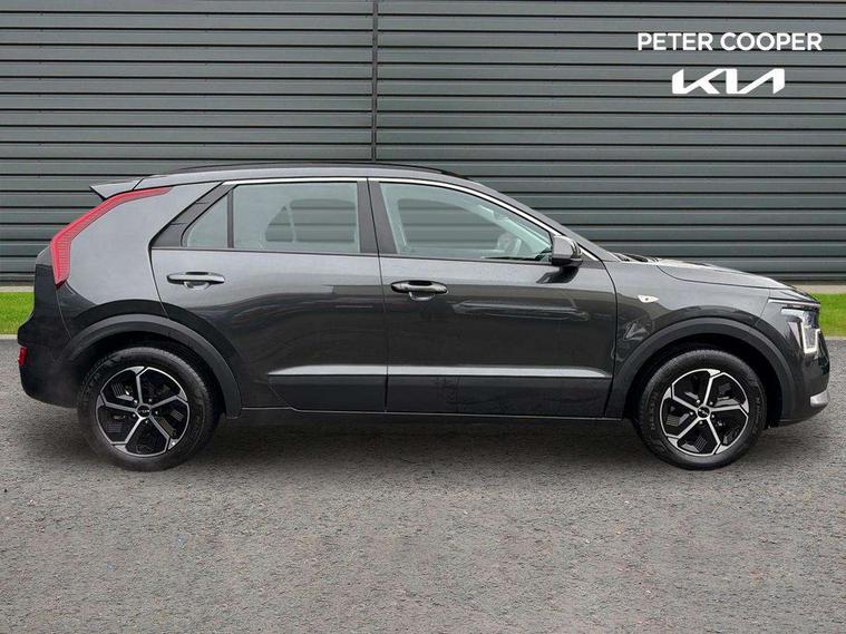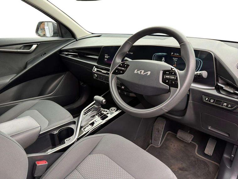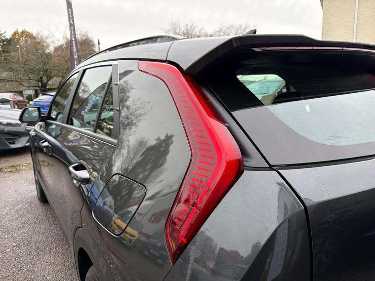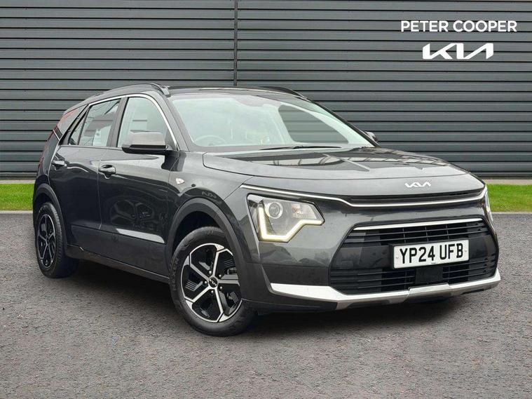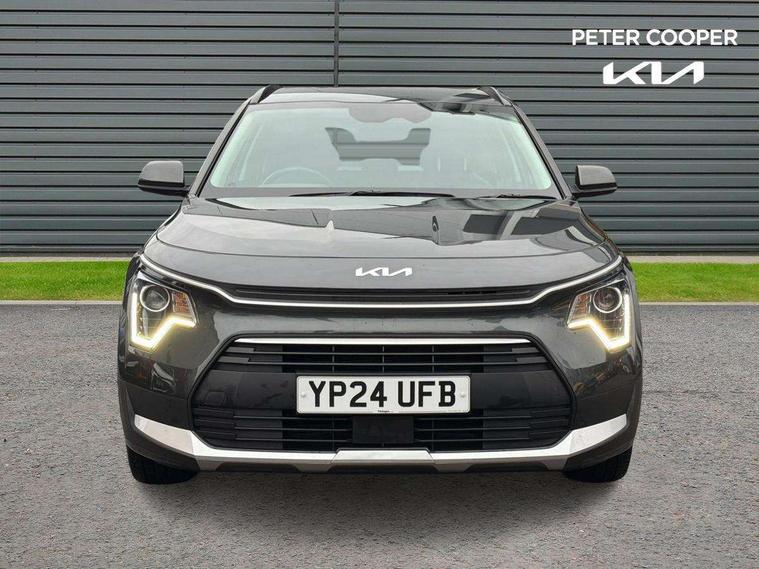 10.25" touchscreen satellite navigation, 4.2" supervision colour cluster display, Apple car play/Android Auto with voice control, Drive mode select (Eco, normal, sport, snow), E-call, Emergency stop signalling system, Forward Collision-Avoidance Assist (FCA) 1.5 - City/Pedestrian/Cyclist/Junction turning, Intelligent speed limit assist, Kia Connect (UVO), Lane Following Assist (LFA), Lane keep assist, Motor driven power steering, Rear parking sensors, Reversing camera system, Smart cruise control with stop and go functionality, Tailgate, Trip computer with distance/fuel consumption/average speed, Sports H-Matic Automatic, 'Shark fin' mobile antenna, 6 speakers, Bluetooth with music streaming, DAB Digital radio, Steering wheel mounted controls, USB port for connection of a media device, Acoustic windshield, All round electric windows with drivers auto up/down function, Auto dimming rear view mirror, Automatic defog system, Automatic headlight control system, Bi-function halogen projector headlights, Black wheel arches, Black window surrounds, Body colour bumpers, Body colour door mirrors, Body colour exterior door handles, Electrically adjustable and heated door mirrors, Front and rear silver skid plates, Heated rear window, LED daytime running lights, LED High mounted brake light, LED rear combination lights, Manual folding door mirrors, Rear fog lights, Rear side wing doors, Rear spoiler, Rear wiper, Roof rails, Solar glass rear windows and tailgate, Solar glass windscreen, Welcome and follow-me home light functionality, Windscreen Washer Level Warning, 12V socket in front, 12V socket in luggage compartment, 3 seat bench in 2nd row, 60:40 split remote folding rear seats, All-round height adjustable headrests, Artificial leather centre console storage box, Artificial leather steering wheel, Centre console cupholder, Cloth upholstery, Driver seat manual adjustment, Driver/passenger sunvisors with illuminated vanity mirrors, Dual zone automatic air conditioning, Front and rear cabin lights, Front and rear door storage, Front passenger 1 x USB-C charging port, Front passenger seat manual adjustments, Glove box, H-Matic gear selection, ISOFIX Child seat top tethers and anchor fixings, Luggage area load cover, Luggage board, Luggage compartment light, Metal paint interior door handles, Rear centre armrest with cupholder, Rear passenger 2 x USB-C charging ports, Seatback pocket - driver, Seatback pocket - front passenger, Single front passenger seat, Tilt/telescopic adjustable steering wheel, Towing pack - Niro, 3 point seatbelts on all seats, ABS, Automatic unlocking of doors in case of impact, Curtain and side airbags, Dual shell horn, Electric parking brake with auto hold function, Electronic stability control, Front airbags, Front passenger airbag cut-off switch, Height adjustable front seatbelts, Hill start assist control (HAC), Knee airbags, Seatbelt reminder warning, Traction control, Tyre pressure monitoring system, Customisable automatic door locking, Customisable automatic door unlocking, Deadlocks, Engine Start/Stop Button with Smart Entry System, Locking wheel nuts, Manual child locks, Rear occupant alert, Smart key with motion sensor, Thatcham category 2 security alarm and immobiliser, Visible vehicle identification number, Warranty - 7 Years/ 100, 000 miles, Graphite paint centre fascia, 16" alloy wheels, Tyre mobility kit,