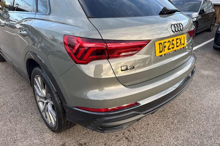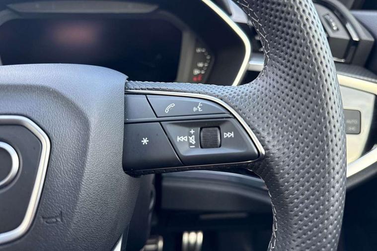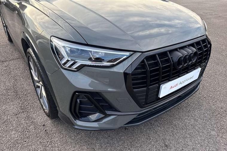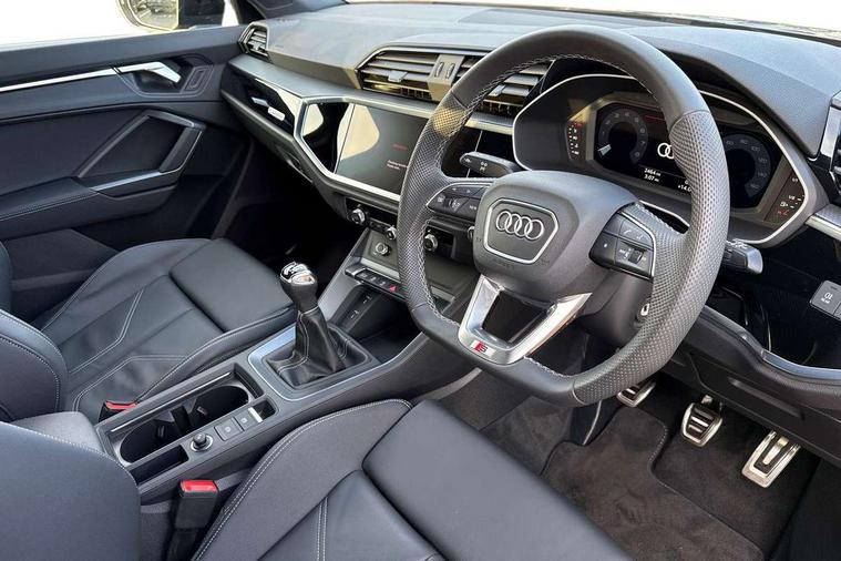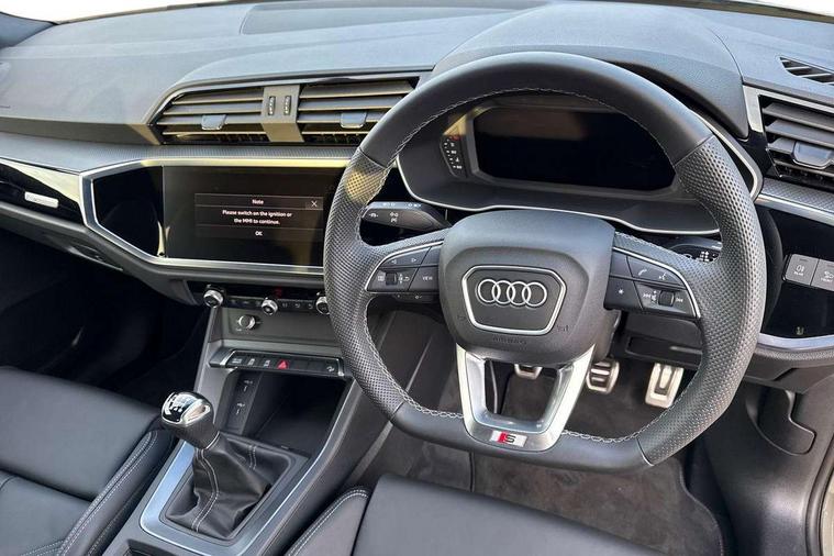 Amazon alexa Integration, Audi connect safety and service, Audi drive select, Audi lane departure warning, Audi Virtual Cockpit - 10.25" display, Bluetooth interface, Camera based traffic sign recognition, Cruise control + speed limiter, Distraction and Fatigue warning, Legal emergency call, MMI Navigation Plus with high resolution 10.1 inch touchscreen colour display, Power operated tailgate, Progressive steering, Rear parking sensors, Service interval indicator, Smartphone interface includes wireless Apple carplay/Android Auto, Start stop system with recuperation, Voice control system with natural language interaction, Sports suspension, 2 USB-C ports with charge and data functions, 6 passive loudspeakers, DAB digital radio module, Acoustic windscreen, Audi Beam uses LEDs to project the Audi logo onto the ground as you exit your Q3, Auto dimming door mirrors, Auto dimming frameless rear view mirror, Black roof rails, Electrically folding, adjustable and heated door mirrors with integrated LED side indicators and kerb view function for passenger side, Front and rear electric windows, Front fog lights, Grille vertical bars in aluminium silver/Matt, High gloss black finish B and C pillars, LED Dynamic rear indicators, LED headlights with LED daytime running lights, LED rear lights, LED third brake light, Privacy glass dark tinted rear and rear-side windows (from B-pillar backwards), Rain and light sensors, Rear diffuser grille in grained matt black, Rear diffuser strip in matt anthracite black, Rear side wing doors, Rear wiper, S line bumpers in contrasting Manhattan grey, Variable front intermittent wipers, 12V socket in rear centre console, 3 seat bench in 2nd row, 3 spoke flat bottomed multi-function leather sport steering wheel, 40:20:40 folding with manual adjustment for 60:40 forwards/backwards position and backrest angle, Adjustable rear seat bench/backrest with centre armrest and cupholder, Black cloth headlining, Dual zone electronic climate control, Electric lumbar support, Front and rear black floor mats with contrast stitching in rock grey, Front and rear headrests, Front centre armrest, Height and reach adjustable steering wheel, Illuminated door sill trims with S logo, ISOFIX child seat mounting for front passenger with airbag deactivation and outer rear seat including top tether attachment point for outer rear seats, Manual front seats with height adjustment, Perforated leather gearknob, Single front passenger seat, Stainless steel luggage compartment sill finisher, Stainless steel pedals, Twin leather upholstery with front sport seats + S embossing, Black styling pack - Q3, Non smoking pack - Q3, 3x3 point rear seatbelts, 6 airbags - Driver, front passenger, curtain and side windows, Audi pre-sense front with pedestrain and cyclist recognition, Electrically operated child locks on rear doors, Electromechanical parking brake, Electronic stabilisation control including ABS, ASR and EDL, Front seatbelt reminder, Hill descent control, Hill hold assist, Pre sense basic, Seatbelt monitoring, Tyre pressure warning, Warning triangle and first aid kit, Anti theft wheel bolts, Immobiliser, Remote central locking, Thatcham approved category 1 anti theft alarm, Aluminium look interior elements, Detail dashboard around MMI touch colour display in glass look, black with surround in aluminium look, Leatherette door armrest, Piano black inlay,