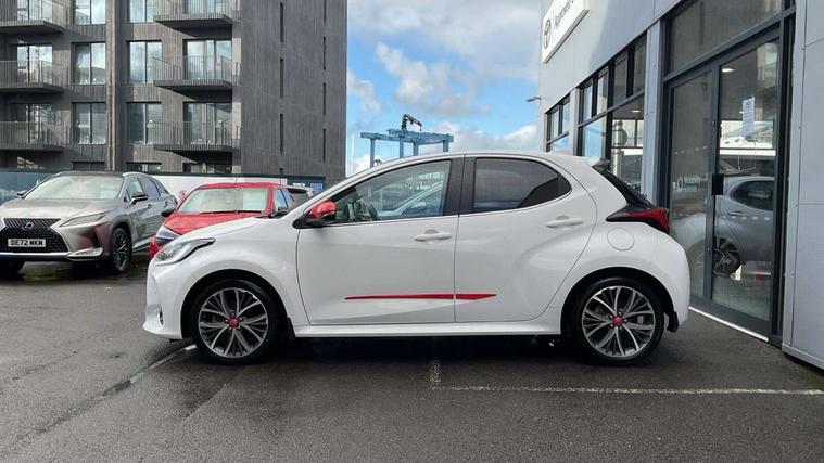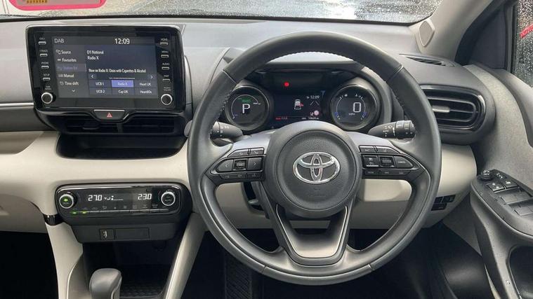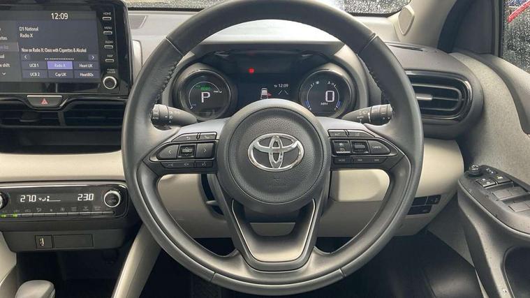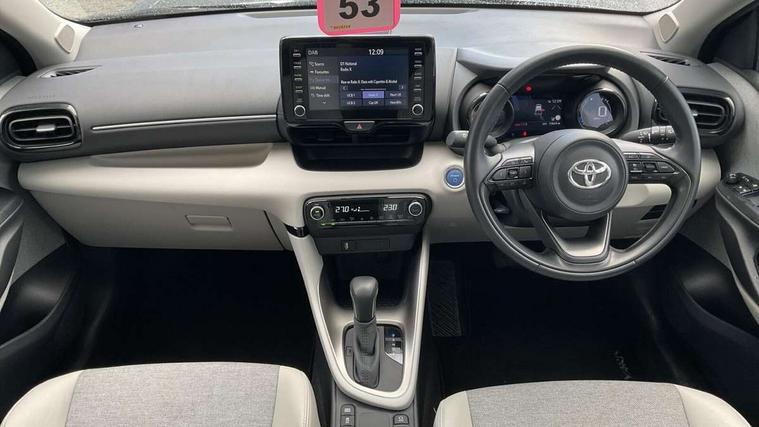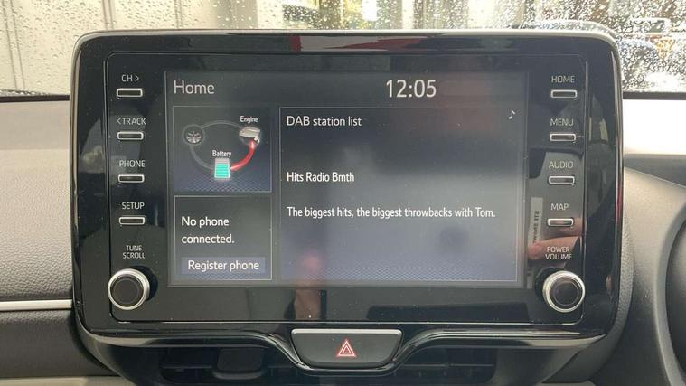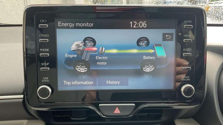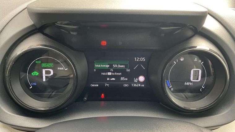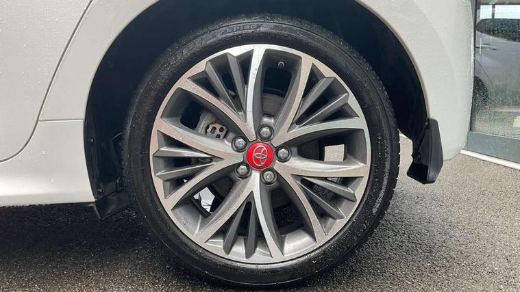Adaptive cruise control, Adjustable speed limit with speed warning, Blind spot monitoring, Bluetooth connectivity, Colour binocular inspired displays with digital speedometer, E-call, Electric power steering, Front and rear parking sensors with intelligent clearance sonar and automatic braking, Hybrid energy display, Multi information display switches on steering wheel, Reversing camera, Smartphone integration with Apple CarPlay and Android auto, Vehicle Stability Control (VSC), 6 speakers, 8" Multimedia display touch screen, USB connection, Acoustic windscreen glass, Automatic headlights, Automatic windscreen wipers with rain sensor, Automatically retractable door mirrors, Body coloured door mirrors, Electric adjustable heated door mirrors, Follow me home headlights, Front auto power windows with anti jam protection, Full LED rear lights, LED daytime running lights, LED front fog lights, LED Headlights, LED High mounted stop lamp, Painted front grille, Rear auto power windows with anti jam protection, Rear privacy glass, Rear side wing doors, Rear spoiler, Rear wiper, Satin lower front grille, Shark fin antenna, Turning signal integrated indicators in door mirrors, 3 adjustable rear headrests, 3 spoke leather steering wheel, 60/40 split folding rear seat, Active headrests, Adjustable boot height, Coat hooks in rear grab handles, Cup holders (2 front & door), Data Communication Module (DCM) connected services, Dual zone automatic air conditioning, Fabric seat with partial synthetic leather upholstery, Front armrest, Front sport seats, Glovebox, Height adjustable driver's seat, Height adjustable passenger seat, Isofix seat fixing, Leather gearshift, Map pockets on the backs of the front seats, Pollen filter, Shopping bag hooks, Single front passenger seat, Tilt/telescopic steering column, 3 point seatbelts on all rear seats, ABS+EBD+Brake assist, Electronic parking brake, Emergency brake light system (EBS), Front passenger airbag on/off switch, Front seatbelt reminder, Hill start assist control (HAC), Rear child proof door locks, Rear seat belt reminder, Supplemental Restraint System (SRS) 8 airbags: Driver & passenger's airbags, dual side curtain airbags, side impact airbags, front centre airbag, Toyota Safety Sense 2, Precollison + Night time Pedestrian & Cyclist Detection, Lane Trace Assist, Auto High Beam, Intelligent ACC & Road Sign Assist, Tyre pressure warning system, Alarm/immobiliser, Keyless smart entry with push button start, Remote powered central double locking doors, Satin chrome interior styling, Soft touch instrument panel, Space saver spare wheel,