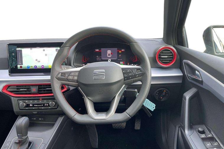 'Lights On' Reminder warning buzzer, 8" Digital cockpit, 9.2" touchscreen navigation system with type C USB socket, Voice control and DAB/AM/FM radio, Auto start and stop system, Bluetooth audio streaming with handsfree system, Digital clock, E-call, Full link smartphone integration with mirror link, wireless apple carplay, Google android auto + USB Type C cable for apple and android devices, Lane assist, Low fuel warning light, Outside temperature gauge, Power Steering, Rear parking sensor, Seat connect plus with safety, service, remote and online, SEAT drive profiles and ECO function, SEAT logo boot release, Speed limiter, Traffic sign recognition, Trip computer, Sports suspension, Auxiliary input socket, Radio/MP3 player, SD card slot, Steering wheel mounted controls, Anti theft roof antenna, Auto dimming rear view mirror, Automatic rain sensing wipers, Black door mirror caps, Body colour bumpers, Body colour door handles, Brilliant black window surrounds, Dark tinted rear windows, Electric adjustable/heated/folding door mirrors, Electric front windows, Electric headlight adjustment, Electric rear windows, Front/rear fog lights, FULL LED automatic headlights with dynamic headlight range control, coming and leaving home, LED daytime running lights, LED 3rd brake light, LED tail lights, Rear roof spoiler with FR twin exhausts, Rear side wing doors, Rear wiper, 3 seat bench in 2nd row, 60/40 split folding rear seat, Ambient interior lighting, Chrome detailing and black headlining, Cloth upholstery, Dual zone climate control with combination filter, Front courtesy lights, Front cupholders x 2, Front reading lights, Gear shift indicator, Glovebox, Height adjustable front and rear headrests (five), Height adjustable front seats, Height/reach adjust steering wheel, Illuminated air vent surrounds, Illuminated boot, Instrument lighting with brightness control, Isofix, Leather multifunction flat bottomed sports steering wheel with gearshift paddles, Passenger sunvisor, Single front passenger seat, Sports seats, Sunvisors with mirror and driver side card holder, Safety and driving pack (S) - Ibiza, 3 point seatbelts on all 3 rear seats, ABS, Active front headrests, Child locks on rear doors, Electronic stability control, Energy recovery system, Front driver and passenger side airbags with curtain airbag and front passenger airbag deactivation, Hill hold control, Multi-Collision braking, Seat belt reminder for front and rear seats, Tiredness recognition system, Tyre pressure monitoring system, Locking wheel bolts, Perimeter alarm and interior monitoring with backup horn and tow away protection, Remote central locking + deadlocks, 17" Alloy wheels in Brilliant silver,