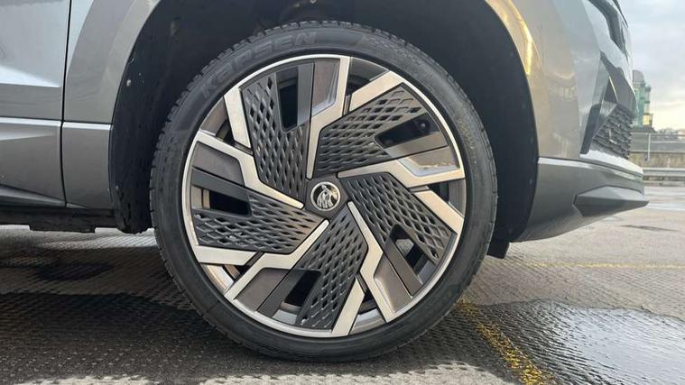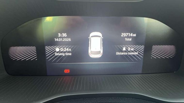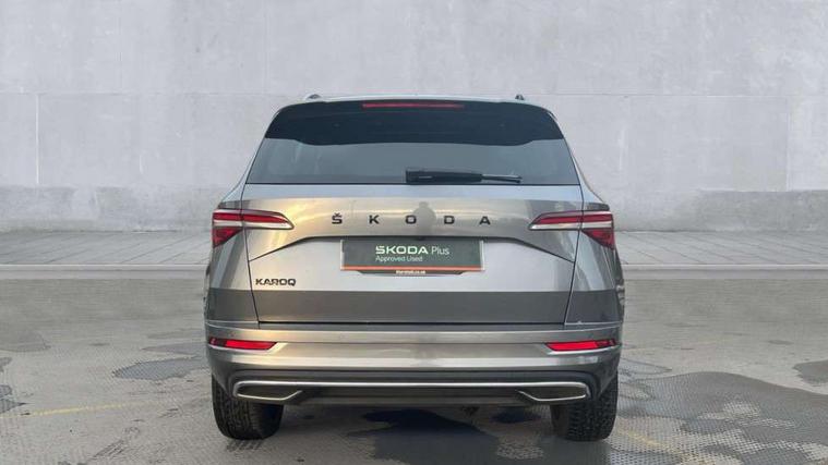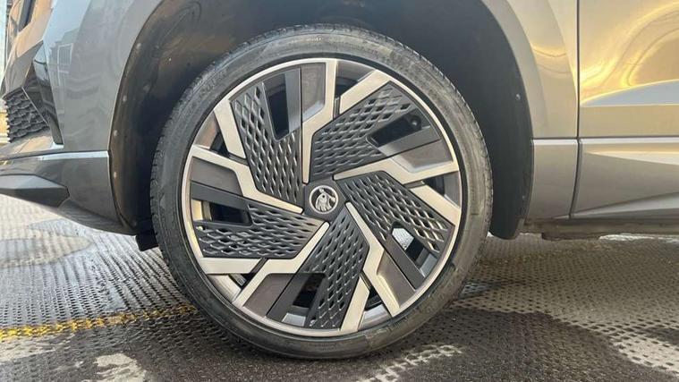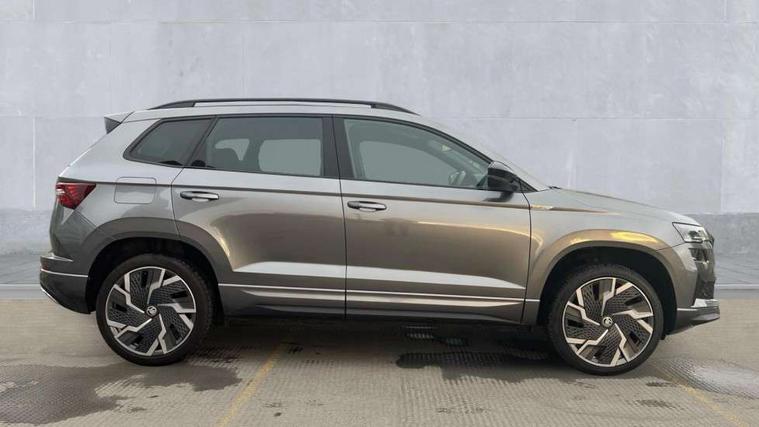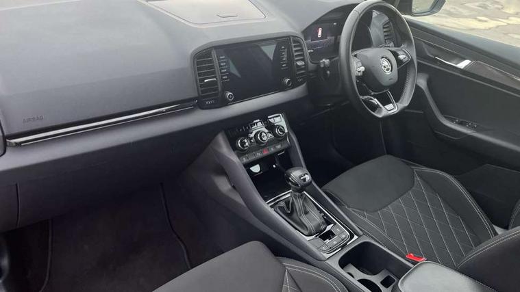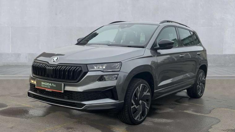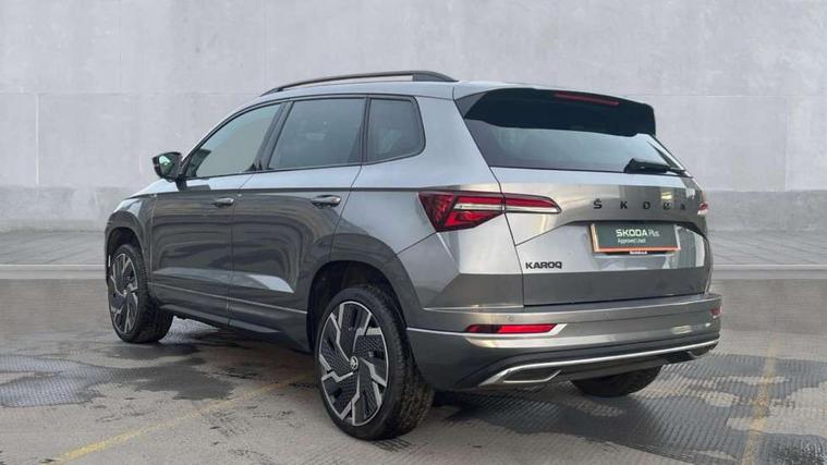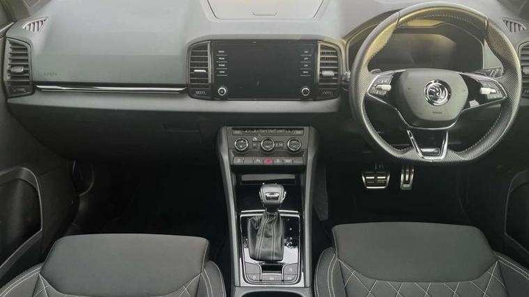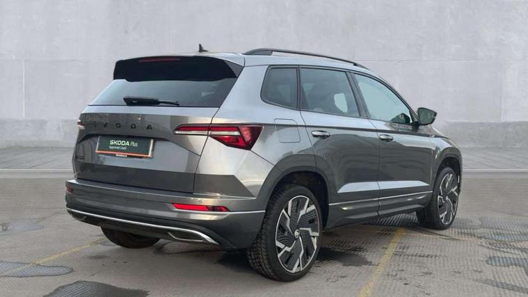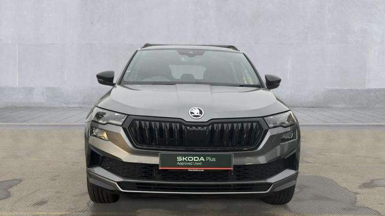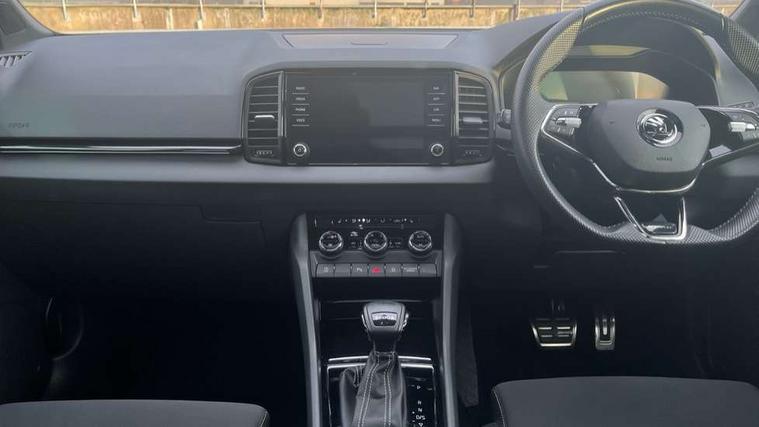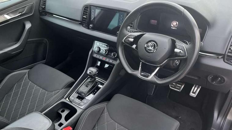 8" Digital display, Care connect, Driver fatigue sensor, Emergency services call system, Outside temperature gauge, Service interval indicator, SmartLink wireless for Apple and wired for Android, Start/stop system with regenerative braking, USB C Port x 2 in front centre console, Virtual pedal with electrically operated boot door, 8 speakers, DAB radio with Bluetooth, USB connection, Acoustic glass, Aero front windscreen wipers with intermittent function, Auto dimming rear view mirror with light and rain sensors, Black door mirrors, Black electric window control buttons, Black radiator grille, Black roof rails, Body colour door handles, Dynamic headlight range control with cornering light function, Electric front and rear windows with child proof lock, Front door steps with SportLine logo, Heated rear windscreen, LED daytime running lights, LED rear lights with high functionality welcome effect and dynamic indicators, Light assistant (coming/leaving home/tunnel light), Panoramic sliding sunroof, Plastic scuff plates, Privacy glass, Protective door side sills in body colour, Rear diffuser, Rear side wing doors, Rear spoiler, Rear window wiper with washer system and intermittent control, Safety reflectors on front doors, Skoda lettering on tailgate in black, Sportline badge on front fender, Sportline decorative inserts with badging, Sports front and rear bumpers, Third brake light, 1.5 litre bottle holders in driver and front passenger door panels, 12V socket in boot, 12v socket in front centre armrest with storage compartment and rear air vents, 2 Folding hooks and nets in boot, 3 rear height adjustable headrests, 3 seat bench in 2nd row, 3 spoke leather sports multifunction steering wheel and silver stitching with gear shift paddles, 4 foldable roof handles with rear coat hooks, Black floor carpet, Black roof headlining, Chrome inner door handles, Double sided boot floor, Foldable hooks in the boot, Front head restraints, Height adjustable front three point seats belts with tensioners, Height/reach adjust steering wheel, Ice scraper, Illuminated glovebox, Illuminated luggage compartment, Isofix child seat preparation outer rear, Manual lumbar support for front seats, Pen holder, Pollen filter, Rear boot cover, Rear reading lights, Rear seats fixed folding and divided 60:40, Rubbish bin door, Safety vest holder, Single front passenger seat, Storage box in upper central dashboard closed, Sunvisors with illuminated vanity mirrors, Textile floor mats, Ticket holder, Titan black interior ceiling, Tool kit, Welcome animation with sportline logo, Light Pack - Karoq, Parking pack - Karoq, Automatic door unlocking in case of crash, Automatic fuel cut off in case of crash, Child locks on rear doors, Driver airbag, Electronic parking brake with auto hold function, Emergency rear braking signal, ESC including ABS, MSR, ASR, EDS, HBA, DSR, RBS, MKB and traction control, Front side airbags, Hill hold control, Knee airbags, Passenger airbag with switch-off function, Pedestrian monitor, Seatbelt reminder signalisation and pretensioner for all seats, Three point seatbelts rear, Two tone horn, Tyre pressure display, Tyre pressure monitor, Alarm with interior monitoring, back up horn and tilt sensor with safe function, Electronic engine immobiliser, Keyless entry and start/stop, Remote central locking with 2 remote folding keys, Black air vent surround, Black centre console, Satin black dashboard, Satin black door trim, 19" Vega black polished alloy wheels, Anti-theft wheel bolts protection, Matt black aero hub caps, Storage on wheel cover,