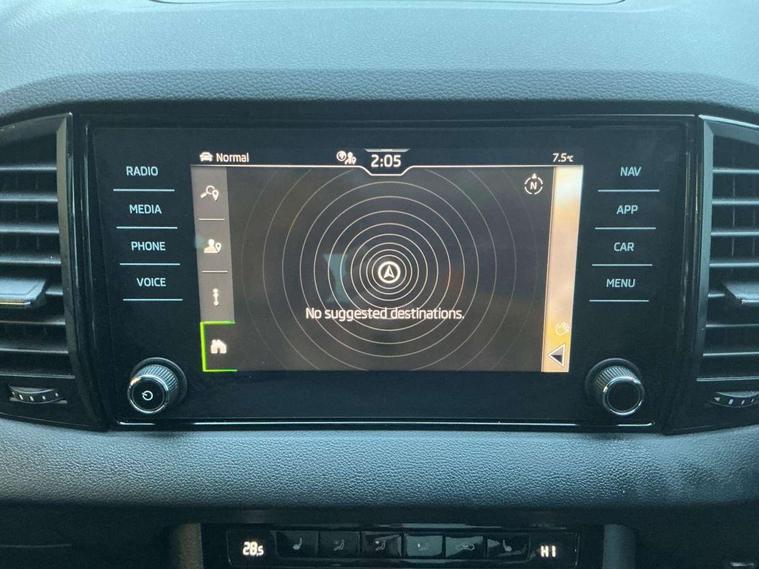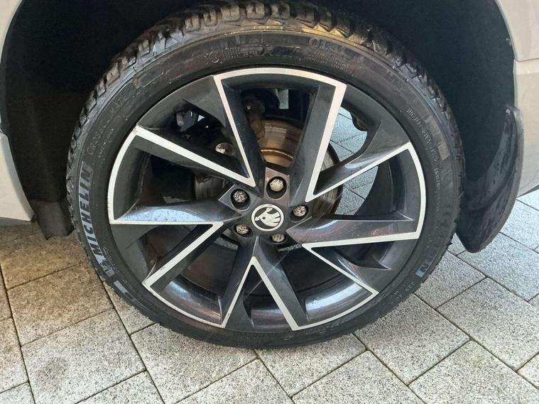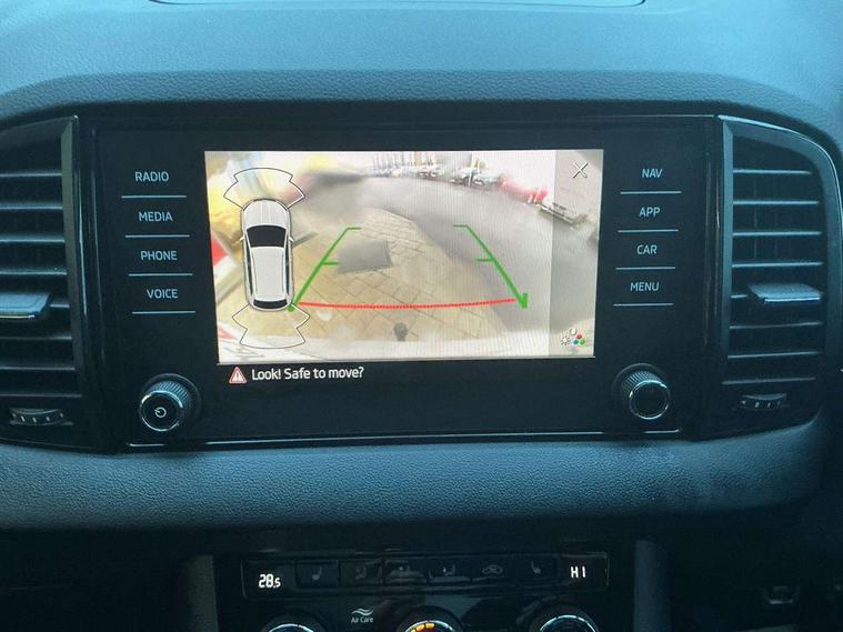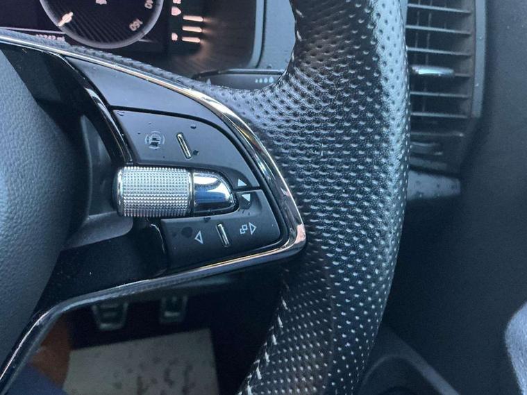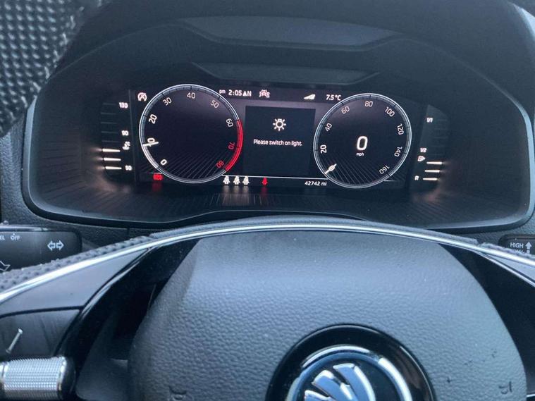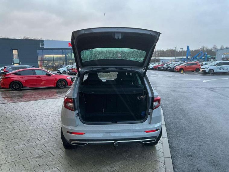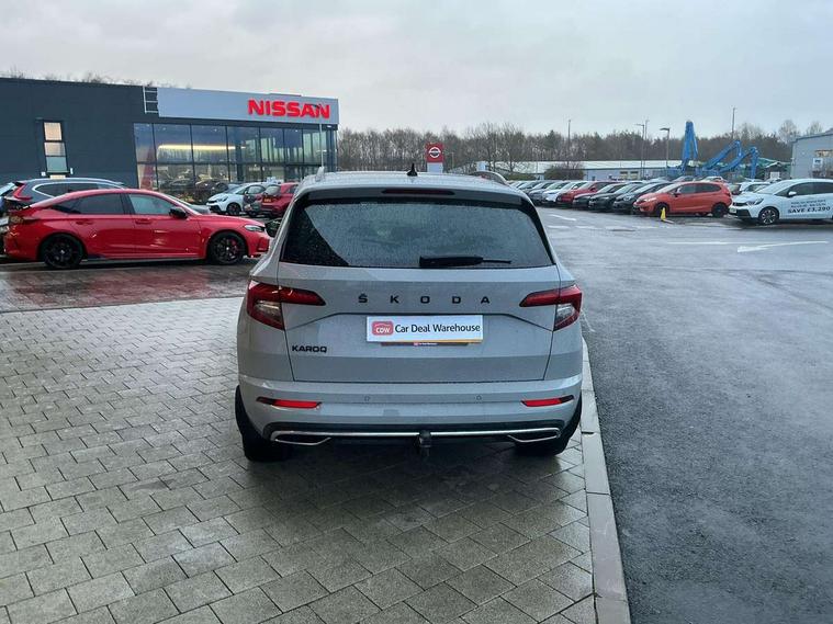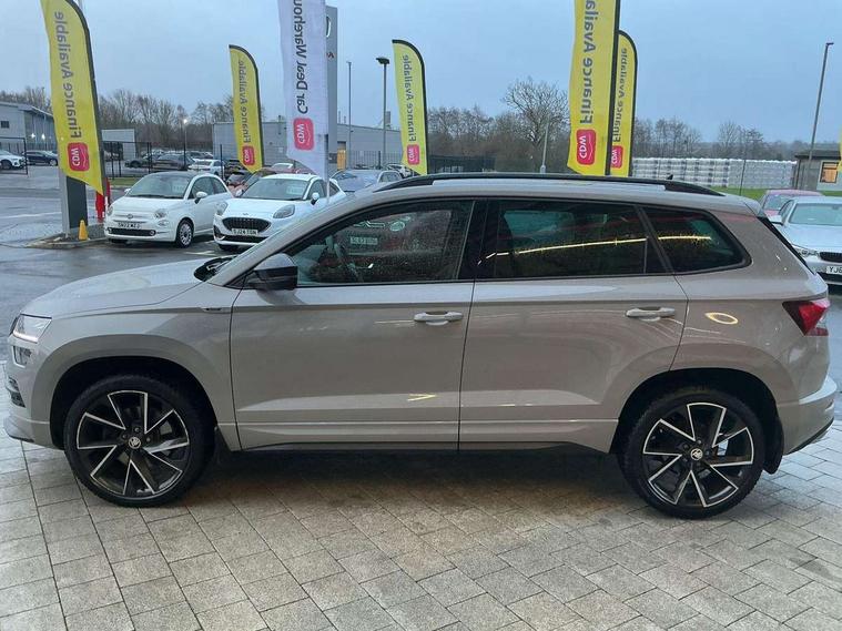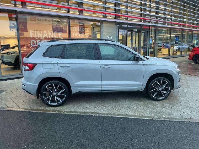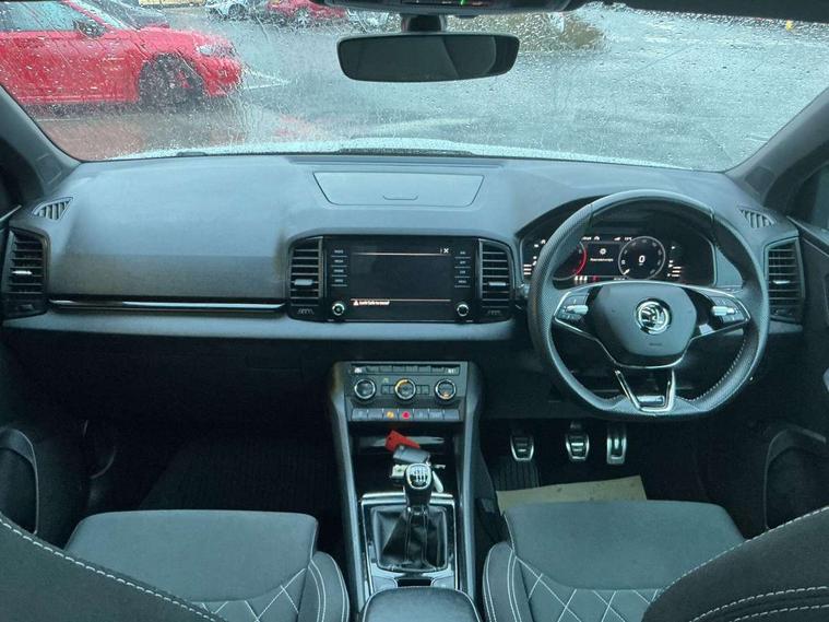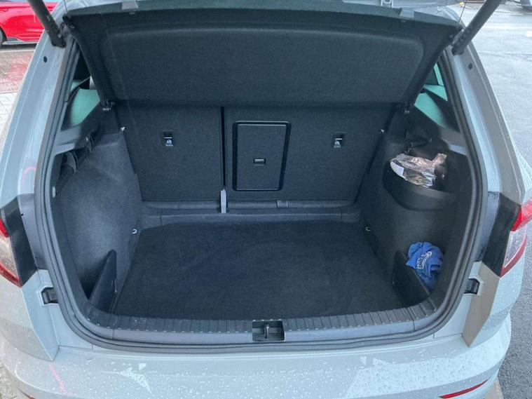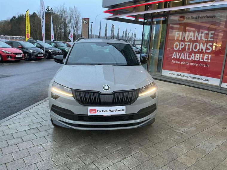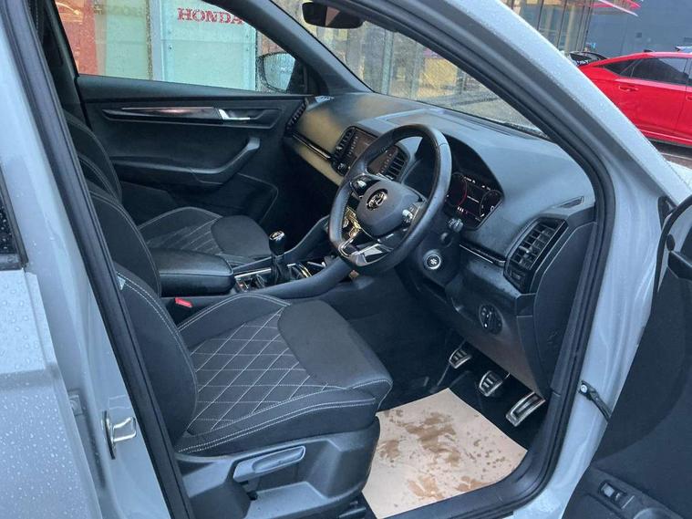 Care connect, Drive mode selector, Driver fatigue sensor, Multifunction colour trip computer, Outside temperature gauge, Service interval indicator, SmartLink wireless for Apple and wired for Android, Start/stop system with regenerative braking, USB C Port x 2 in front centre console, DAB radio with Bluetooth, USB connection, Wireless charging without wireless aerial connection, Acoustic glass, Aero front windscreen wipers with intermittent function, Automatic headlight control system, Black door mirrors, Black electric window control buttons, Black radiator grille, Black roof rails, Body colour door handles, Body coloured bumpers, Electric front and rear windows with child proof lock, Front door steps with SportLine logo, Full LED headlights + adaptive front light system + LED daytime running lights and front cornering fog lights, Headlight washers, Heated rear windscreen, LED rear lights with high functionality, Light assistant (coming/leaving home/tunnel light), Panoramic sliding sunroof, Privacy glass, Protective door side sills in body colour, Rear diffuser, Safety reflectors on front doors, Skoda lettering on tailgate in black, Sportline badge on front fender, Sportline decorative inserts with badging, Sports front and rear bumpers, Third brake light, 1.5 litre bottle holders in driver and front passenger door panels, 12V socket in boot, 12v socket in front centre armrest with storage compartment and rear air vents, 2 Folding hooks and nets in boot, 2 Front readings lights for driver and passenger, 3 rear height adjustable headrests, 4 foldable roof handles with rear coat hooks, Aluminium pedals, Black roof headlining, Cargo elements in boot, Chrome inner door handles, Door sill scuff plates, Driver and passenger seats height adjust, Front head restraints, Height adjustable front three point seats belts with tensioners, Height/reach adjust steering wheel, Ice scraper, Illuminated and cooled glovebox, Illuminated luggage compartment, Isofix child seat preparation outer rear, Manual lumbar support for front seats, Net programme in boot, Pen holder, Pollen filter, Rear reading lights, Rear seats fixed folding and divided 60:40, Retractable parcel shelf attachable to tailgate, Safety vest holder, Solid rear boot cover, Storage box in upper central dashboard closed, Storage compartment below the passenger seat, Sunvisors with illuminated vanity mirrors, Textile floor mats, Umbrella under passenger seat, Welcome animation with sportline logo, LED Interior lighting pack with Skoda welcome logo - Karoq, Airbags - Front side, head, knee and curtain, Automatic door unlocking in case of crash, Automatic fuel cut off in case of crash, Driver airbag, Electronic parking brake with auto hold function, Emergency rear braking signal, ESC including ABS, MSR, ASR, EDS, HBA, DSR, RBS, MKB and traction control, Front assist radar scanning of the space in front of the car with automatic braking, Hill hold control, Passenger airbag with switch-off function, Pedestrian monitor, Seatbelt reminder signalisation and pretensioner for all seats, Three point seatbelts rear, Two tone horn, Tyre pressure display, Tyre pressure monitor, Alarm with interior monitoring, back up horn and tilt sensor with safe function, Electronic engine immobiliser, Keyless entry and keyless start with safe system, Remote central locking with 2 remote folding keys, Black air vent surround, 19" Vega anthracite alloy wheels, Anti-theft wheel bolts protection, Storage on wheel cover,