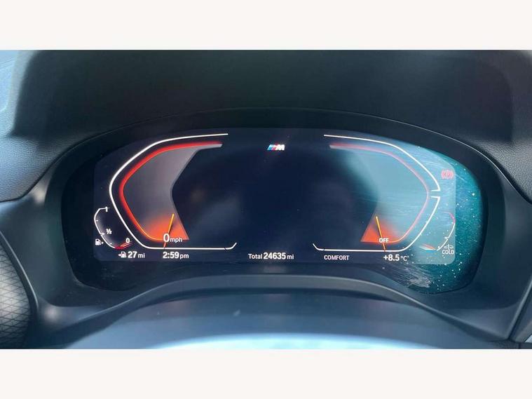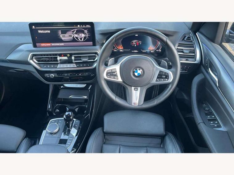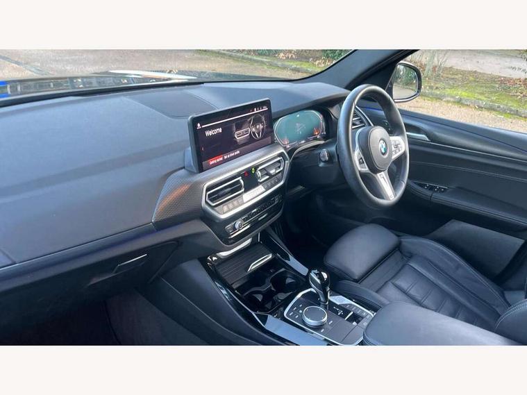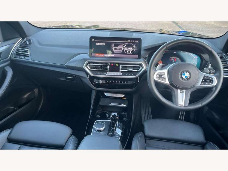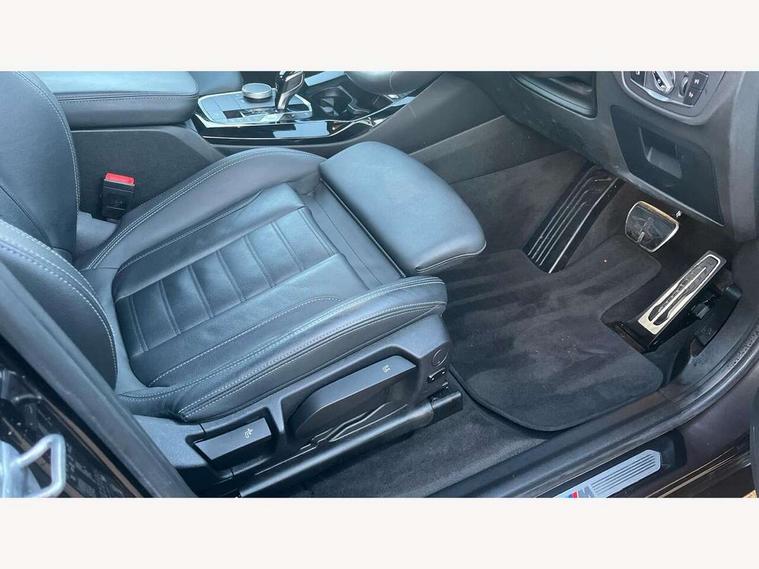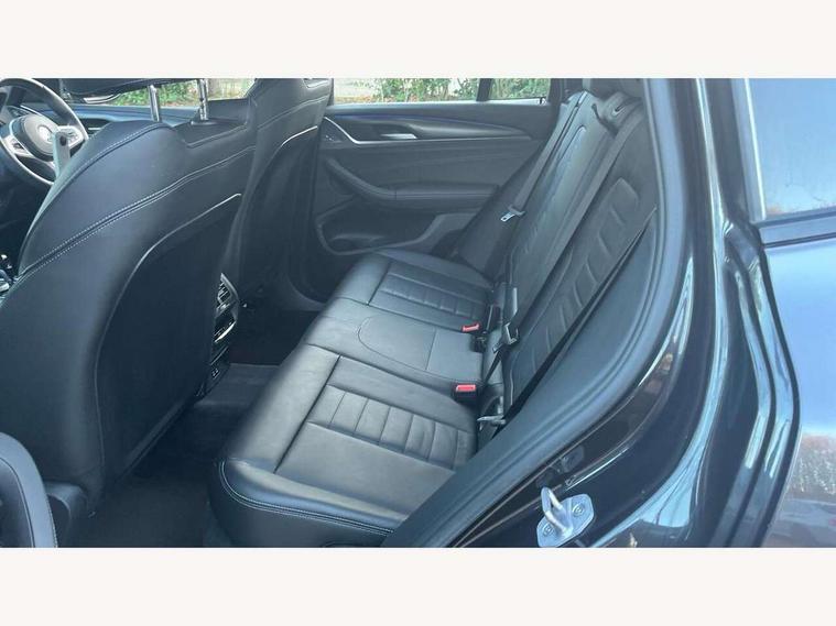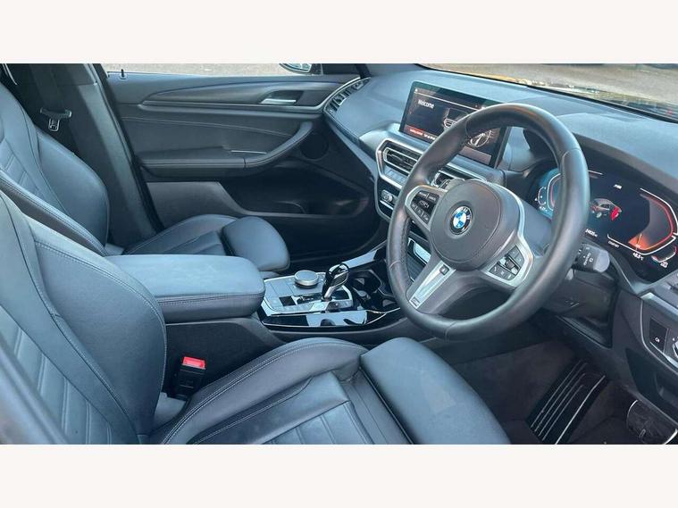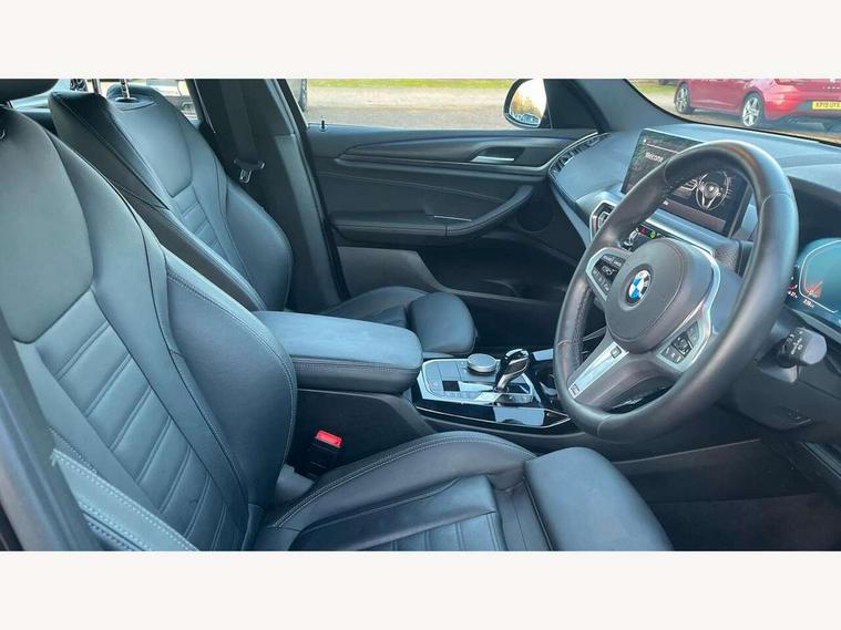 Active Guard, Attentiveness assist, BMW Live Cockpit Professional nav system including 12.3" instrument display + 12.3 high resolution control display, BMW Online services, BMW Teleservices, Brake pad wear indicator in front and rear, Check Control warning system for monitoring of lights and door/luggage compartment open warning, Condition based service - BMW service history, electronic service booklet, integrated owner's handbook, Connected drive services, Electric boot lid, Front/rear Parking distance control, iDrive touch controller with 8 favourite buttons, Instrument cluster with speedometer with mph readout, tachometer, fuel gauge and oil temperature gauge, Lights on warning by audio warning signal when ignition is switched off, Oil sensor for level and grade, warning by check control system, On board computer - average speed+fuel consumption, service interval, clock/date, odometer/trip meter, outside temperature display and ice warning, Optimum shift indicator, Personal Profile - automatic lock when driving away selectable, Run flat indicator, Stop/start system, Variable sports power steering with drive performance control Sport+ mode, Automatic transmission with gearshift paddles, Incorrect fuelling protection, M sport suspension, Multi-link rear suspension, BMW professional radio/CD/MP3, DAB tuner, Acoustic glazing, Automatic windscreen wipers and automatic headlight, Black finish on B pillars, Body colour door handles, Body colour electric adjust heated aspherical door mirrors, Body colour roof mouldings, Body coloured bumpers, Direction indicator, side repeaters, integrated in exterior mirrors, Dynamic brake lights, Exhaust tailpipes - dual, round, split left and right with chrome finisher, Fingertip control / anti-trap function on electric window, Folding wing mirrors with auto dimming, Follow me home headlights, Front and rear bumper system with replaceable deformation elements, Front and rear electric windows, Gloss chrome tailpipes finishers, Green tinted heat insulating glass, Heated windscreen washer jets, High beam assistant, High gloss black shadow line roof rails, High gloss shadowline exterior trim in decorative moulding side frame/recess cover/guide rail/B, C pillars/mirror frame and triangle with mirror base, High level 3rd brake light incorporating LED Technology, Interior rear view electrochromatic mirror with automatic anti dazzle function, LED tail lights, Lightweight engineering, M aerodynamic bodystyling, M Sport entry door sill strips, Model designation, Rain sensor, Rear side wing doors, Rear wing door, Rear wiper, Shark fin antenna, Side exterior M designation badges, Visible VIN plate, Welcome lighting, Windscreen wipers with adjustable interval, 12V power point in luggage area, 12V power socket in front centre console, 2 x USB Type C ports for charging and data transmission (front centre console) and 2 x USB Type C ports for charging (rear centre console), 3 rear headrests, 3 seat bench in 2nd row, 3 zone automatic air conditioning, 4 lashing points to secure luggage, 40:20:40 split folding rear seat with loading system, Ambient lighting, Anthracite headlining, Automatic interior light when door is opened/ignition switched off or via remote key, Floor mats in velour, Foldable storage floor with compartment, Four grab handles integrated in roof lining, Front and rear bottle holders integrated into door trim storage compartments, Front and rear side armrests integrated into door trim, Front centre armrest with storage compartment, Front footwell lights, Front head restraints, Front passenger seat, Front sports seats, Front/rear courtesy lights with soft on/off dimming, Front/rear reading lights, Heated front seats, Isofix rear child seat preparation, Leather gear knob, Lockable glove compartment, Luggage area underfloor compartment, Luggage compartment lighting, M sport leather steering wheel, Multifunction steering wheel, Parcel shelf removeable and storable under boot floor, Reach and rake adjustable steering column, Rear centre armrest with 2 cupholders, Removable / retractable luggage cover, Slope adjustable rear seats, Storage compartment in rear centre console and front/rear door trims, Sun visors with vanity mirrors and ticket pocket, Toolkit located in luggage compartment, Two front cupholders with removable oddments tray/lid, Connected pro pack - X3, ADB - Automatic Differential Brake, Anti-lock braking system (ABS) with brake assist, Automatic Stability Control (ASC), Battery safety cut-off, BMW emergency call, Brake drying, Brake energy regeneration, Braking pre-tensioning, Child locks on rear doors, Cornering brake control (CBC), Crash Sensor - activation of central locking release, hazard warning light and interior lighting, Deactivation of fuel pump in the event of a crash, Driver and front passenger front and side airbags with passenger deactivation and ITS front and rear head airbags, Driver and front passenger knee airbag, DSC+, Dynamic brake control, Dynamic Traction Control - DTC, Electromechanical parking brake, Hill descent control, Hill start assist, Seatbelt security check for front seats, Side impact protection, Three point seatbelts to all seats with front and outer rear pyrotechnic belt tensioners and seat belt force limiters, Two tone horn, Tyre pressure sensor, Ventilated front and rear disc brakes, Warning triangle and first aid kit, Central locking switch for all doors, fuel filler cap and luggage compartment, Electronic engine immobiliser, Locking wheel nuts, Remote control including two integrated key - one button for open/close all lockable content, windows and separate button for open luggage compartment, Remote control Thatcham category 1 alarm, Start/stop button with Comfort Go keyless engine start and auto Start/stop deactivation button, Low rolling resistance tyres,
