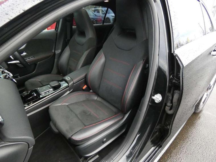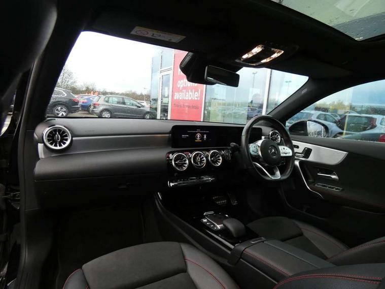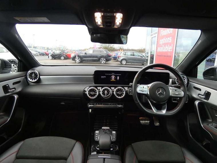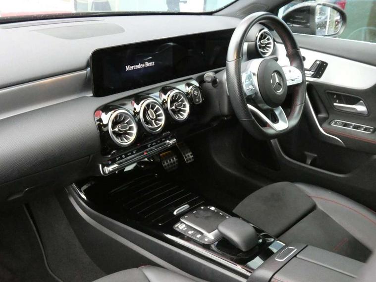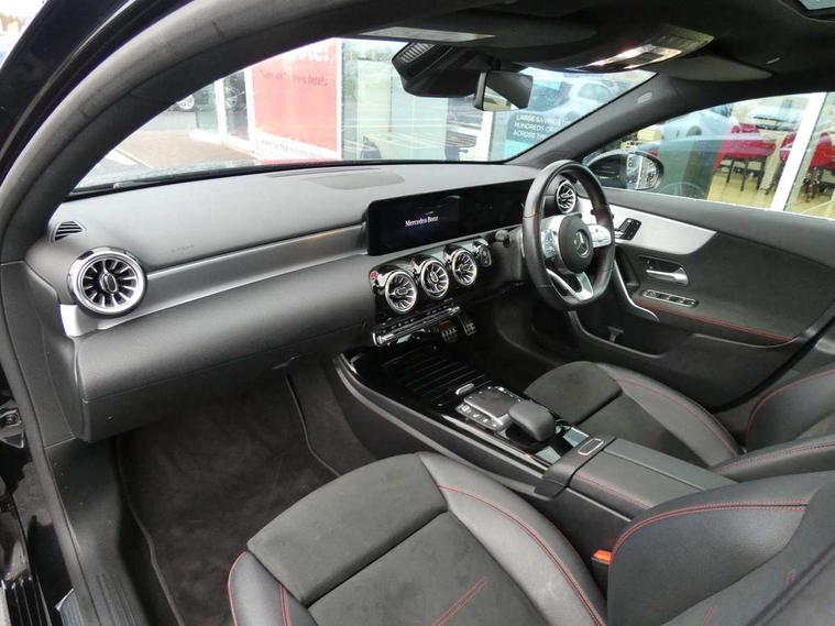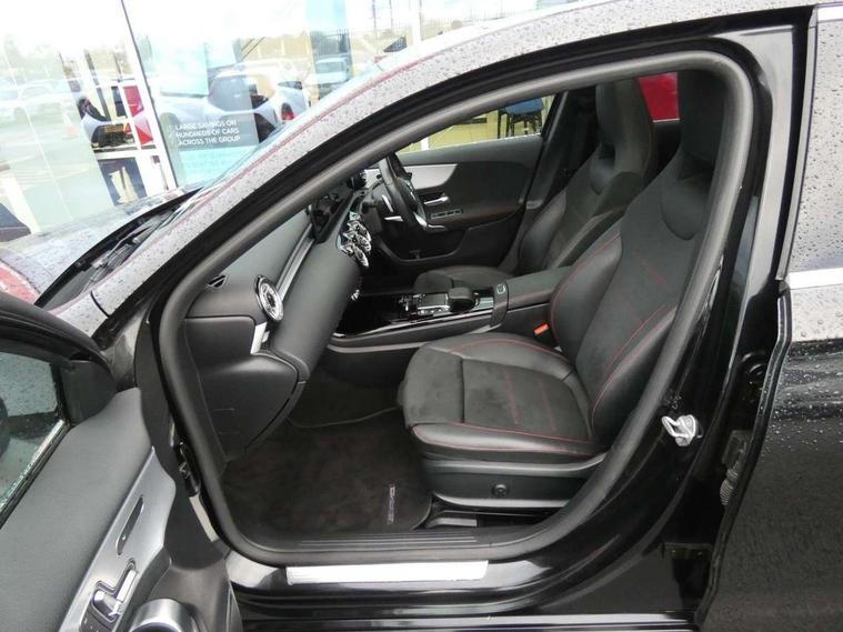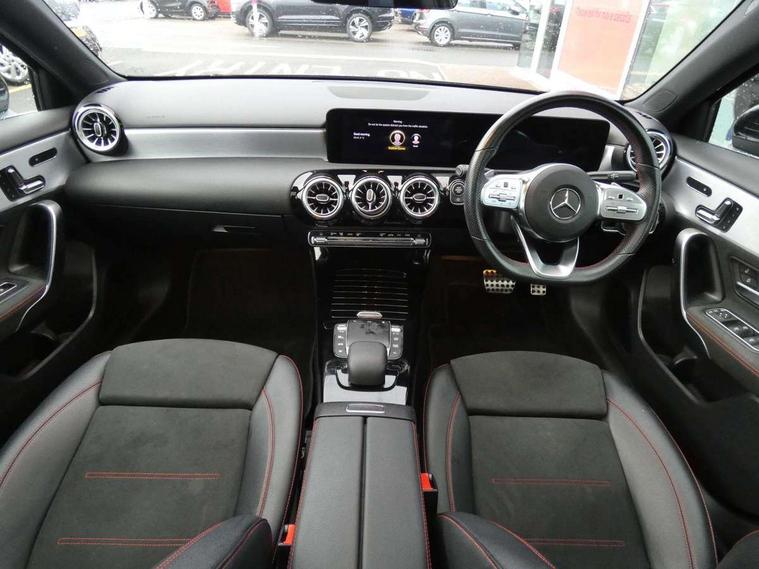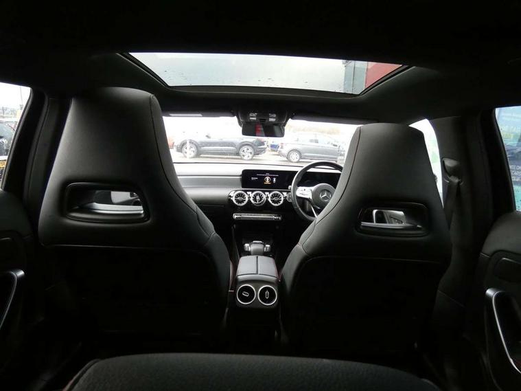 Ultrasonic sensors positioned in the front and rear bumpers, 10.25" Digital instrument cluster display screen, 10.25" media display, 180 degree rear view camera with parking guidelines, Active parking assist with visual and audible warning of detected obstacles, Attention assist, Brake pad wear indicator warning light, Car wash mode, Direct steering, Dual bluetooth interfaces, DYNAMIC SELECT with a choice of driving modes (ECO, Comfort, Sport and Individual), ECO start/stop function, Fluid level warning indicator for fuel, oil, coolant and washer fluid, Hard-disk navigation, Hey Mercedes Voice activation, Lamp failure indicator, MBUX augmented reality for navigation, Mercedes me connect including emergency call system, accident recovery, breakdown management and maintenance, Mercedes me remote services, Outside temperature gauge, Owners manual in English, Pre-installation for car sharing, Preinstallation for Mercedes Benz link, Service indicator (ASSYST), Smartphone integration with Apple CarPlay and Android auto, Traffic sign assist, Trip computer, Wireless charging, Lowered comfort suspension, Rear axle torsion beam, 10 speakers, 2 USB ports (type C) in rear stowage compartment and one in front of center console, DAB Digital radio, MBUX multimedia system with DAB digital radio and touchpad including satellite navigation, Mercedes-Benz advanced sound system - 225W, 4 Electric Front and Rear windows, Adaptive brake lights, AMG bodystyling - Front apron with splitter in chrome, rear apron with chrome trim and chrome visible trim elements in tailpipe, Black weather strip, Body colour bumpers, Body colour door handles, Body colour side skirt, Body coloured door mirrors, Chrome beltline trim, Diamond radiator grille with chrome pins and silver louvre + chrome insert, Electric adjustable and heated door mirrors with integrated LED side indicators, Exhaust system - Twin visible tailpipes in polished stainless steel, Headlamp assist automatic headlamp activation, Heated glass rear windscreen + timer control, LED high performance headlamps with integrated LED daytime running lights, LED tail lamp, LED third brake light, Multibeam LED with adaptive highbeam assist plus, Panoramic sliding sunroof, Privacy glass, Radio aerial, Rain sensing windscreen wipers with two sensitivity settings, Rear fog lights, Rear wiper, Window line trim strip in chrome, 3 Spoke flat bottom leather multi function steering wheel with perforated leather in grip area, 40:20:40 split folding rear seats, Artico man-made leather/Microfibre Dinamica upholstery with red contrast stitching, Auto Mercedes-Benz child seat recognition sensor, Black air vents with surround in silver chrome, Black roof lining, Brushed stainless steel sports pedals with rubber studs, Controller on centre console with chrome surround, Electrically adjustable front memory seats including lumbar support, Floor mats with stitched edging and AMG lettering, Front centre armrest with storage compartment, Front seat backs luggage nets, Front seat cushion length adjustment, Galvanished gear shift paddles on steering wheel, Heated front seats, Height/reach adjustable steering column, Illuminated front door sills with changeable cover, Interior lighting - 64 colour Ambient lighting, Interior mirror with reading lamps in black and frameless, ISOFIX and top tether child seat fixing points in two outer rear seats, Rear armrest with 2 cupholders, Rear head restraints, Seat occupancy sensor for front passenger seat, Sports seats with integrated headrests, Stowage compartment in centre console with retractable cover, Sunvisors with illuminated vanity mirrors, Touchpad on center console, Twin front cupholders, Two zone thermotronic luxury automatic climate control, Light and sight pack - A Class, Mirror package - A Class, Seat comfort pack - A Class, 3 rear 3 point seatbelts, ABS with Brake Assist, Active bonnet, Adaptive brake assist with hold function and hill start assist, Black seatbelts, Childproof locks manually operated for rear doors and electrically operated for rear power windows, Crash responsive emergency lighting, Driver and passenger head and side airbags, Drivers knee airbag, Dual stage driver/passenger airbags, Electronic parking brake, ESP curve dynamic assist, ESP with ASR, Front and rear seatbelt reminder, Front brake callipers with Mercedes Benz lettering, Tyre pressure monitoring system, Warning triangle and first aid kit, Window airbags, Alarm system/interior protection/immobiliser, Keyless entry lock/unlock, Keyless Go, Remote central locking and crash sensor with emergency opening function, Urban guard vehicle protection system with immobiliser and interior protection, Light aluminium with longitudinal grain interior trim, 18" AMG 5 twin spoke light alloy wheels in titanium grey with highsheen finish, Summer tyres, Tirefit sealant kit,