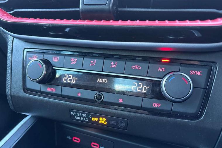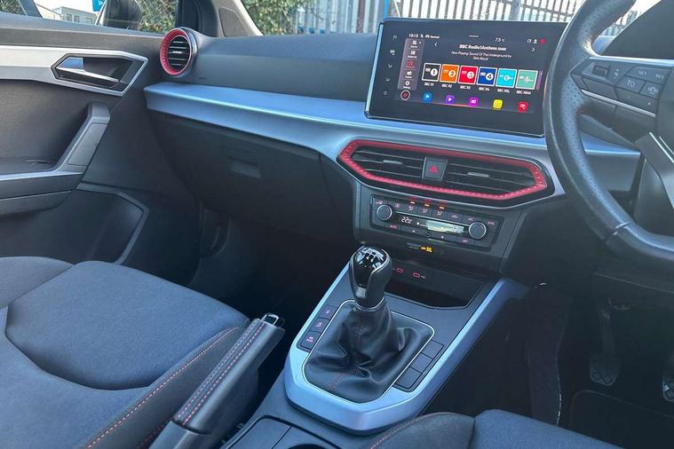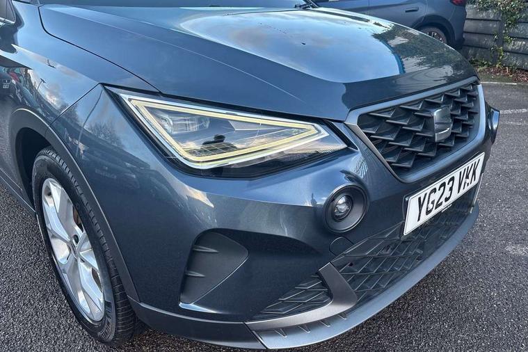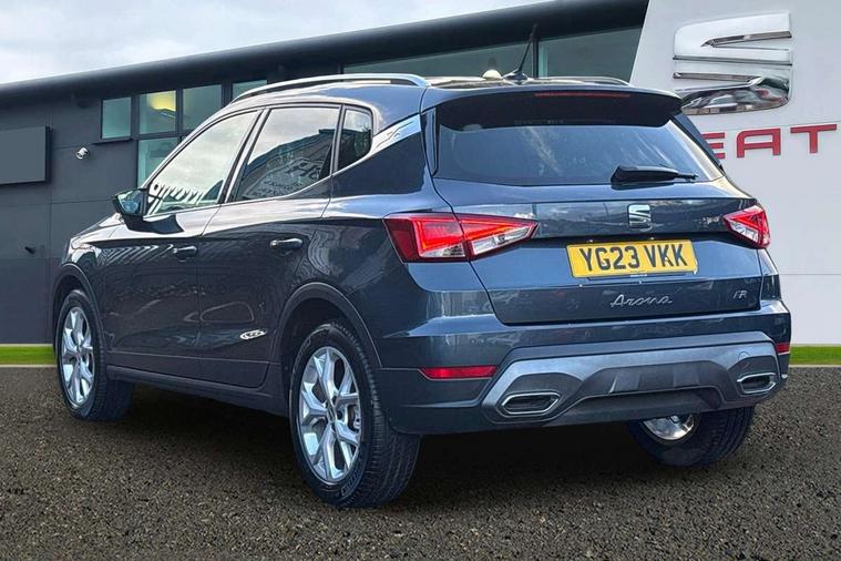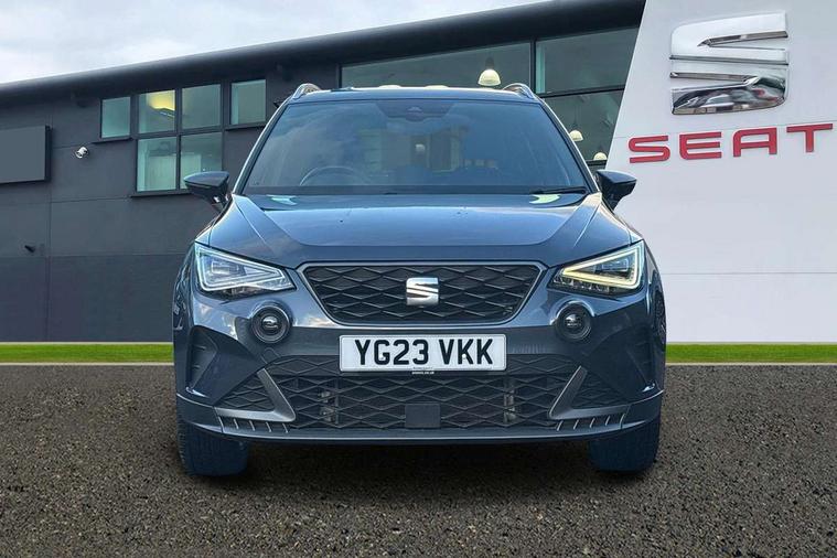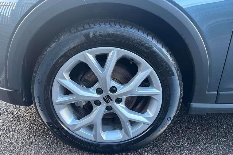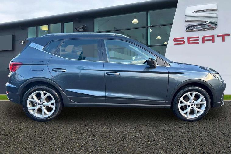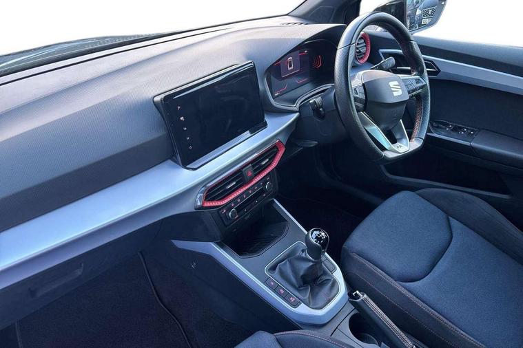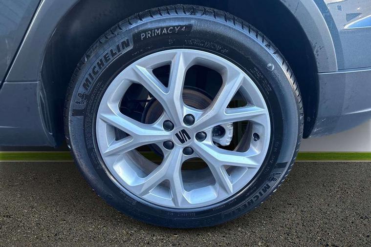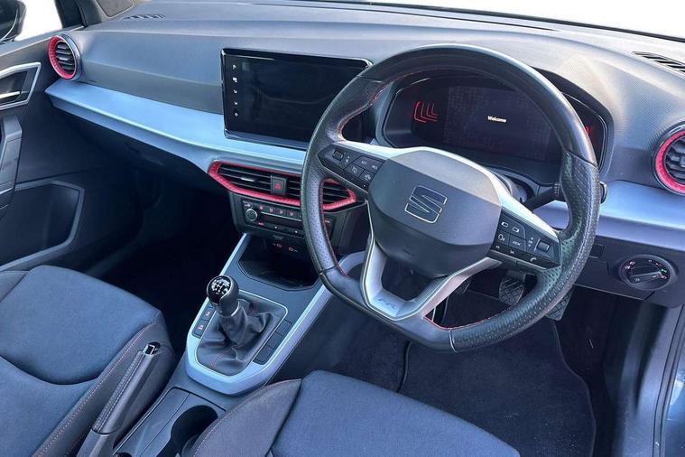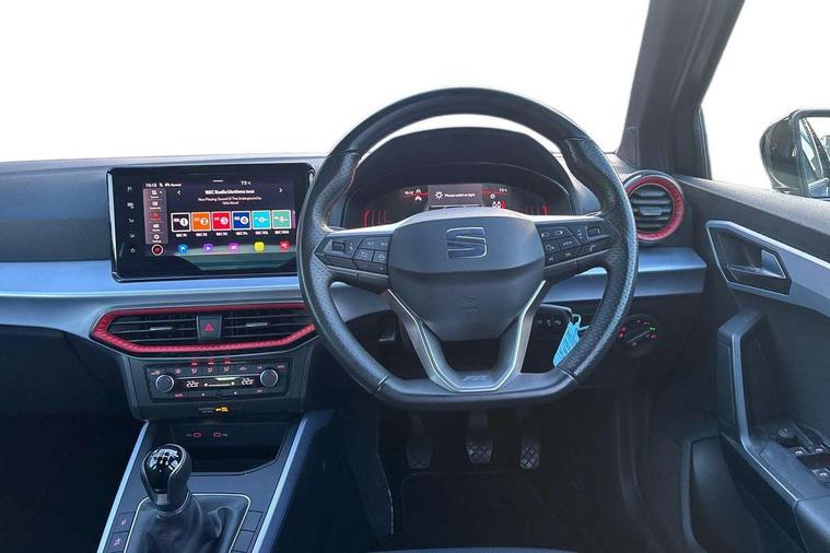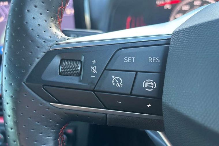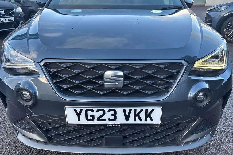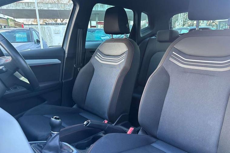 'Lights On' Reminder warning buzzer, 8" Digital cockpit, Digital clock, E-call, Electric speed sensitive power steering, Full Link Smartphone Integration with Mirror Link, Apple Car Play, Google Android Auto with USB Type C cable for Apple and Android compatibility, Lane keeping system, Low fuel warning light, Outside temperature display, Rear parking sensor, RPM counter, Seat connect with safety, service, remote and online, SEAT Drive profile - Four different models normal-sport-eco-individual, steering response, throttle response, Trip computer, Wireless phone charger, 9.2" colour touchscreen with navigation system, voice control and USB port (type c), Bluetooth interface for hands free and audio streaming, DAB digital radio and AM/FM radio, Steering wheel mounted audio controls, Anti theft roof antenna, Auto dimming interior rear view mirror, Automatic activation of hazard warning lights, Body coloured bumpers, Body coloured door handle inserts, Chrome roof rails and window surrounds, Dark tinted rear windows, Electric front/rear windows, Electrically adjustable, heated and folding door mirrors, Front fog lights with cornering function and rear fog light, FULL LED automatic headlights with dynamic headlight range control, coming and leaving home, LED daytime running lights, LED rear tail lights and licence plate lights, Protective side mouldings, Rain sensing wipers, Rear side wing doors, Rear spoiler, Rear window wash/wipe, Roof colour door mirrors, Third brake light, Twin exhaust pipe styling hidden exhaust pipe, Visible VIN plate, Windshield wiper with intermittent control and potentiometer, 2 cupholders, 3 seat bench in 2nd row, 60/40 split folding rear seat, Aircare filter, Black interior roof, Cloth upholstery, Double boot floor, Driver sunvisor with covered mirror + card holder, Dual zone climate control, Front courtesy light with 2x front and 2x rear reading lights, Front sport seats, Gear shift indicator, Height adjustable front seats, Height/reach adjustable steering column, Illuminated boot, Instrument lighting with brightness control, Interior ambient lighting, Interior light in footwell, central console and door panel, ISOFIX points in outer rear seats with top tether anchorage points, Passenger sunvisor with vanity mirror, Perforated flat bottomed leather steering wheel/gear knob/handbrake with red stitching and FR logo, Single front passenger seat, Two front and three rear height adjustable headrests, Interior chrome pack - Arona, 3 point seatbelts on all rear seats, ABS, Active front headrests, Child locks on rear doors, Driver and front passenger airbags with front passenger airbag de activation, front side and curtain airbags, Electronic stability control, Emergency Brake Assist (EBA) and front assist, Front and rear seatbelt reminder, Hill hold control, Multi-Collision braking, Tiredness recognition system, Traction control, Tyre pressure monitoring system, Alarm with back-up horn, Electronic engine immobiliser, Locking wheel bolts, Remote central locking + deadlocks, Tow away protection, Titan black dashboard, 17" Dynamic alloy wheels,