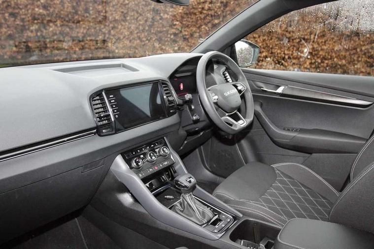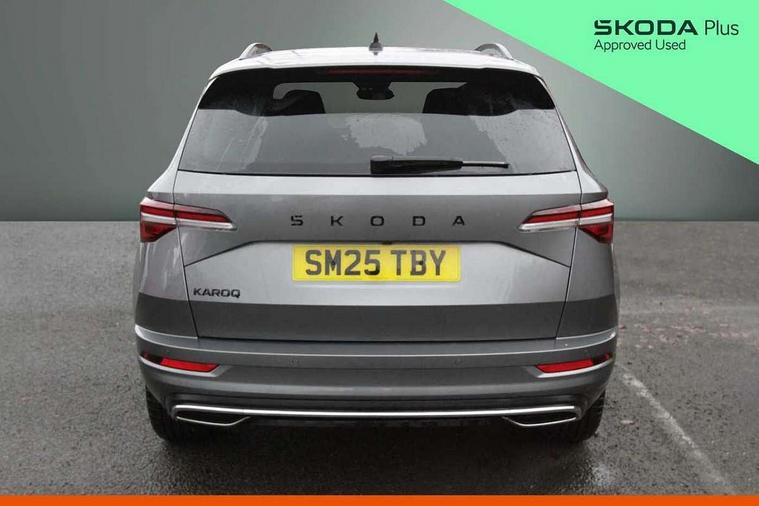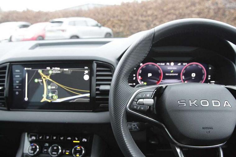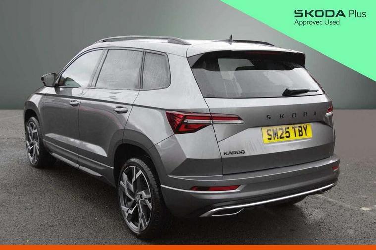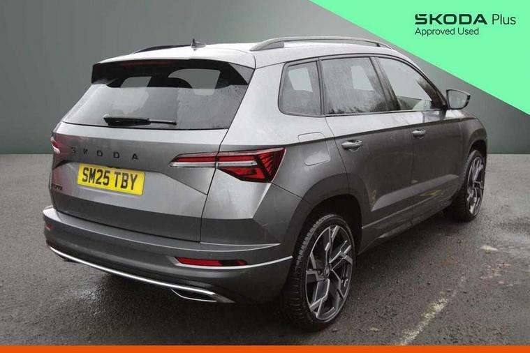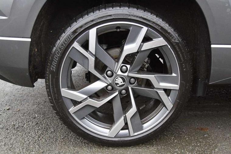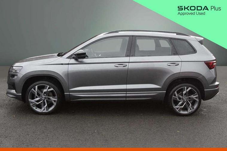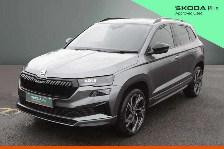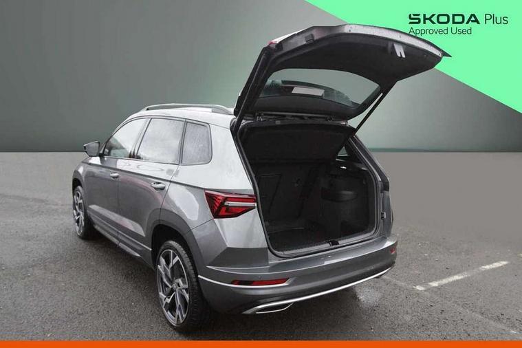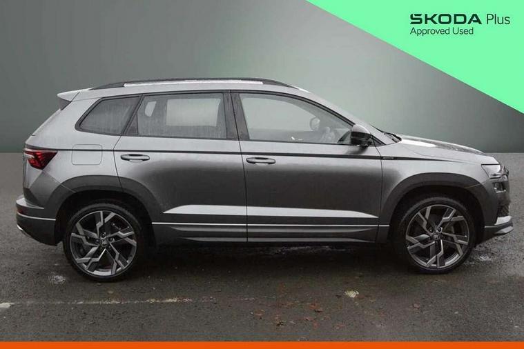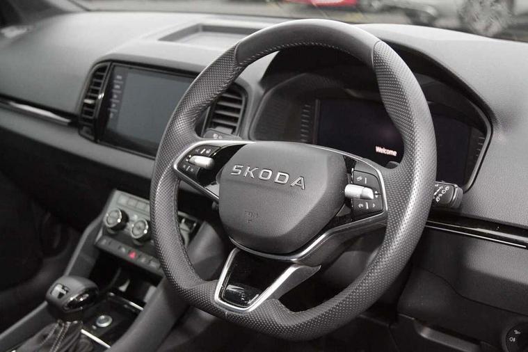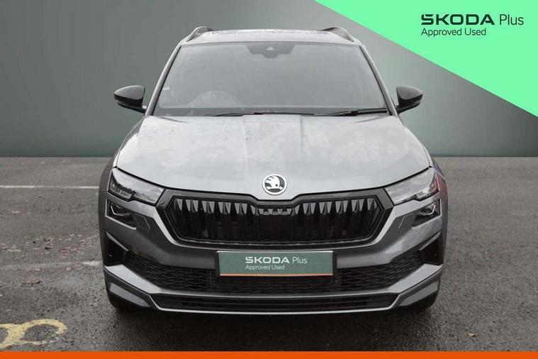 Advanced driver attention and drowsiness monitor, Emergency services call system, Outside temperature gauge, Sensor for driver assistance systems, Service interval indicator, SmartLink wireless for Apple and wired for Android, Start/stop system with regenerative braking, Traffic sign recognition, USB C Port x 2 in front centre console, Virtual Cockpit - 10.25" digital display, Virtual pedal with electrically operated boot door, Wireless smartphone charging, DAB radio with Bluetooth, USB connection, Acoustic glass, Aero front windscreen wipers with intermittent function, Auto dimming rear view mirror with light and rain sensors, Black door mirrors, Black electric window control buttons, Black radiator grille, Black roof rails, Body colour door handles, Electric front and rear windows with child proof lock, Extended rear roof spoiler, Front door steps with SportLine logo, Heated rear windscreen, LED daytime running lights, LED rear lights with high functionality welcome effect and dynamic indicators, Light assistant (coming/leaving home/tunnel light), Panoramic sliding sunroof, Plastic scuff plates in door apertures, Privacy glass, Protective door side sills in body colour, Rear diffuser, Rear side wing doors, Rear window wiper with washer system and intermittent control, Safety reflectors on front doors, Skoda lettering on tailgate in black, Sportline badge on front fender, Sports front and rear bumpers, Third brake light, Unique dark chrome design logo on alloy wheels, 1.5 litre bottle holders in driver and front passenger door panels, 12V socket in boot, 12v socket in front centre armrest with storage compartment and rear air vents, 2 x Tablet holder, 3 rear height adjustable headrests, 3 seat bench in 2nd row, 3 spoke sports leather heated multifunction steering wheel with DSG paddles, 4 foldable roof handles with rear coat hooks, Black floor carpet, Cargo elements in boot, Chrome inner door handles, Foldable hooks in the boot, Front head restraints, Height adjustable front three point seats belts with tensioners, Height/reach adjust steering wheel, Ice scraper, Illuminated glovebox, Illuminated luggage compartment, Isofix child seat preparation for front passenger seat, Isofix child seat preparation outer rear, Manual lumbar support for front seats, Pen holder, Pollen filter, Rear backrest release from boot, Rear boot cover, Rear package tray, Rear reading lights, Rear seats fixed folding and divided 60:40, Rubbish bin door, Safety vest holder, Single front passenger seat, Skoda lettering on steering wheel, Sportline decorative inserts, Storage box in upper central dashboard closed, Sunvisors with illuminated vanity mirrors, Textile floor mats, Ticket holder, Titan black interior ceiling, Umbrella under passenger seat, Under passenger seat storage compartment, Columbus pack - Karoq, LED Interior lighting pack with Skoda welcome logo - Karoq, Light Pack - Karoq, Non Smokers pack, Performance pack - Karoq, Winter plus pack with heated front and rear seats - Karoq, Automatic door unlocking in case of crash, Automatic fuel cut off in case of crash, Driver airbag, Electronic parking brake with auto hold function, Emergency rear braking signal, ESC (incl. ABS+MSR+ASR+EDS+HBA+DSR+RBS+MKB), Front side airbags, Head airbags, Hill hold control, Knee airbags, Passenger airbag with switch-off function, Pedestrian monitor, Seatbelt reminder signalisation and pretensioner for all seats, Three point seatbelts rear, Two tone horn, Tyre pressure monitor, Alarm with interior monitoring, back up horn and tilt sensor with safe function, Electronic engine immobiliser, Keyless entry and start/stop, Remote central locking with 2 remote folding keys, Black air vent surround, Black centre console, carbon door decor, Satin black dashboard, Satin black door trim, 19" Sagittarius anthracite alloy wheels, Anti-theft wheel bolts protection, Breakdown and tool kit,