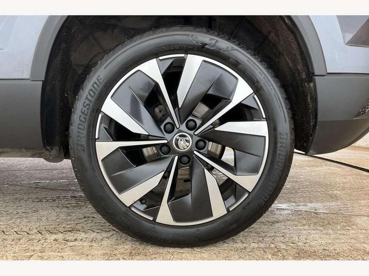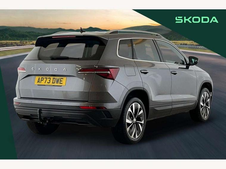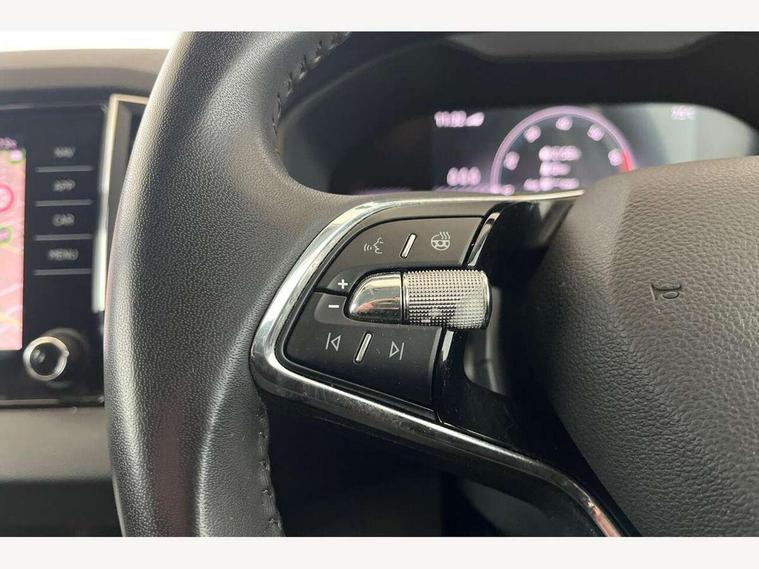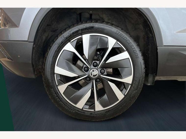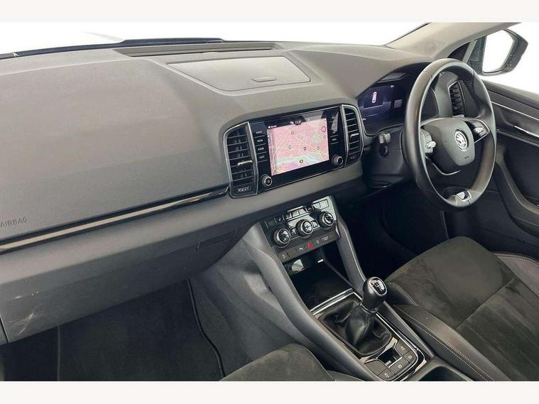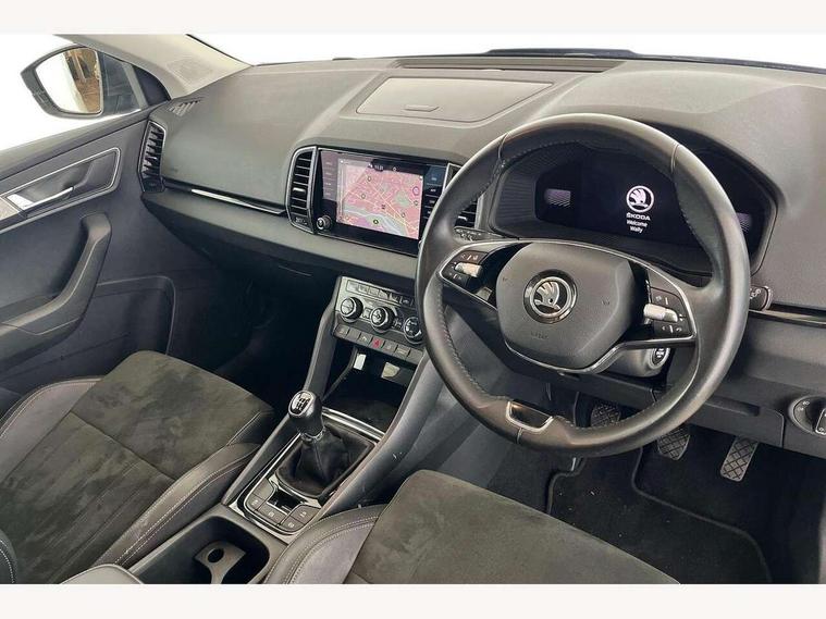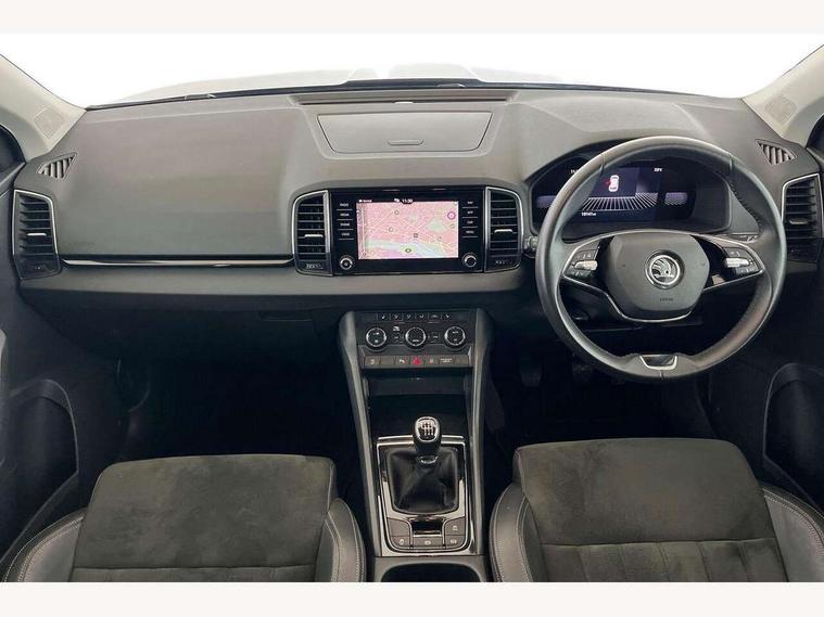 8" Digital display, Care connect, Driver fatigue sensor, Emergency services call system, Outside temperature gauge, Service interval indicator, SmartLink wireless for Apple and wired for Android, Start/stop system with regenerative braking, USB C Port x 2 in front centre console, 8 Speakers, DAB radio with Bluetooth, USB connection, Acoustic glass, Aero front windscreen wipers with intermittent function, Auto dimming rear view mirror with light and rain sensors, Black electric window control buttons, Body colour door mirrors and handles, Dynamic headlight range control with cornering light function, Electric front and rear windows with child proof lock, Heated rear windscreen, LED daytime running lights, LED rear lights with high functionality welcome effect and dynamic indicators, Light assistant (coming/leaving home/tunnel light), Plastic scuff plates, Privacy glass, Rear side wing doors, Rear spoiler, Rear window wiper with washer system and intermittent control, Safety reflectors on front doors, 1.5 litre bottle holders in driver and front passenger door panels, 12V socket in boot, 12v socket in front centre armrest with storage compartment and rear air vents, 2 spoke leather heated multifunction steering wheel, 2 x Tablet holder, 3 rear height adjustable headrests, 3 seat bench in 2nd row, 4 foldable roof handles with rear coat hooks, Black floor carpet, Chrome inner door handles, Double sided boot floor, Foldable hooks in the boot, Front head restraints, Height adjustable front three point seats belts with tensioners, Height/reach adjust steering wheel, Ice scraper, Illuminated glovebox, Illuminated luggage compartment, Isofix child seat preparation for front passenger seat, Isofix child seat preparation outer rear, Manual lumbar support for front seats, Pen holder, Pollen filter, Rear boot cover, Rear reading lights, Rubbish bin door, Safety vest holder, Single front passenger seat, Storage box in upper central dashboard closed, Sunvisors with illuminated vanity mirrors, Textile floor mats, Ticket holder, VarioFlex seats with standard rear seat release, Boot pack - Karoq, Design Pack - Karoq, Parking pack - Karoq, Automatic door unlocking in case of crash, Automatic fuel cut off in case of crash, Child locks on rear doors, Driver airbag, Electronic parking brake with auto hold function, Emergency rear braking signal, ESC including ABS, MSR, ASR, EDS, HBA, DSR, RBS, MKB and traction control, Front side airbags, Hill hold control, Knee airbags, Passenger airbag with switch-off function, Pedestrian monitor, Seatbelt reminder signalisation and pretensioner for all seats, Three point seatbelts rear, Two tone horn, Tyre pressure display, Tyre pressure monitor, Alarm with interior monitoring, back up horn and tilt sensor with safe function, Electronic engine immobiliser, Keyless entry and start/stop, Remote central locking with 2 remote folding keys, Chrome framed air vents, 18" Miran alloy wheels in black, Anti-theft wheel bolts protection, Tool kit,