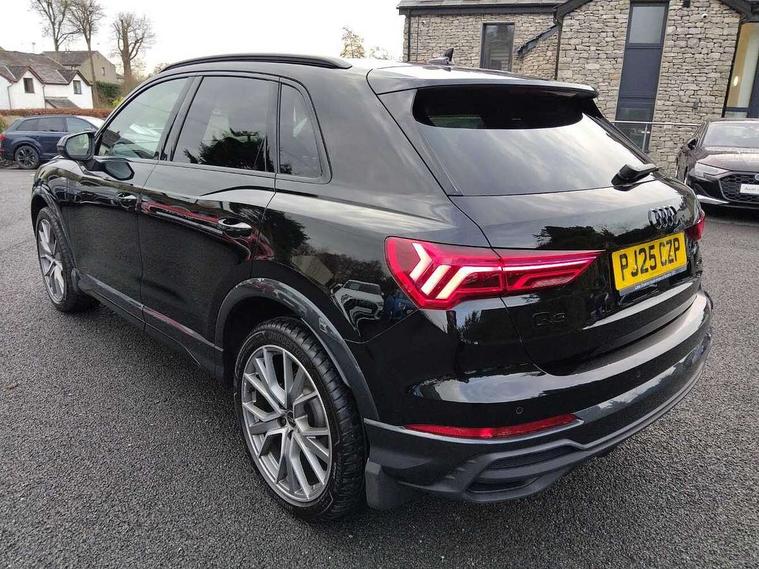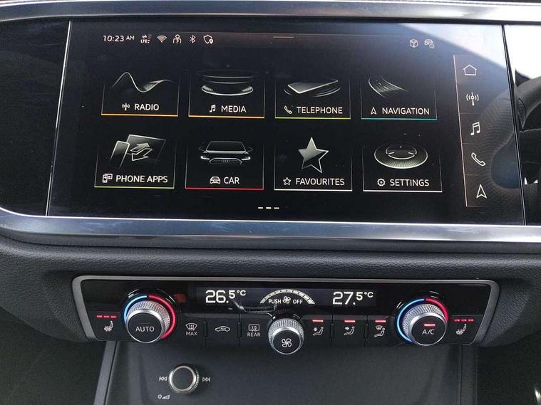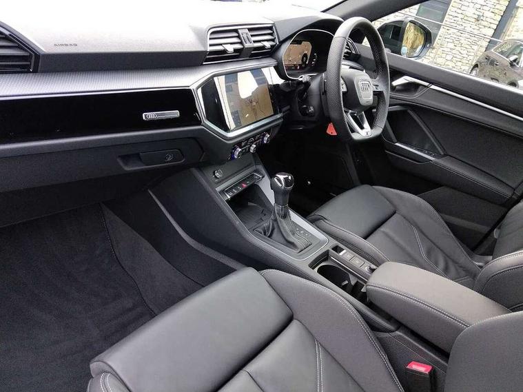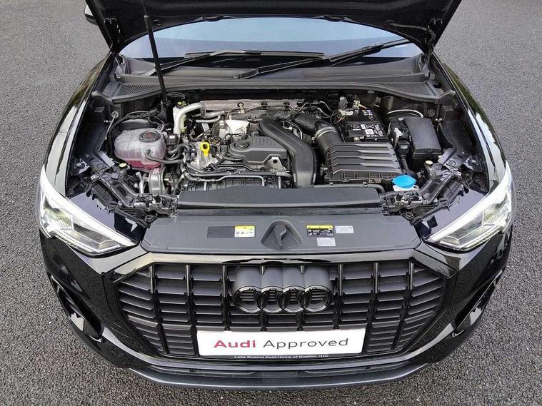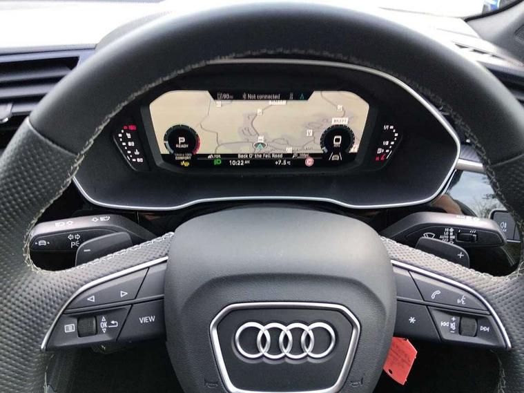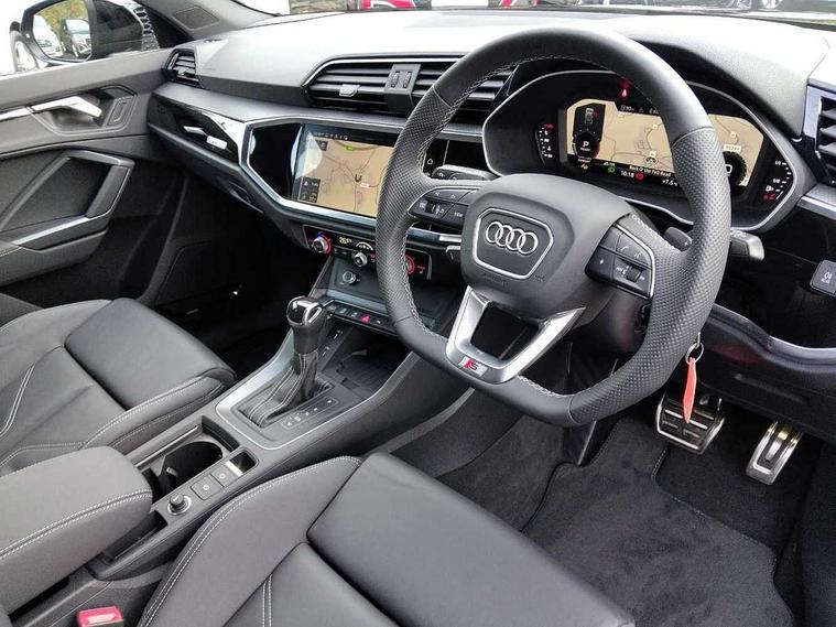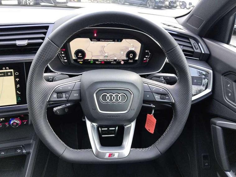 Amazon alexa Integration, Audi connect safety and service, Audi drive select, Audi lane departure warning, Audi Virtual Cockpit - 10.25" display, Bluetooth interface, Camera based traffic sign recognition, Distraction and Fatigue warning, Legal emergency call, MMI Navigation Plus with high resolution 10.1 inch touchscreen colour display, Power operated tailgate, Progressive steering, Service interval indicator, Smartphone interface includes wireless Apple carplay/Android Auto, Start stop system with recuperation, Voice control system with natural language interaction, Sports suspension, 2 USB-C ports with charge and data functions, 6 passive loudspeakers, DAB digital radio module, Acoustic windscreen, Audi Beam uses LEDs to project the Audi logo onto the ground as you exit your Q3, Auto dimming door mirrors, Auto dimming frameless rear view mirror, Black roof rails, Electrically folding, adjustable and heated door mirrors with integrated LED side indicators and kerb view function for passenger side, Front and rear electric windows, Front fog lights, Grille vertical bars in aluminium silver/Matt, High gloss black finish B and C pillars, LED Dynamic rear indicators, LED headlights with LED daytime running lights, LED rear lights, LED third brake light, Privacy glass dark tinted rear and rear-side windows (from B-pillar backwards), Rain and light sensors, Rear diffuser grille in grained matt black, Rear diffuser strip in matt anthracite black, Rear side wing doors, Rear wiper, S line bumpers in contrasting Manhattan grey, Variable front intermittent wipers, 12V socket in rear centre console, 3 seat bench in 2nd row, 40:20:40 folding with manual adjustment for 60:40 forwards/backwards position and backrest angle, Adjustable rear seat bench/backrest with centre armrest and cupholder, Black cloth headlining, Dual zone electronic climate control, Electric lumbar support, Front and rear black floor mats with contrast stitching in rock grey, Front and rear headrests, Front centre armrest, Height and reach adjustable steering wheel, Illuminated door sill trims with S logo, ISOFIX child seat mounting for front passenger with airbag deactivation and outer rear seat including top tether attachment point for outer rear seats, Manual front seats with height adjustment, Perforated leather gearknob, Single front passenger seat, Stainless steel luggage compartment sill finisher, Stainless steel pedals, Twin leather upholstery with front sport seats + S embossing, Black styling pack - Q3, Non smoking pack - Q3, 3x3 point rear seatbelts, 6 airbags - Driver, front passenger, curtain and side windows, Audi pre-sense front with pedestrain and cyclist recognition, Electrically operated child locks on rear doors, Electromechanical parking brake, Electronic stabilisation control including ABS, ASR and EDL, Front seatbelt reminder, Hill descent control, Hill hold assist, Pre sense basic, Seatbelt monitoring, Tyre pressure warning, Warning triangle and first aid kit, Anti theft wheel bolts, Immobiliser, Remote central locking, Thatcham approved category 1 anti theft alarm, Aluminium look interior elements, Detail dashboard around MMI touch colour display in glass look, black with surround in aluminium look, Leatherette door armrest, Piano black inlay,